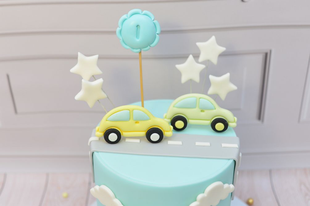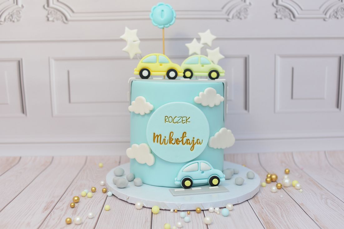 Pastelowa atrapa tortu z motywem autek – idealna ekspozycja tortu na roczek i urodziny małego fana motoryzacji.