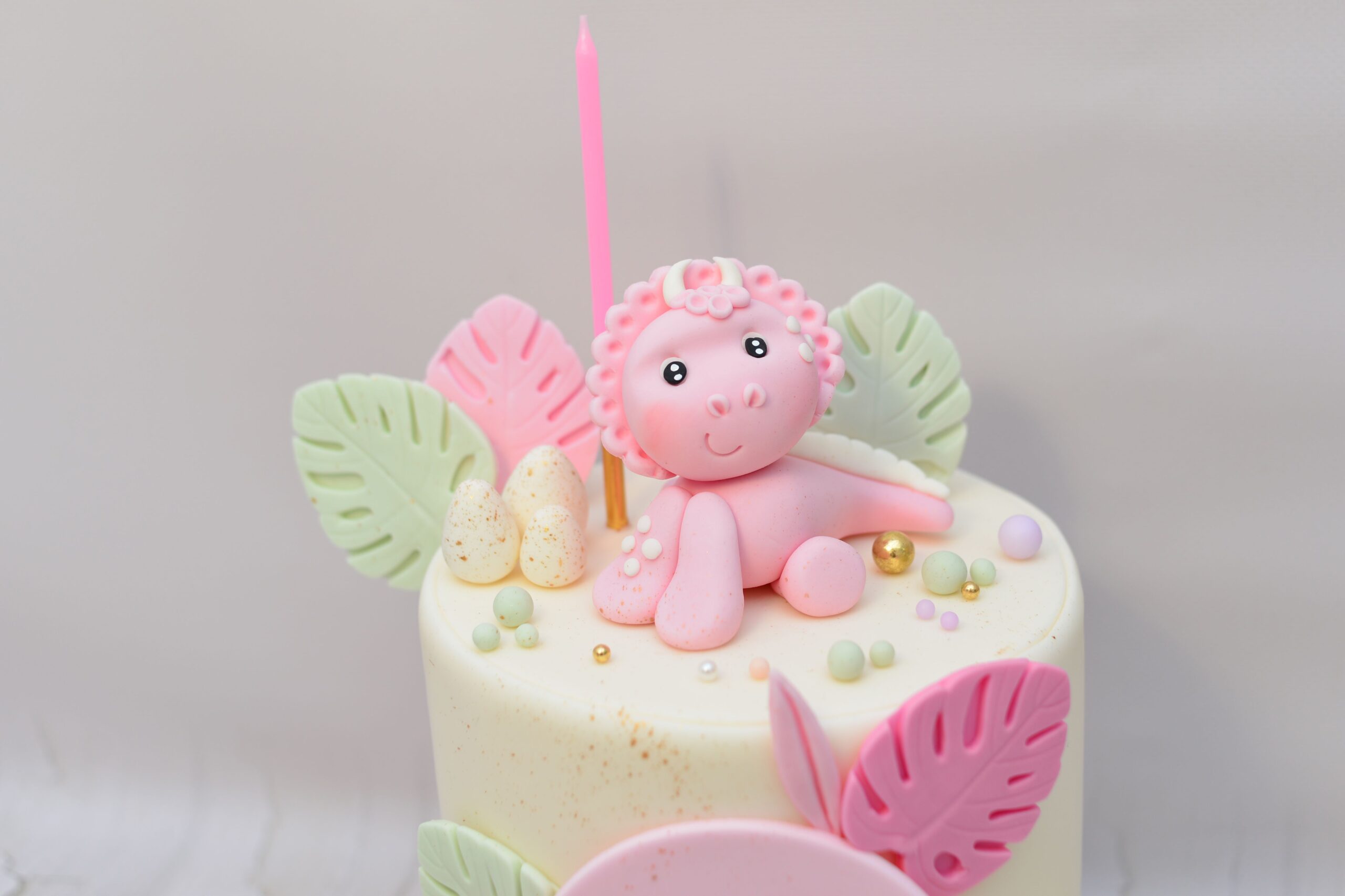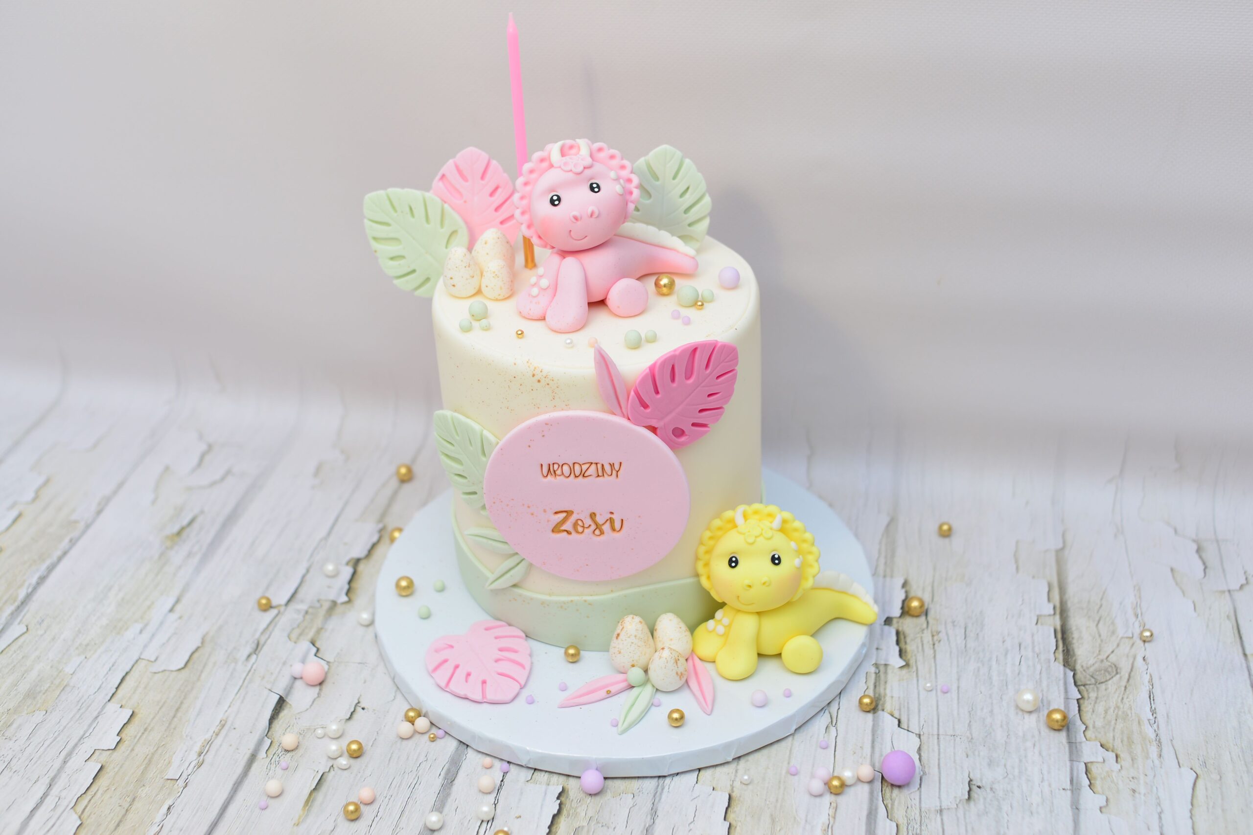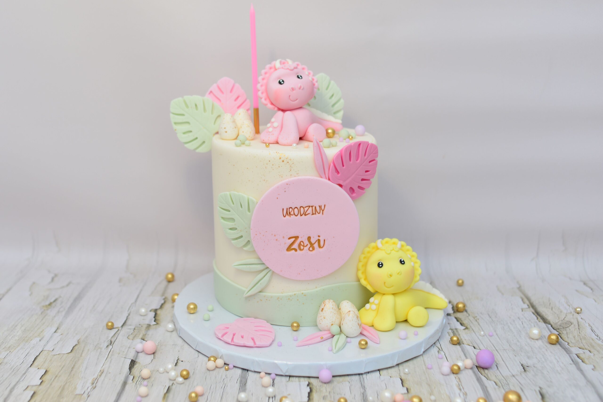 Model utrzymany w pastelowych odcieniach różu, mięty i delikatnej zieleni. Kompozycję tworzą przestrzenne figurki dinozaurów 3D, tropikalne liście w dwóch kolorach, dekoracyjne jajeczka oraz personalizowana tabliczka z imieniem. Całość buduje lekką, bajkową scenkę o subtelnym, dziewczęcym charakterze.