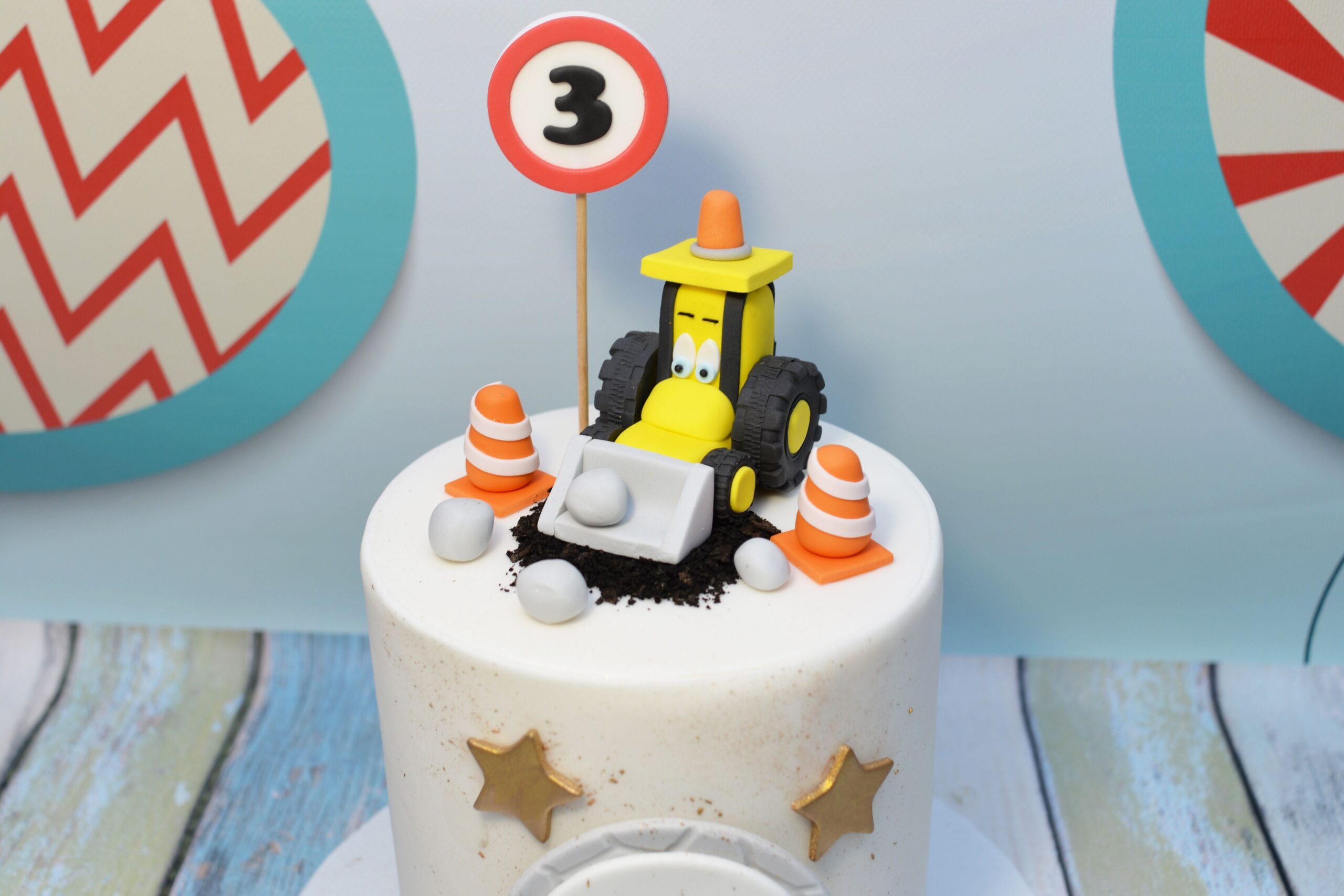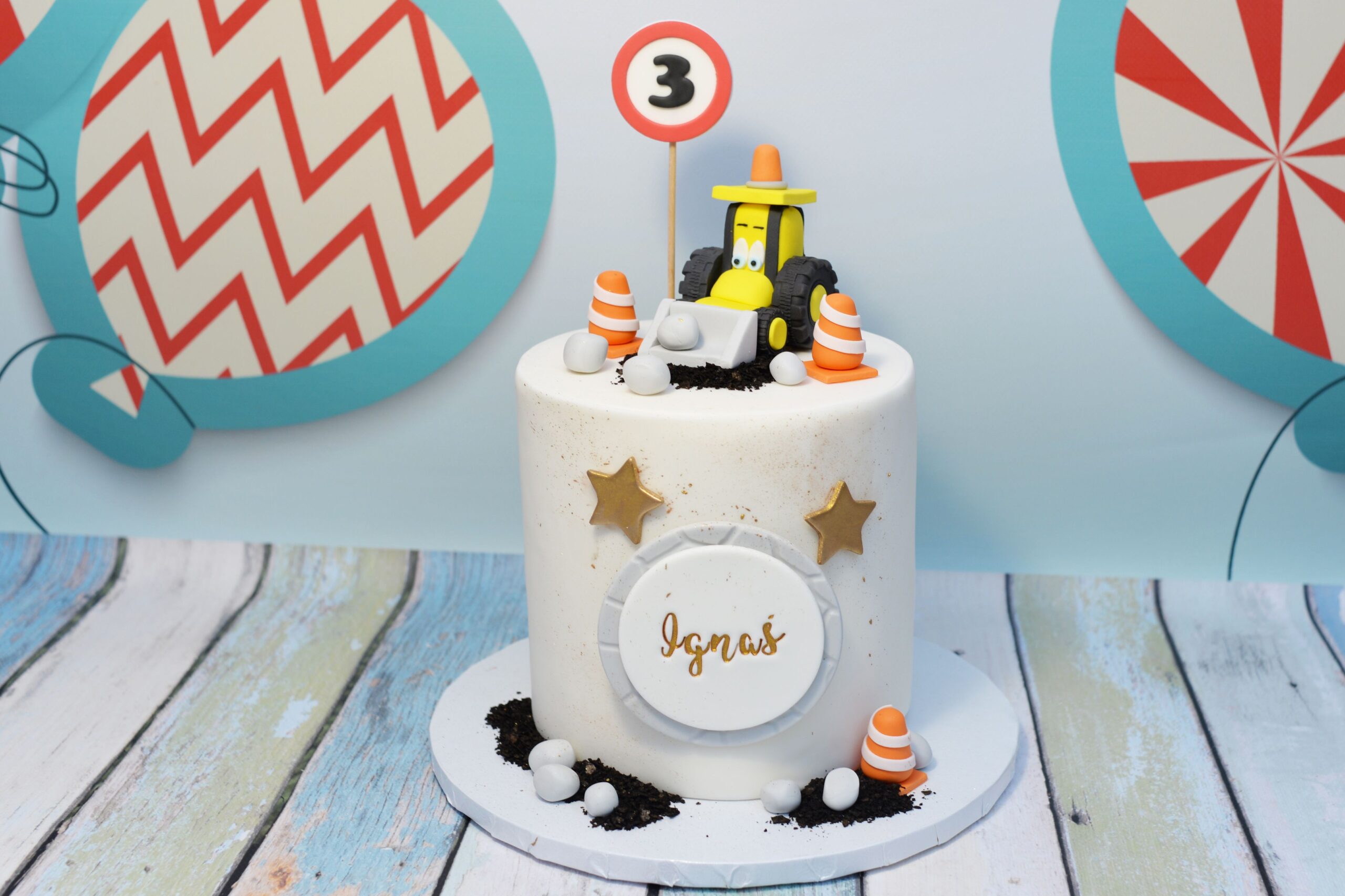 Atrapa tortu z motywem budowy – idealna ekspozycja tortu na urodziny małego fana koparek i maszyn budowlanych.