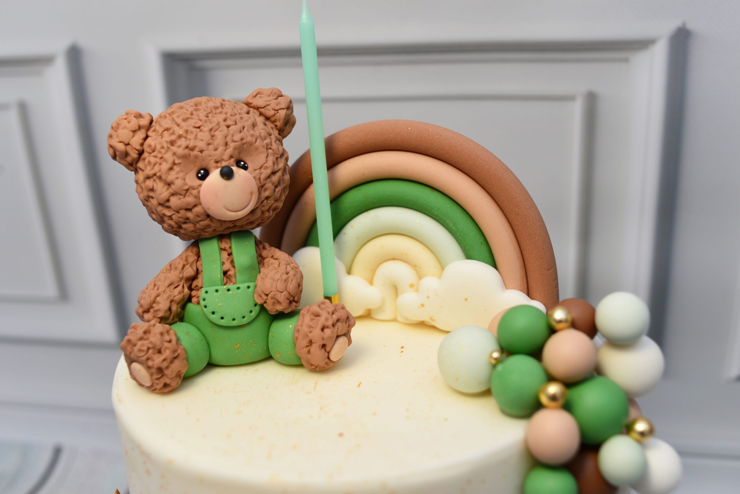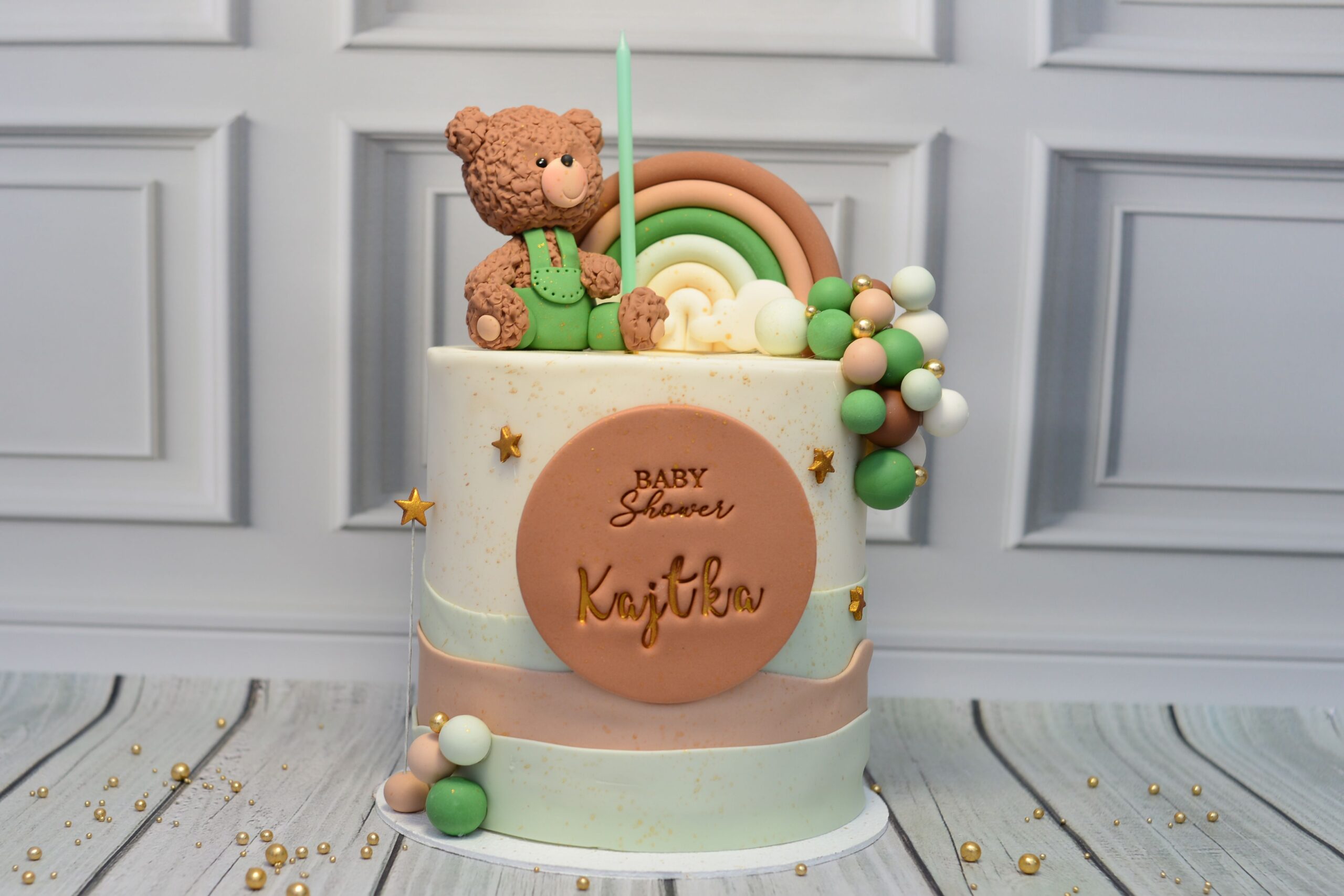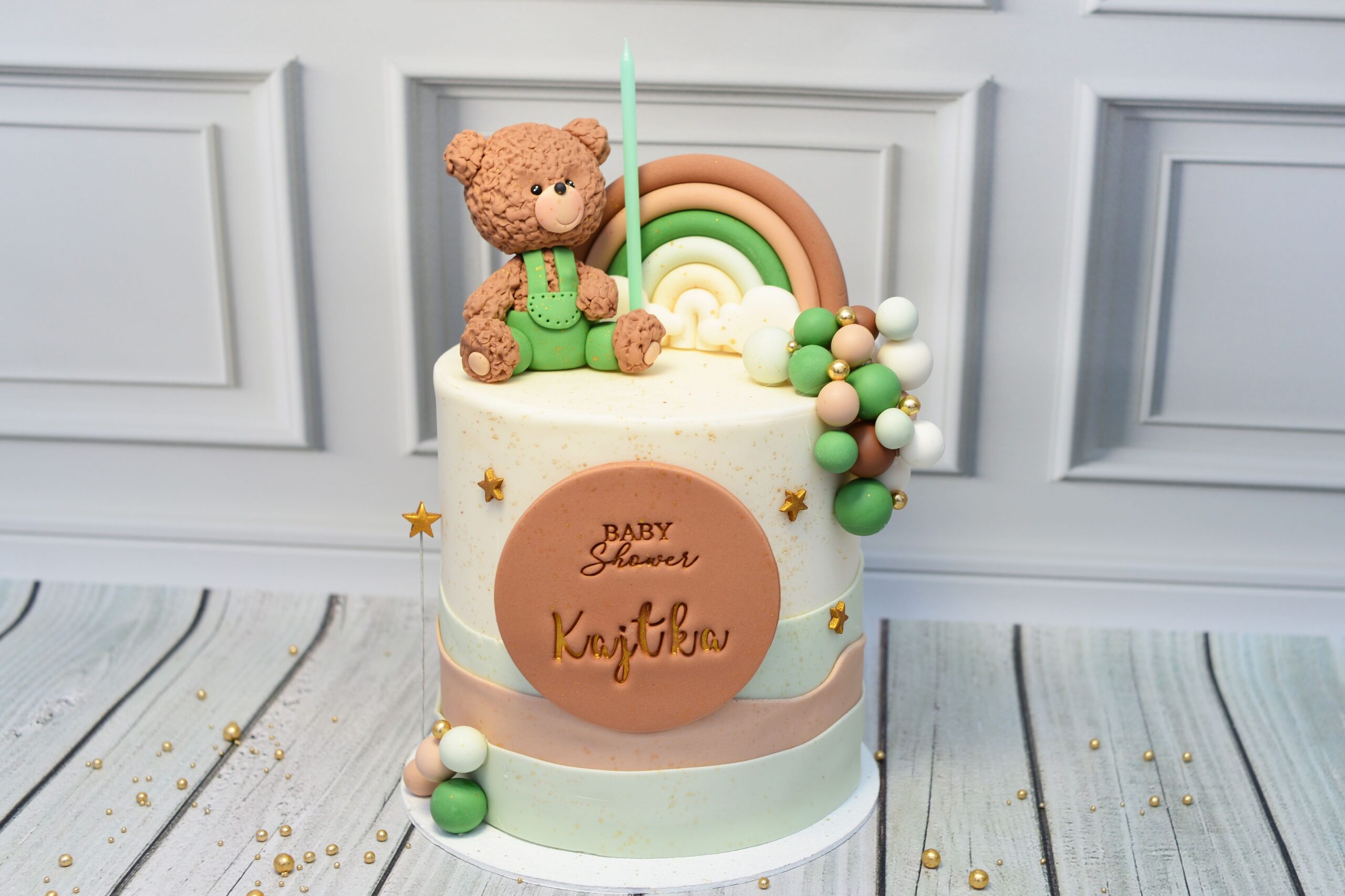 Model utrzymany w harmonijnych odcieniach zieleni, beżu i brązu. Kompozycję tworzy przestrzenna figurka pluszowego misia 3D, dekoracyjna tęcza, personalizowana tabliczka oraz zestaw kulek i złotych gwiazdek – zarówno drobnych aplikacji, jak i delikatnych elementów na druciku, które nadają projektowi lekkości i subtelnego blasku.