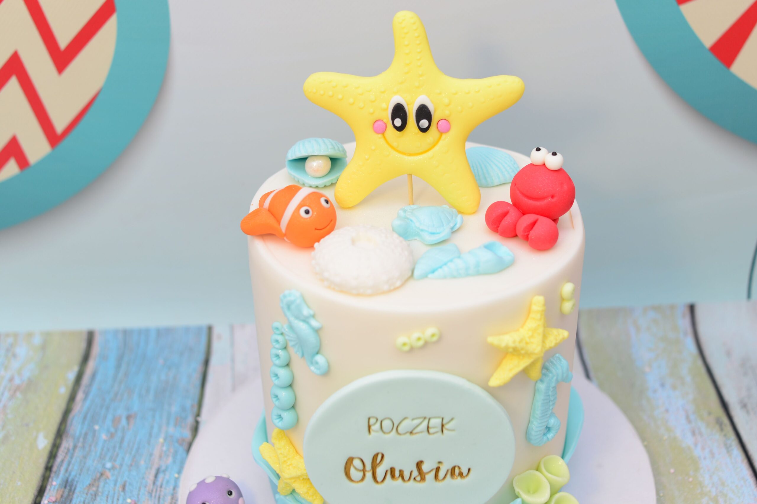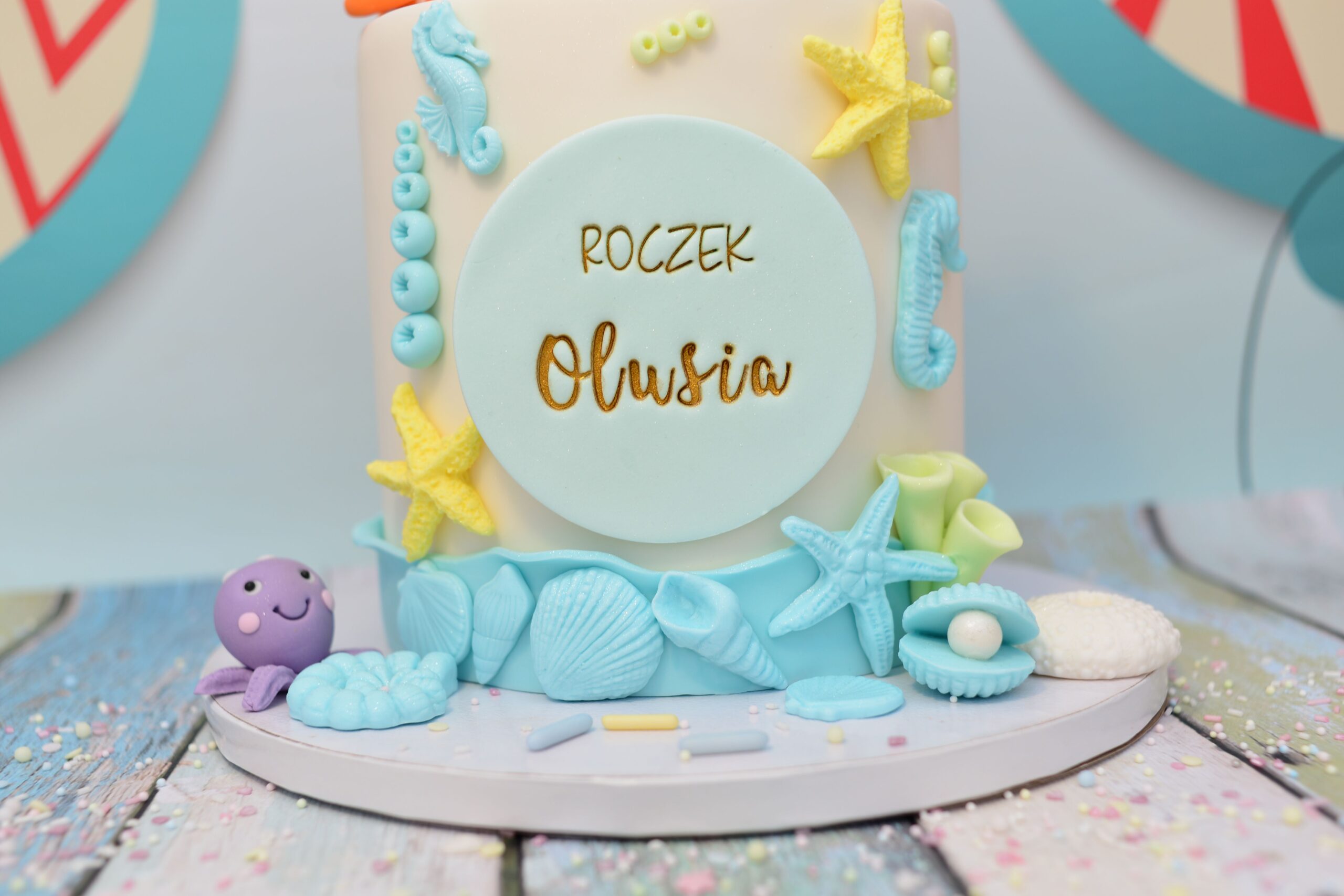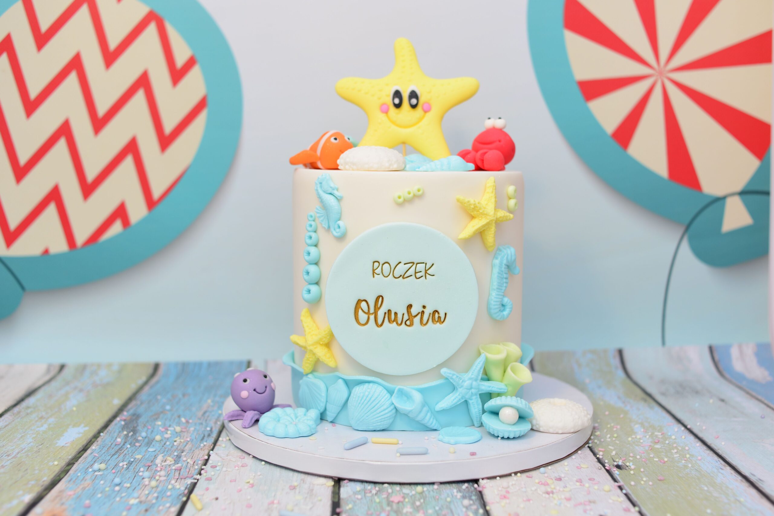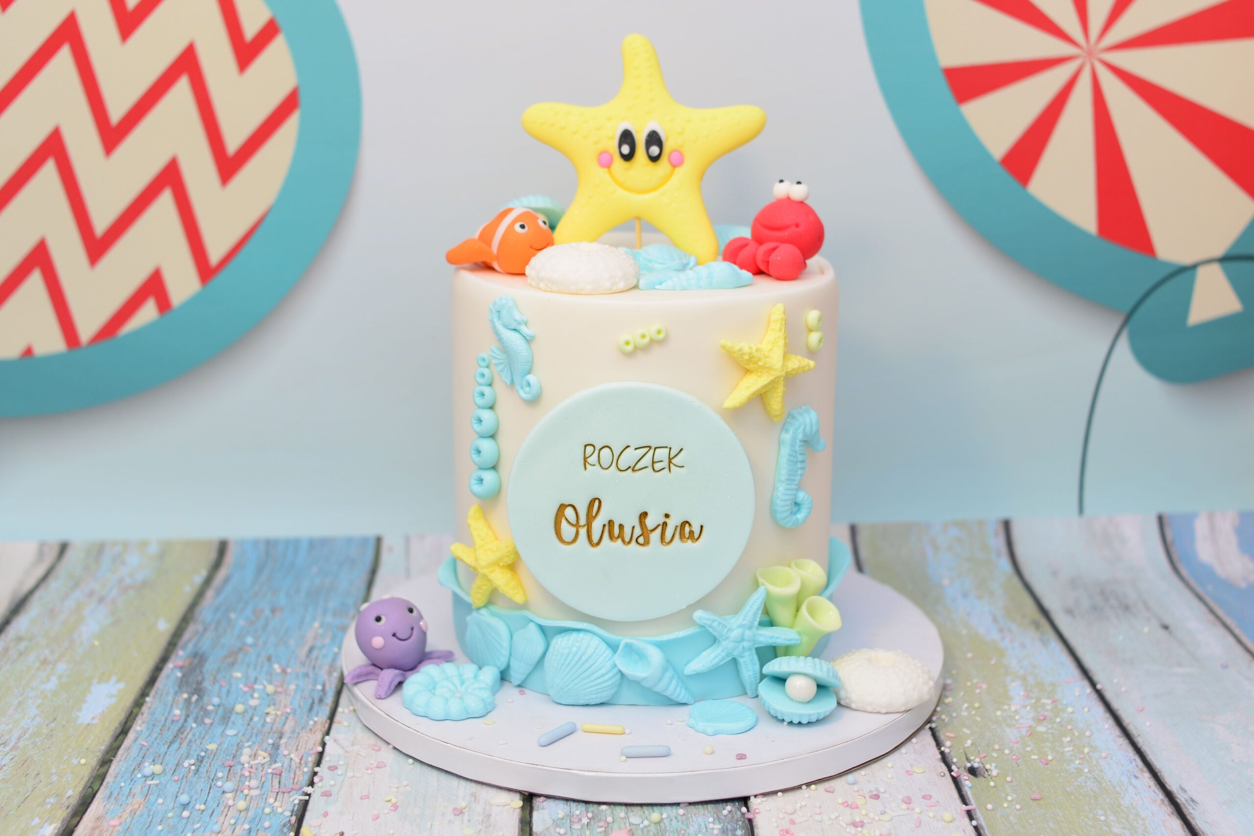 Atrapa tortu z motywem morskiej krainy – idealna ekspozycja tortu na roczek lub urodziny w klimacie oceanu.