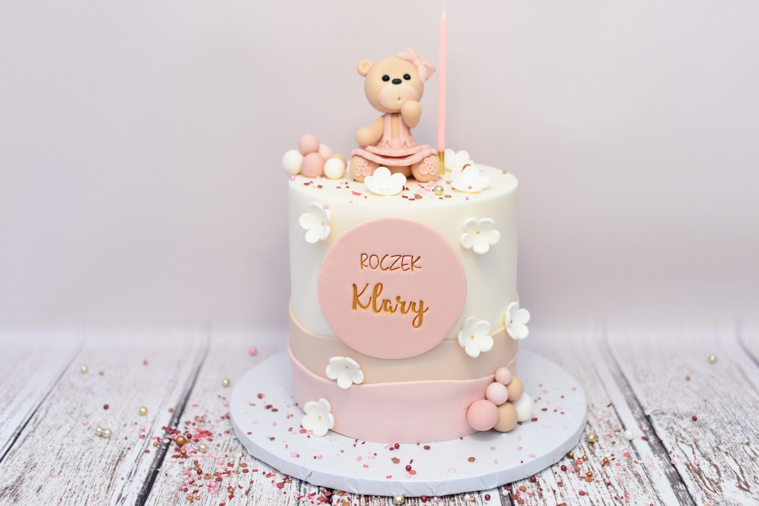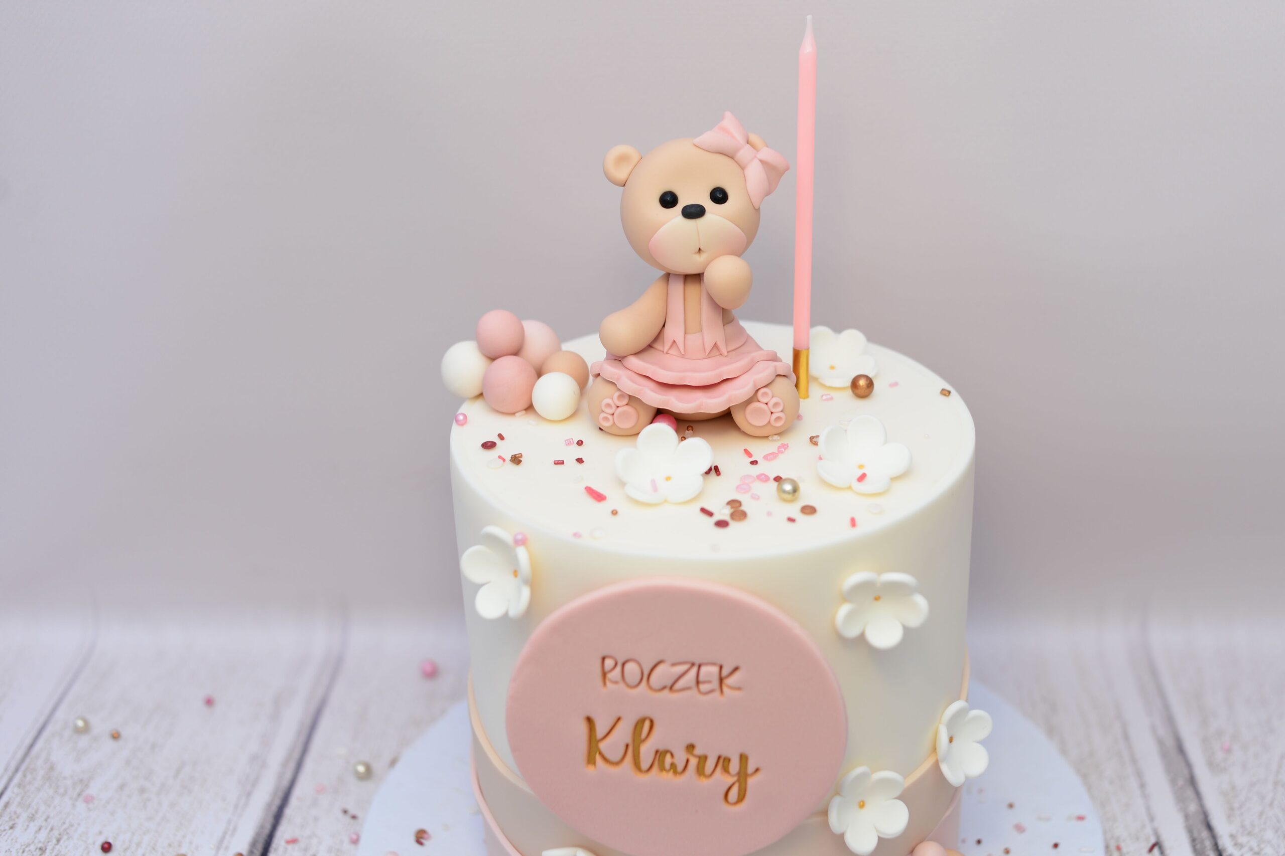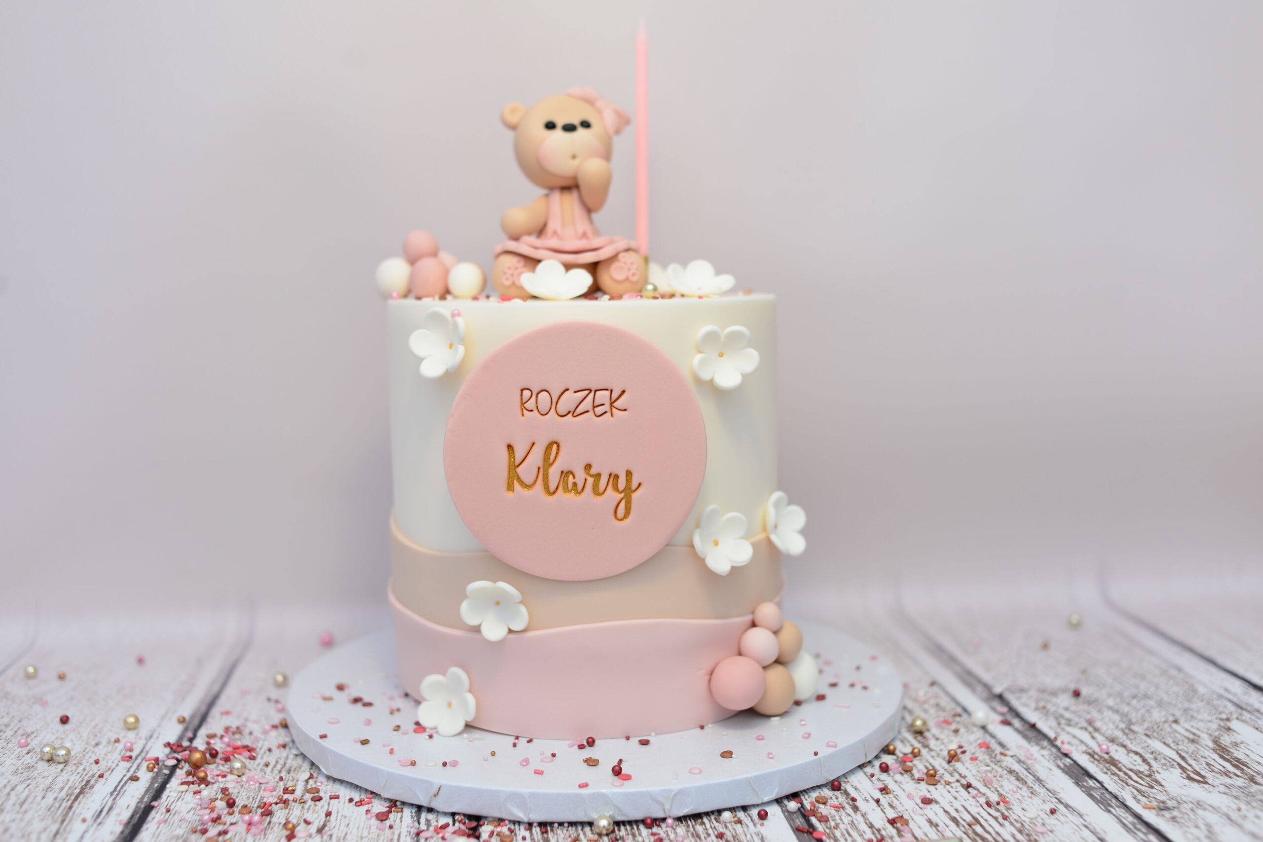 Model utrzymany w odcieniach bladego różu, beżu i bieli. Kompozycję tworzy przestrzenna figurka misia w sukience, subtelne kuleczki oraz dekoracyjne białe kwiatuszki ze złotą perełką. Całość buduje lekki, elegancki projekt o romantycznym charakterze.