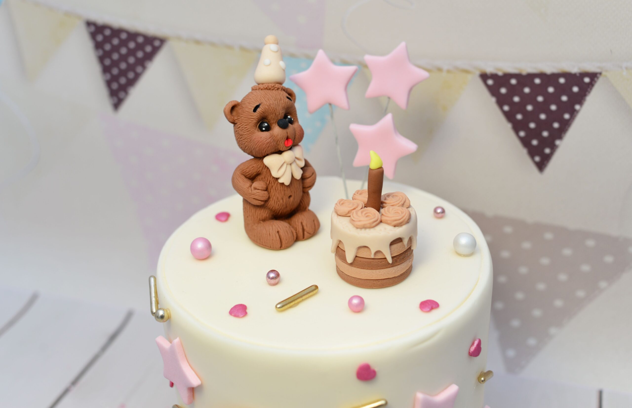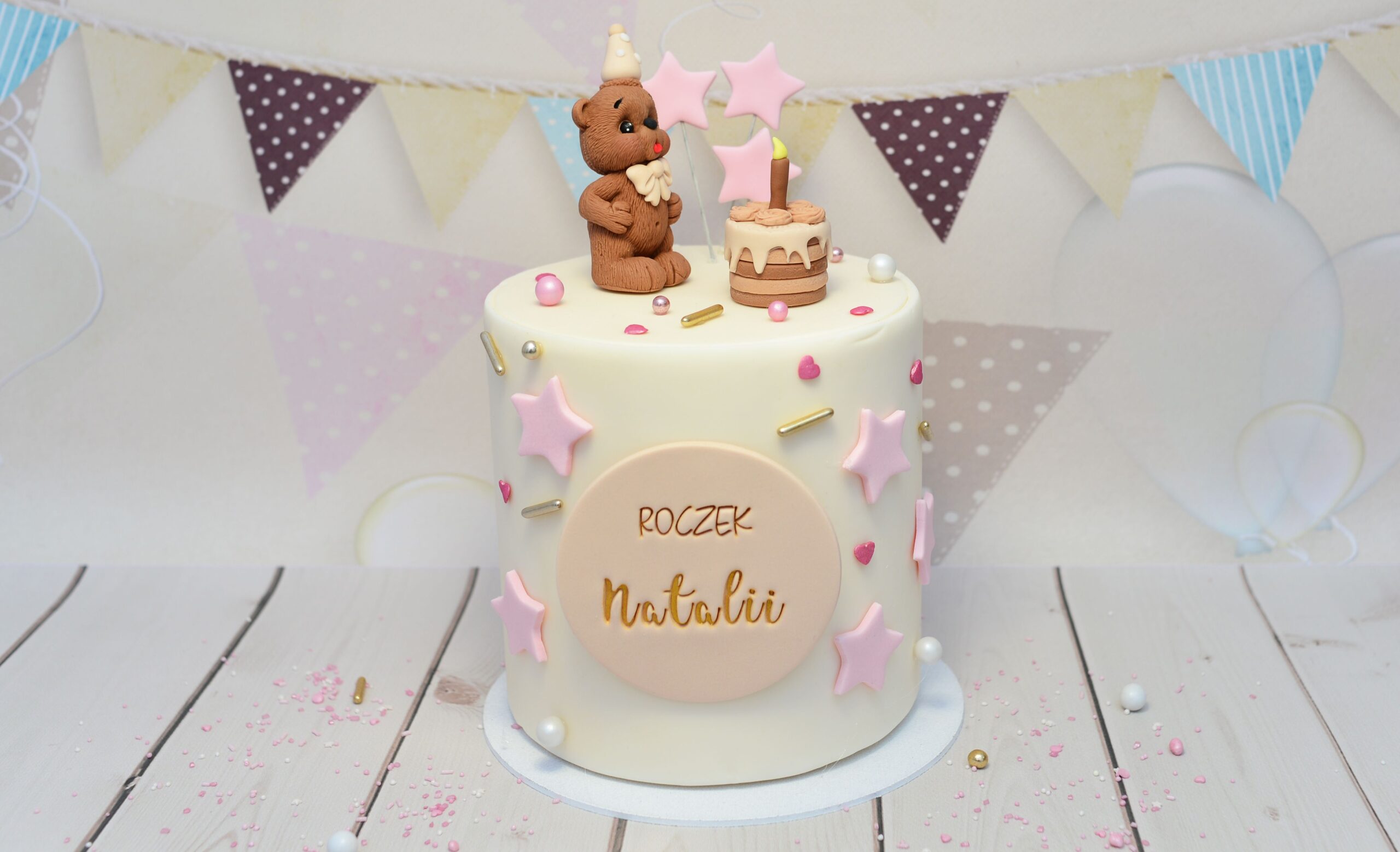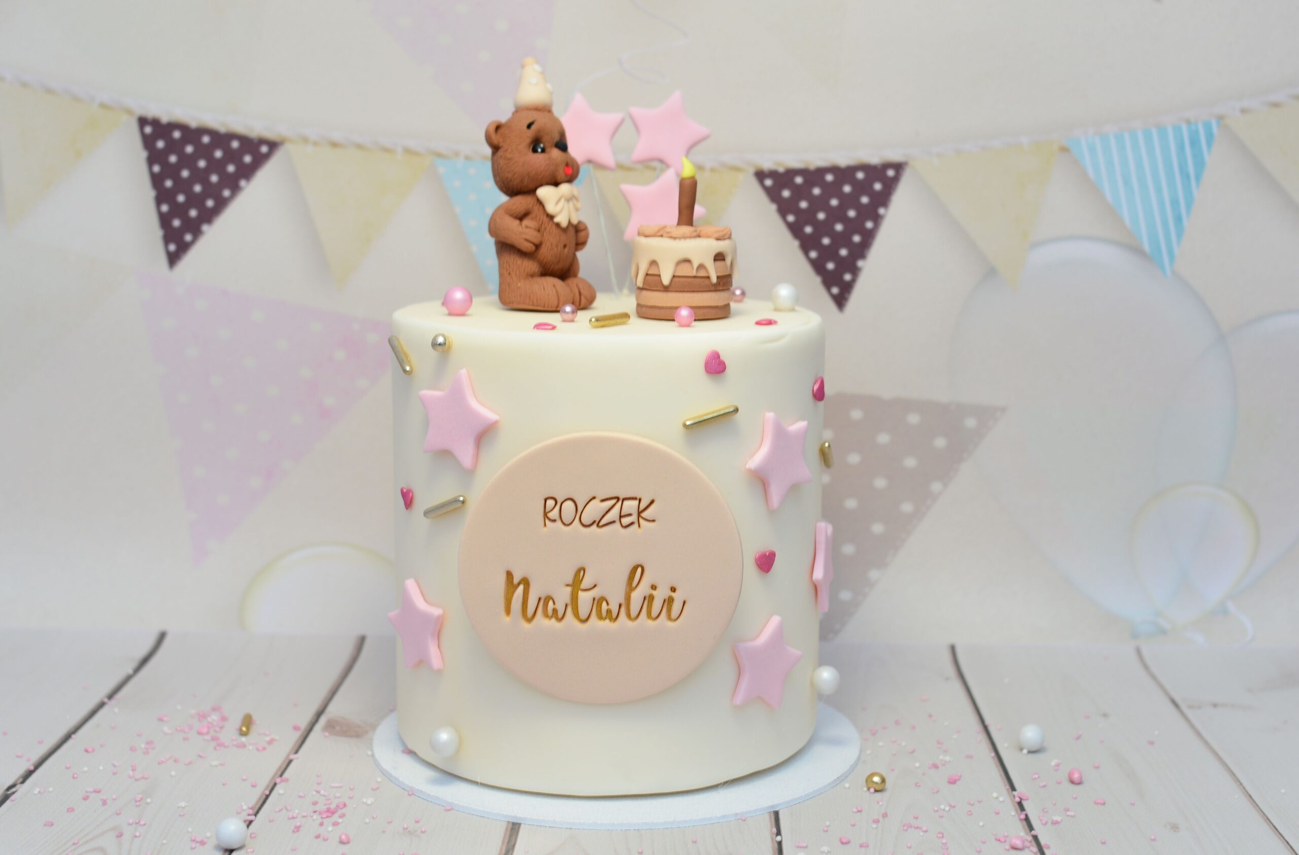 Pastelowa atrapa tortu z misiem Gustawem – idealna ekspozycja na roczek dziewczynki.