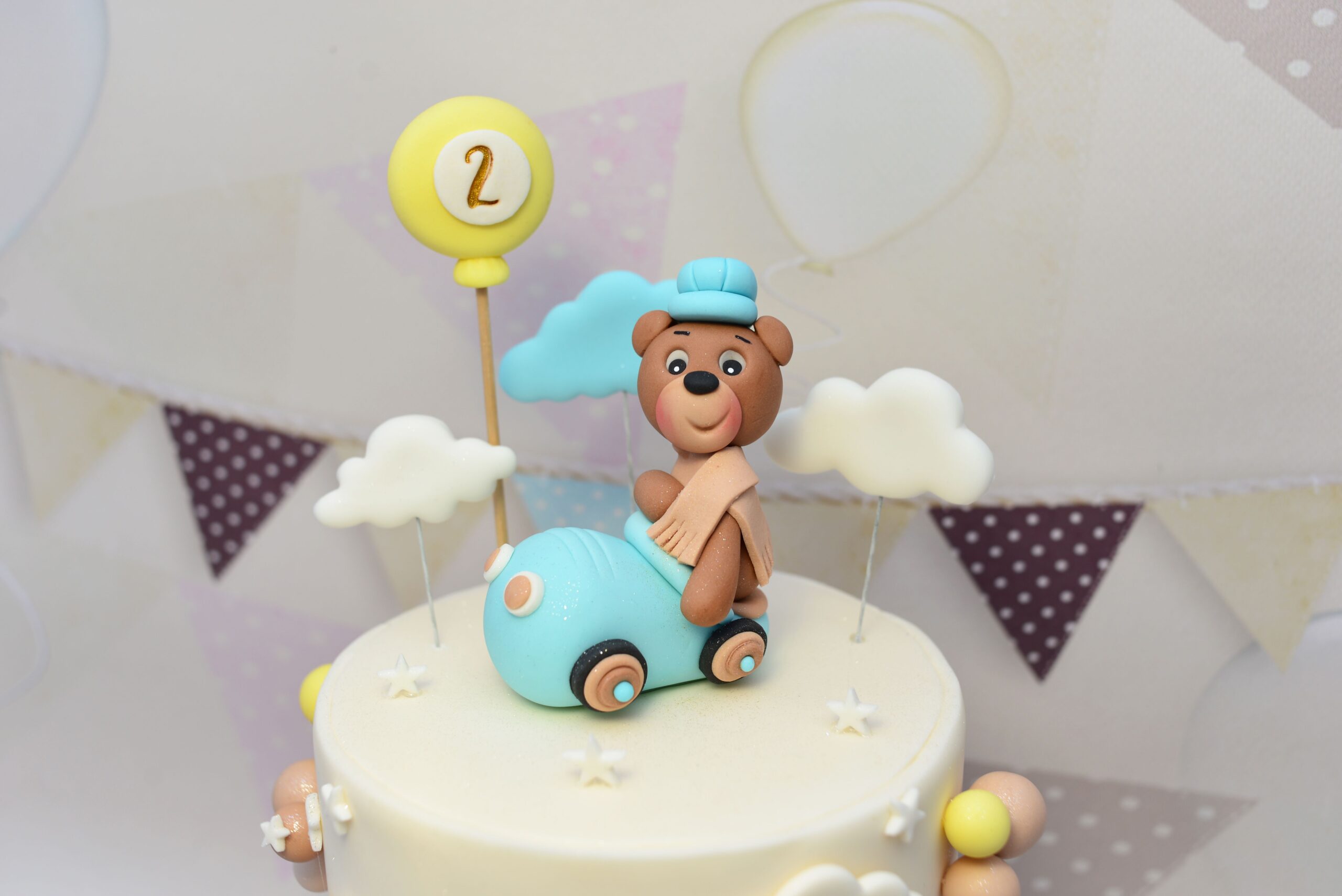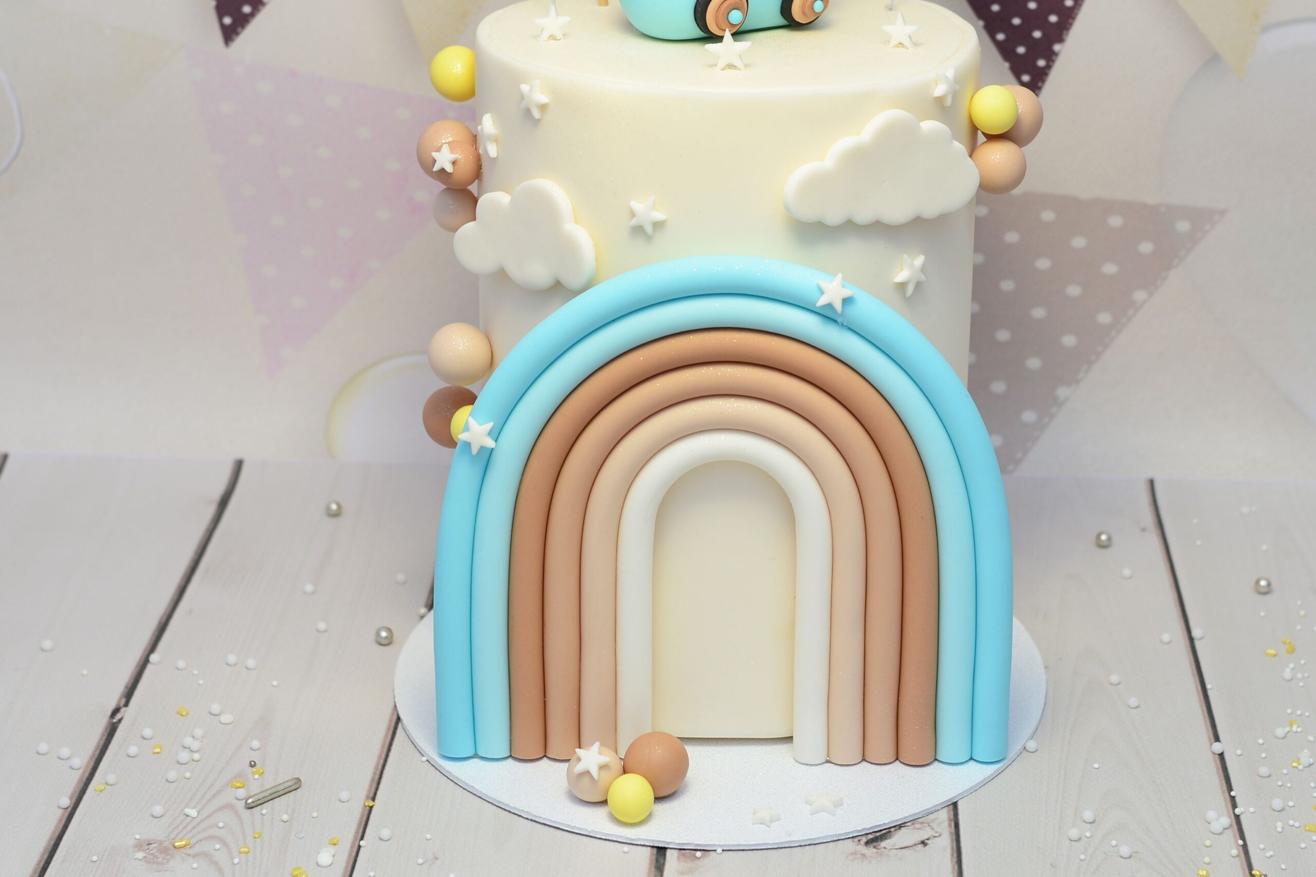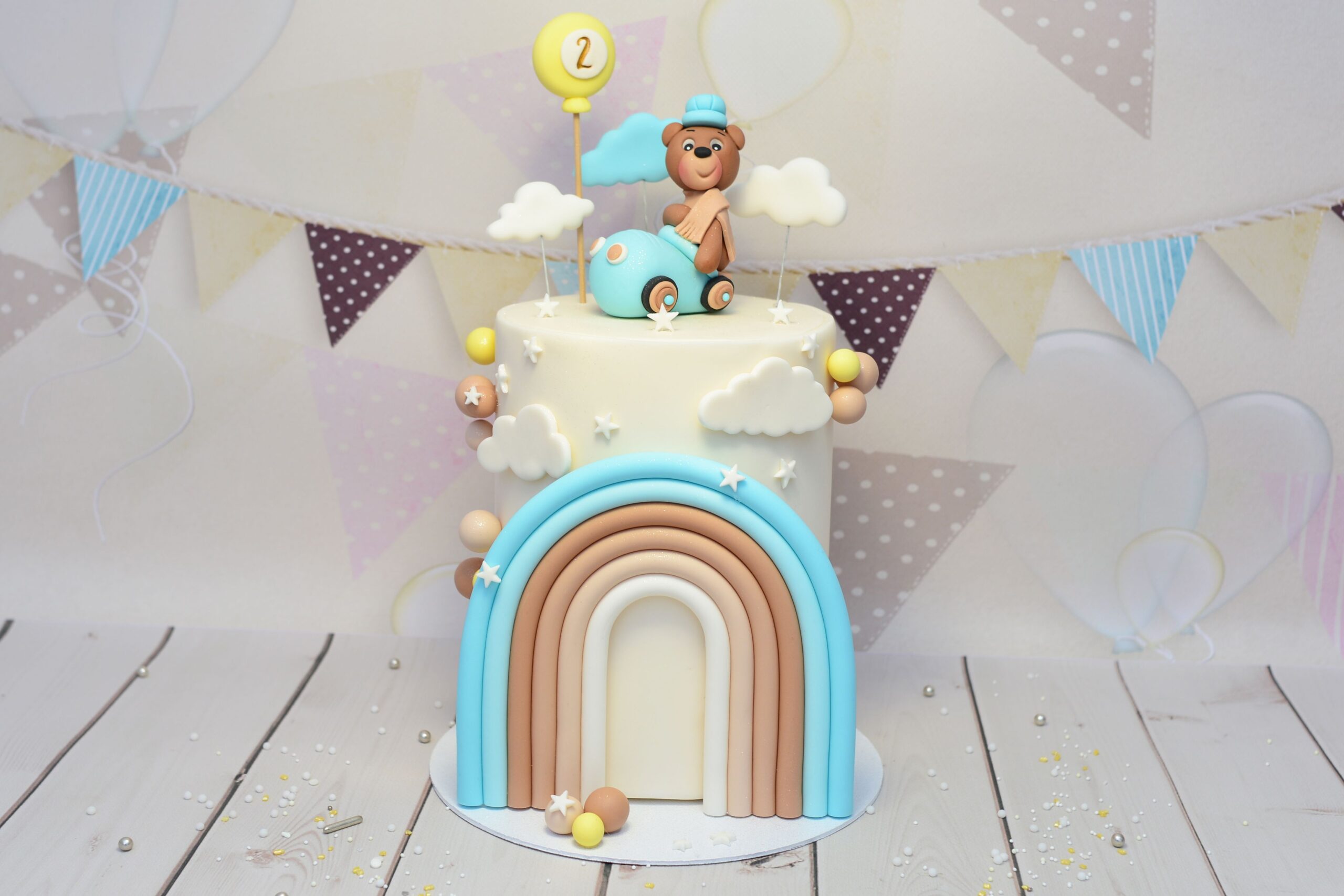 Pastelowa atrapa tortu z misiem w retro autku i dużą tęczą – idealna ekspozycja na roczek lub drugie urodziny chłopca.