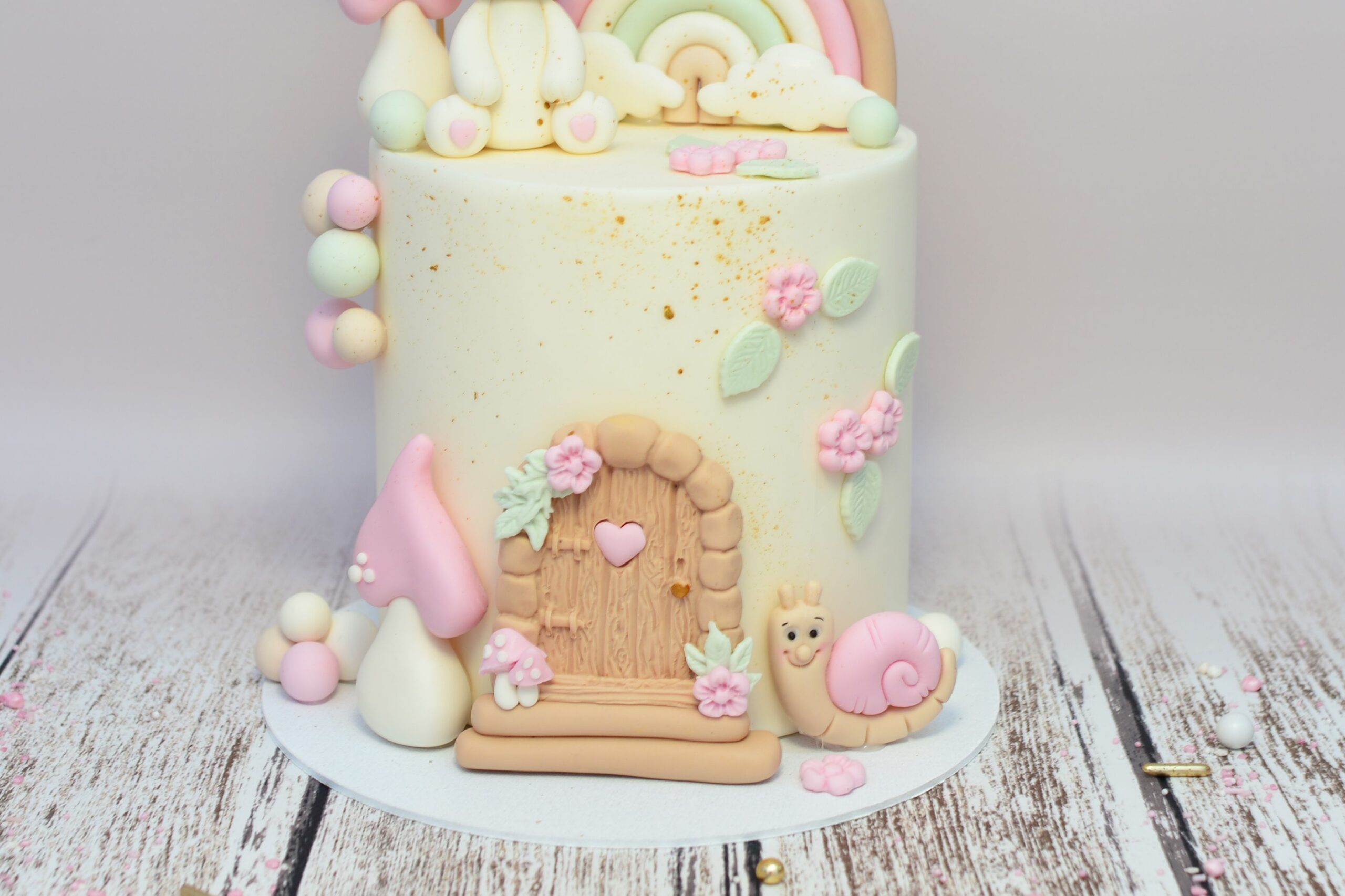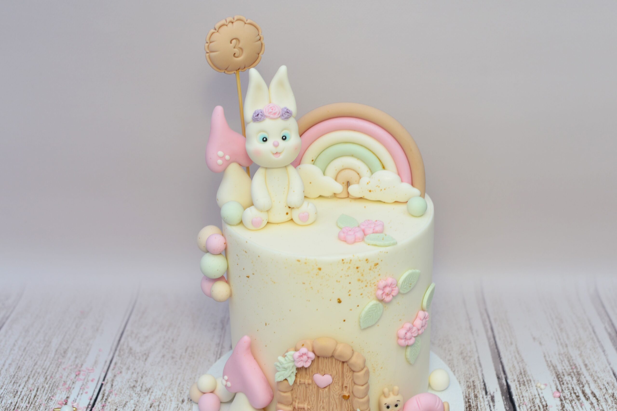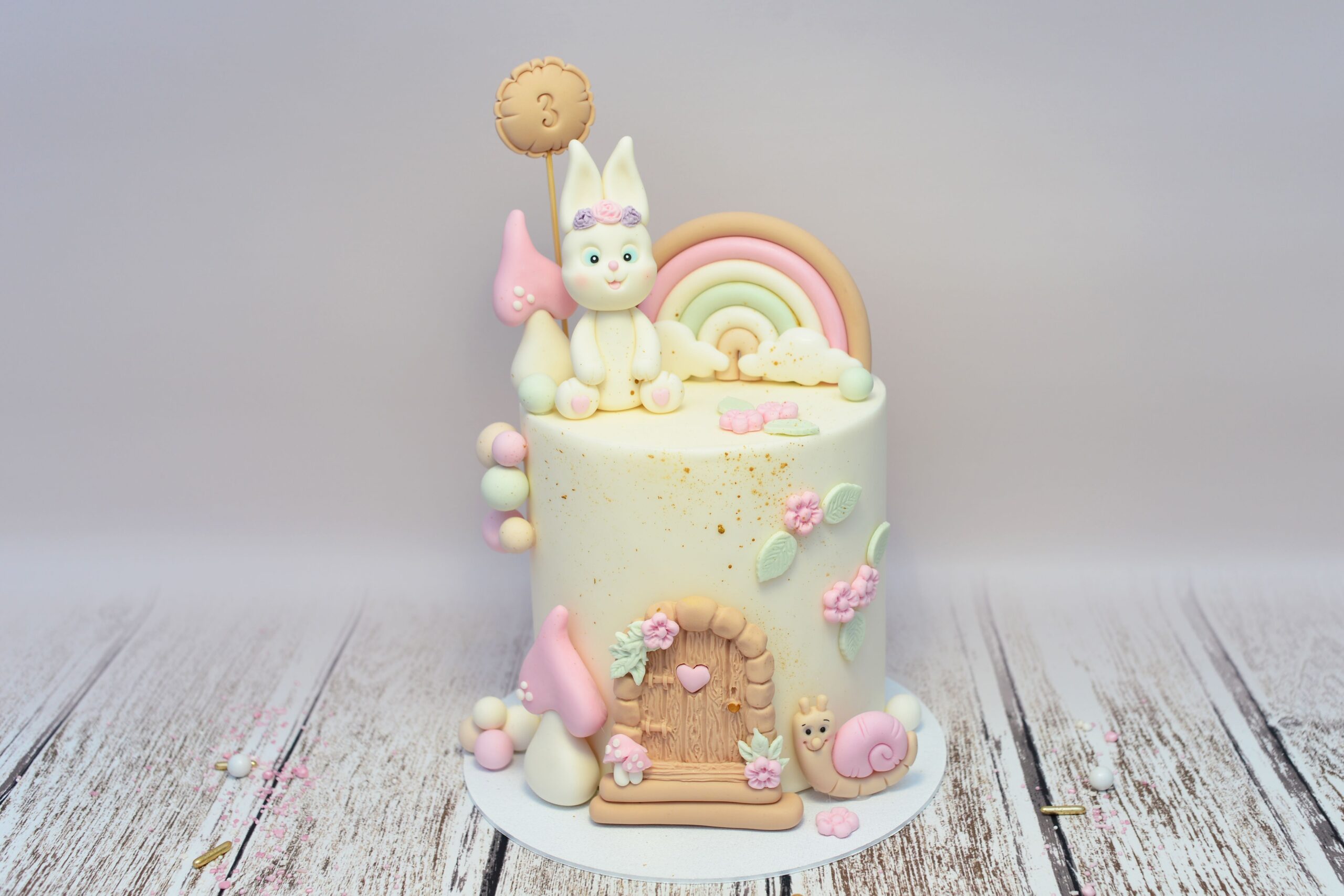 Pastelowa atrapa tortu z motywem bajkowego ogrodu i króliczka – idealna ekspozycja na urodziny dziewczynki.
