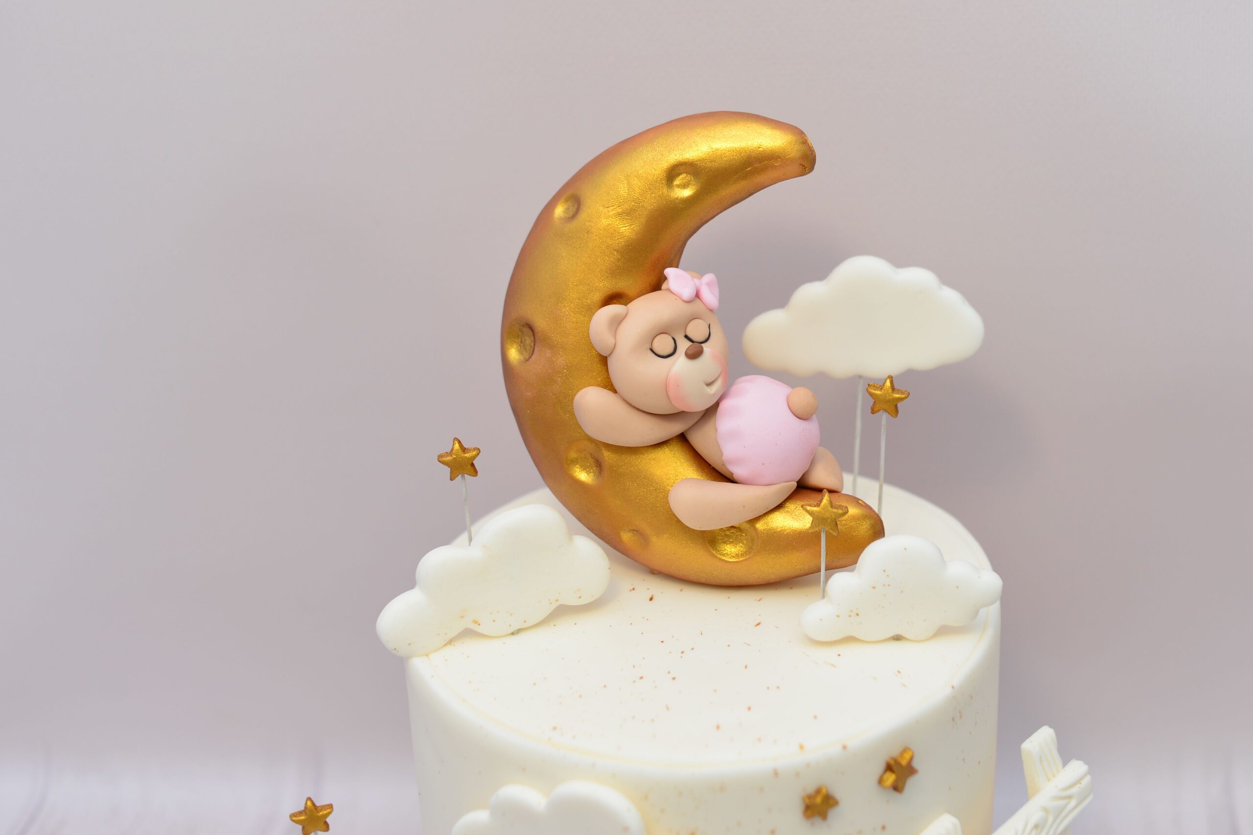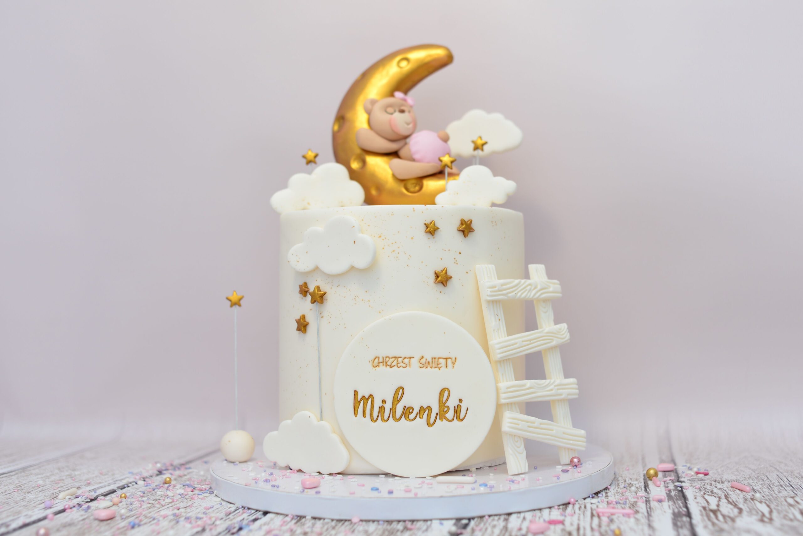 Elegancka atrapa tortu w delikatnej, kremowej kolorystyce z motywem śpiącej misi na złotym księżycu. Kompozycja przestrzenna z chmurkami, gwiazdkami i drabinką tworzy subtelny, bajkowy klimat idealny do ekspozycji na chrzest lub roczek.