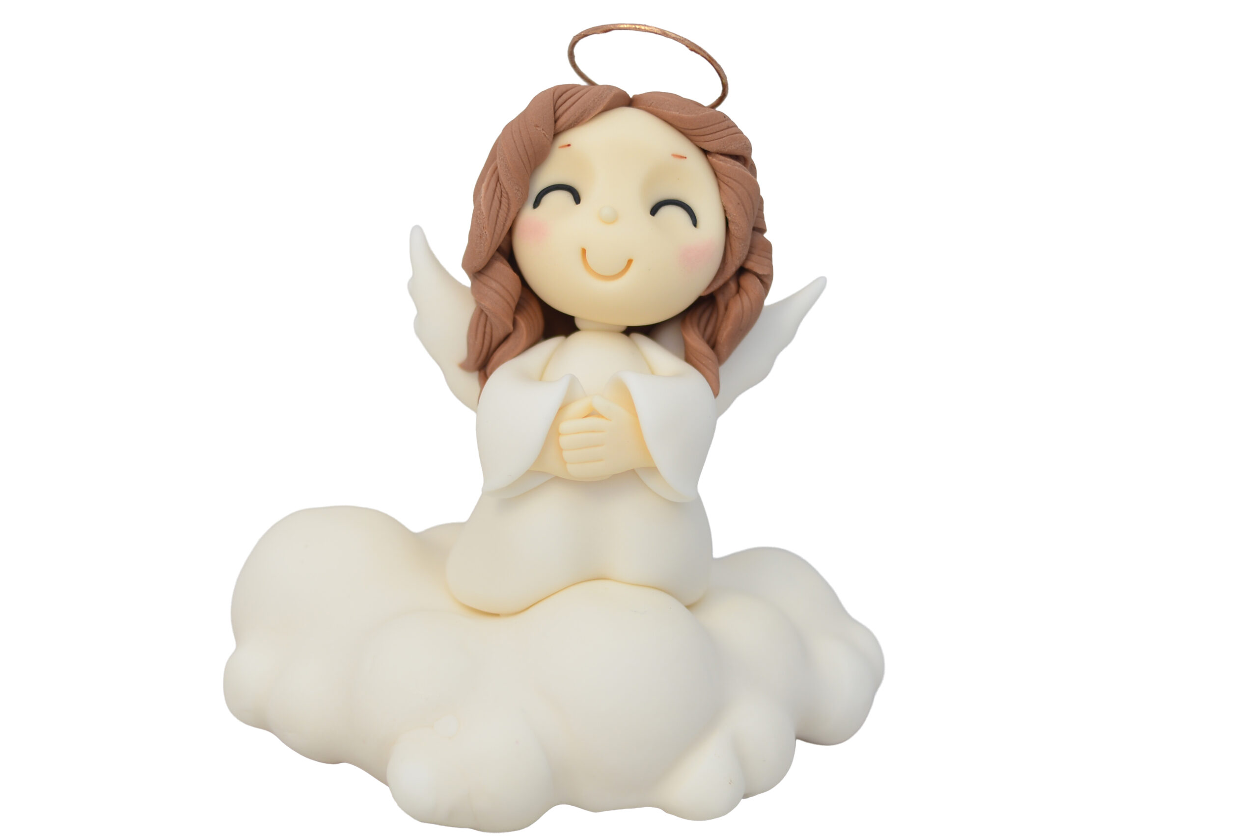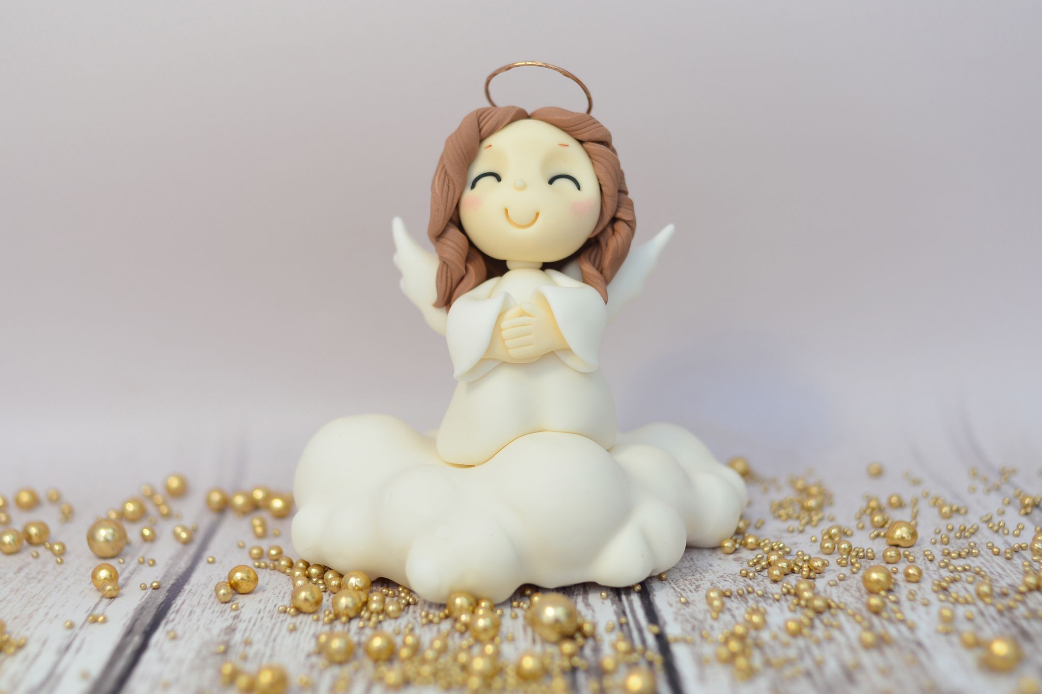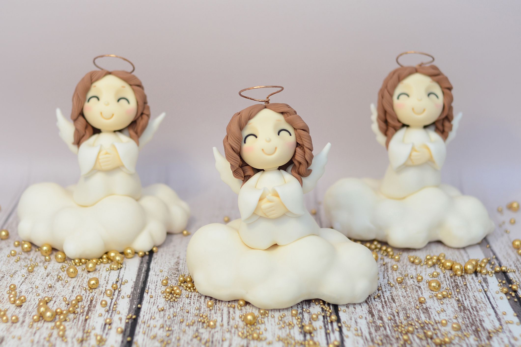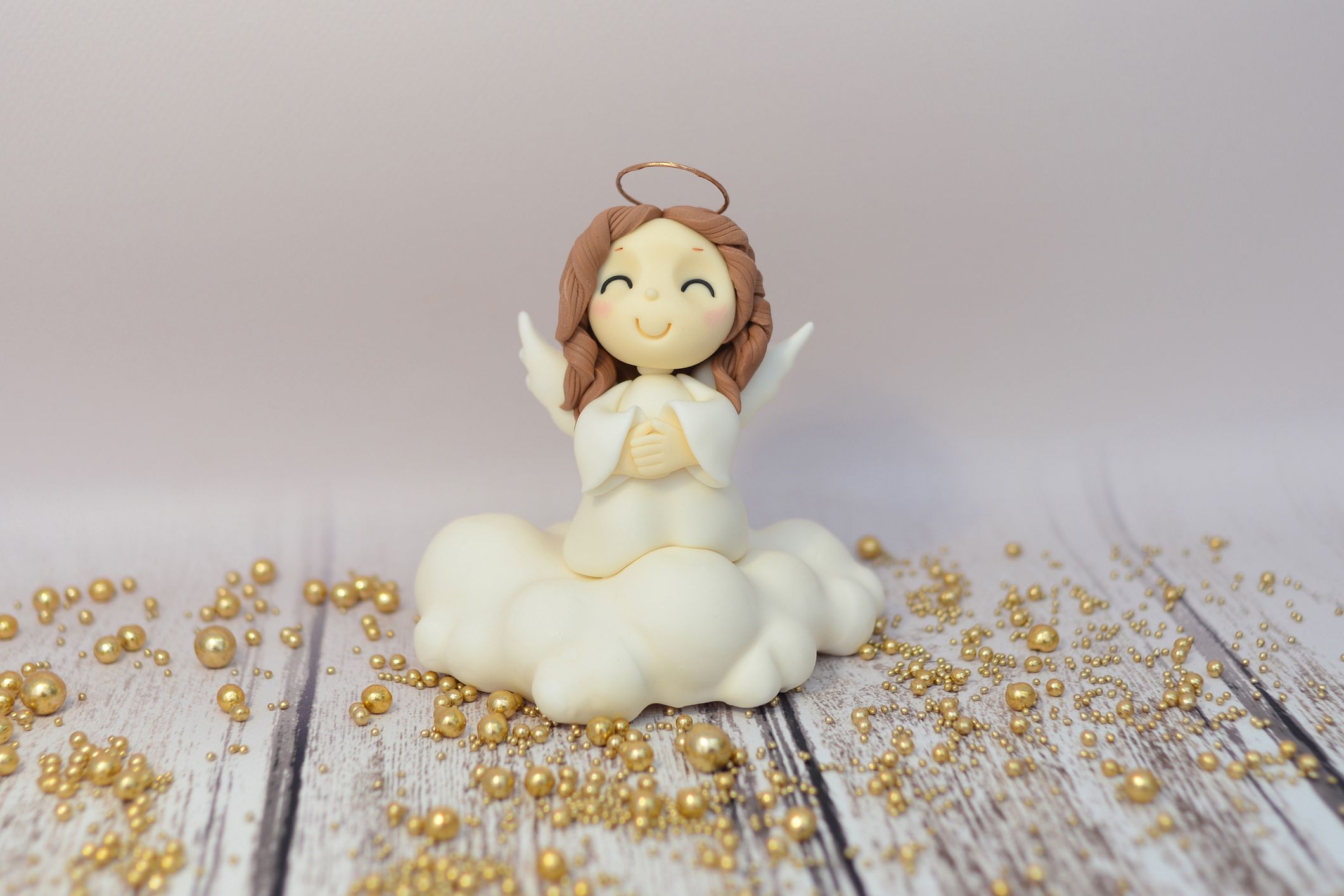Ten uroczy, ręcznie wykonany aniołek na chmurce to idealna dekoracja na tort z okazji: