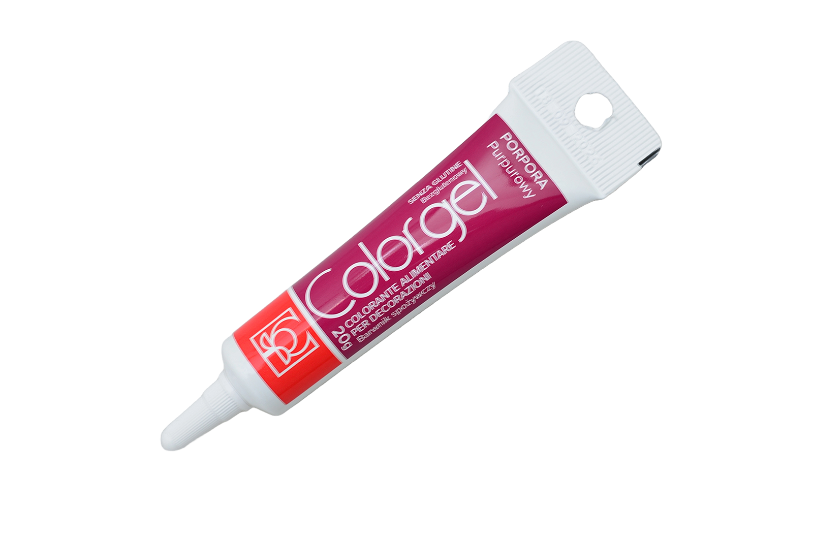 Skoncentrowany i bardzo wydajny barwnik spożywczy w żelu włoskiej firmy Modecor. Barwnik spożywczy w żelu purpurowy Colorgel Modecor jest odpowiedni do barwienia między innymi: śmietany, mas cukrowych, gum paste, marcepanu, różnego rodzaju kremów, ciast przed ich upieczeniem, lukru królewskiego.