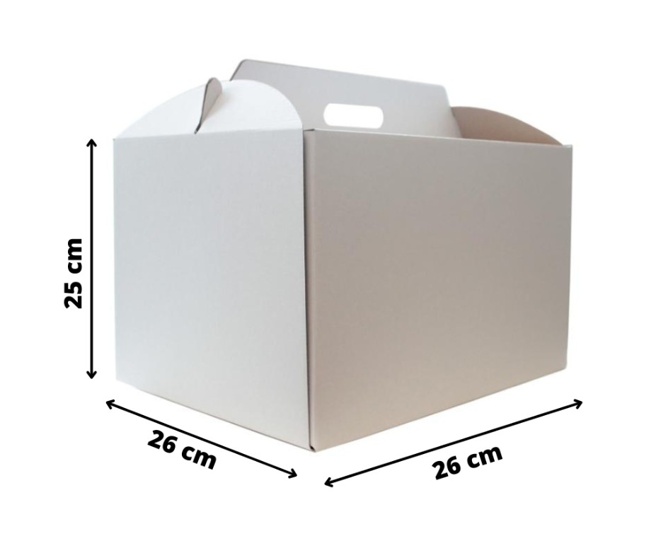 Prezentujemy proste do składania białe opakowanie na tort o wymiarach 26cmx26cmx25cm które jest praktyczne i funkcjonalne. To idealne rozwiązanie dla tych, którzy poszukują prostego, ale solidnego opakowania na torty do różnych uroczystości.