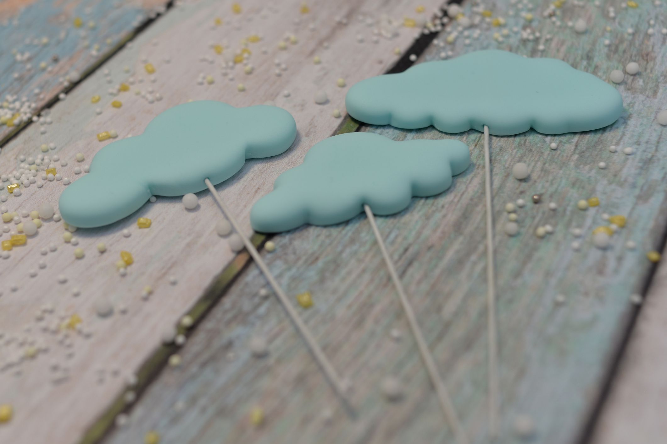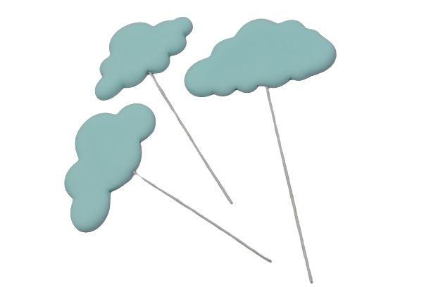 3 sztuki chmurek w różnych kształtach, w kolorze błękitnym, zamocowanych na druciku (produkt wykonany z tworzywa sztucznego posiada atest do kontaktu z żywnością). Idealnie sprawdzą się jako np. uzupełnienie dekoracji tortu urodzinowego.
