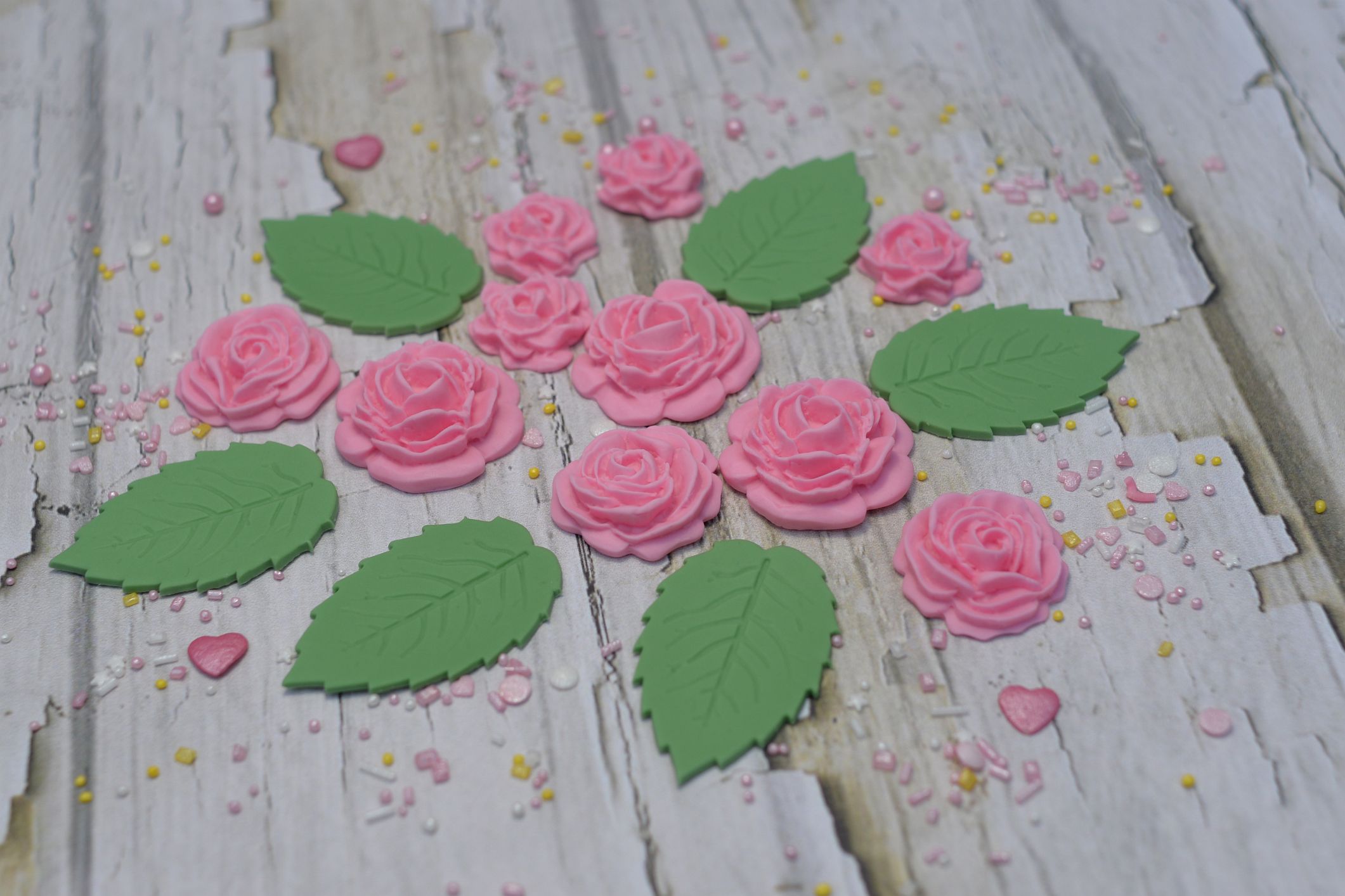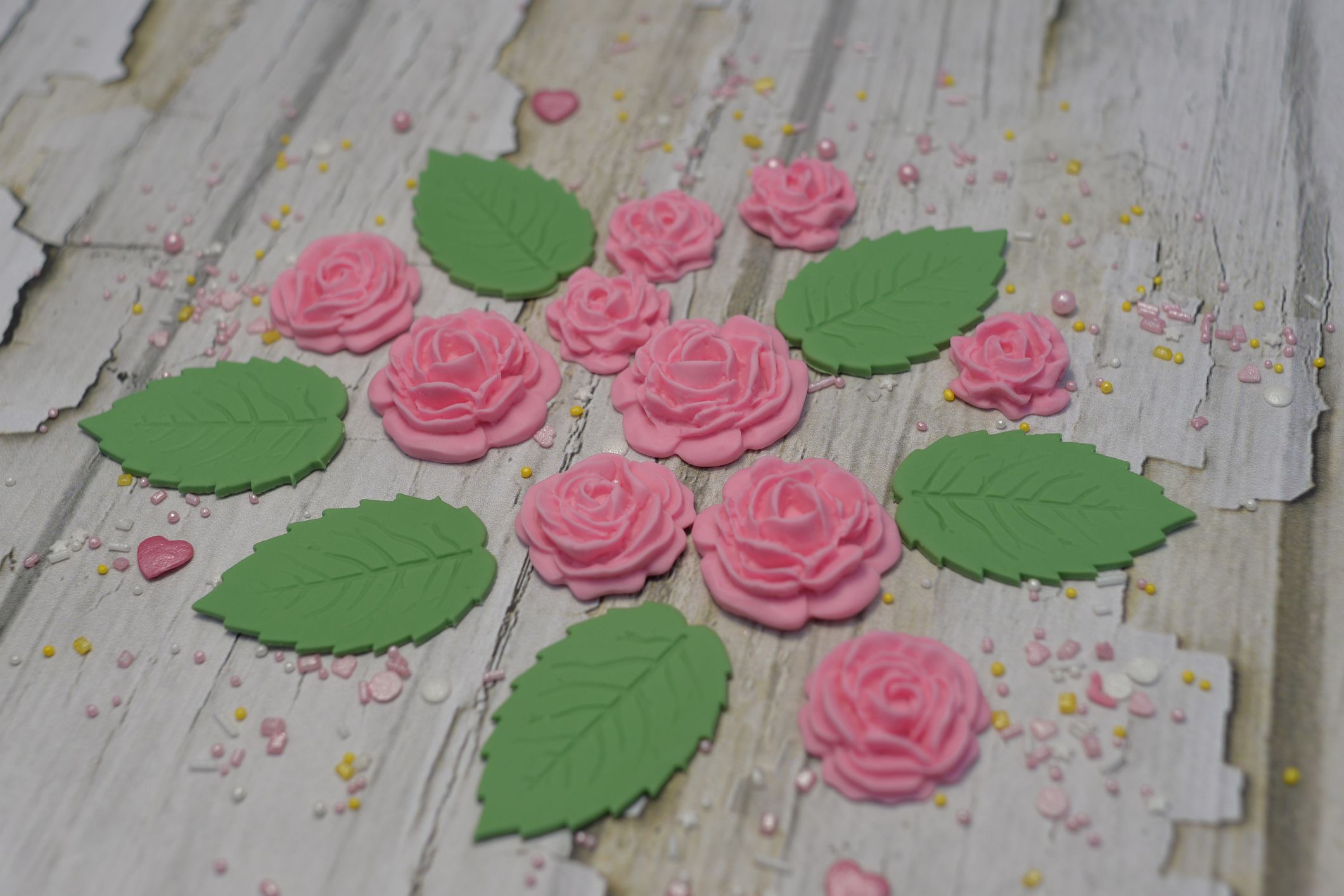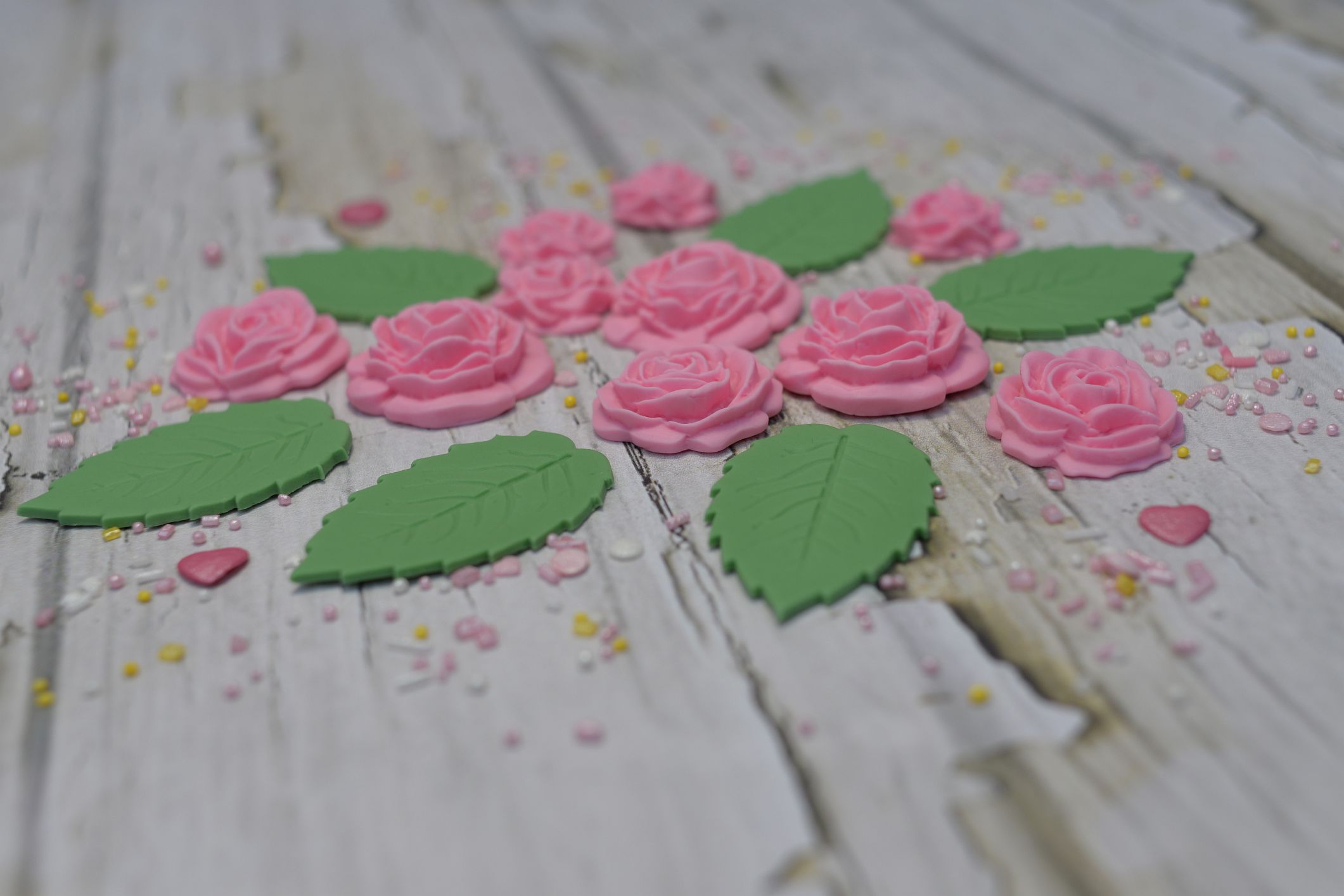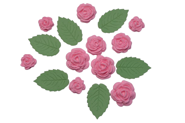 W zestawie 10 szt róż w różnych rozmiarach, oraz 6 szt listków róży.