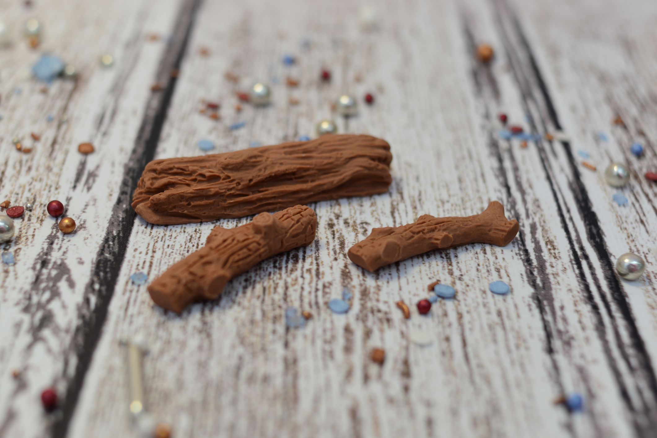 Stwórz na swoim torcie magiczny leśny zakątek! Zestaw 3 kawałków cukrowego drewna to uroczy dodatek, który pięknie komponuje się z dekoracjami takie jak ślimaczki, czy gąsieniczki.