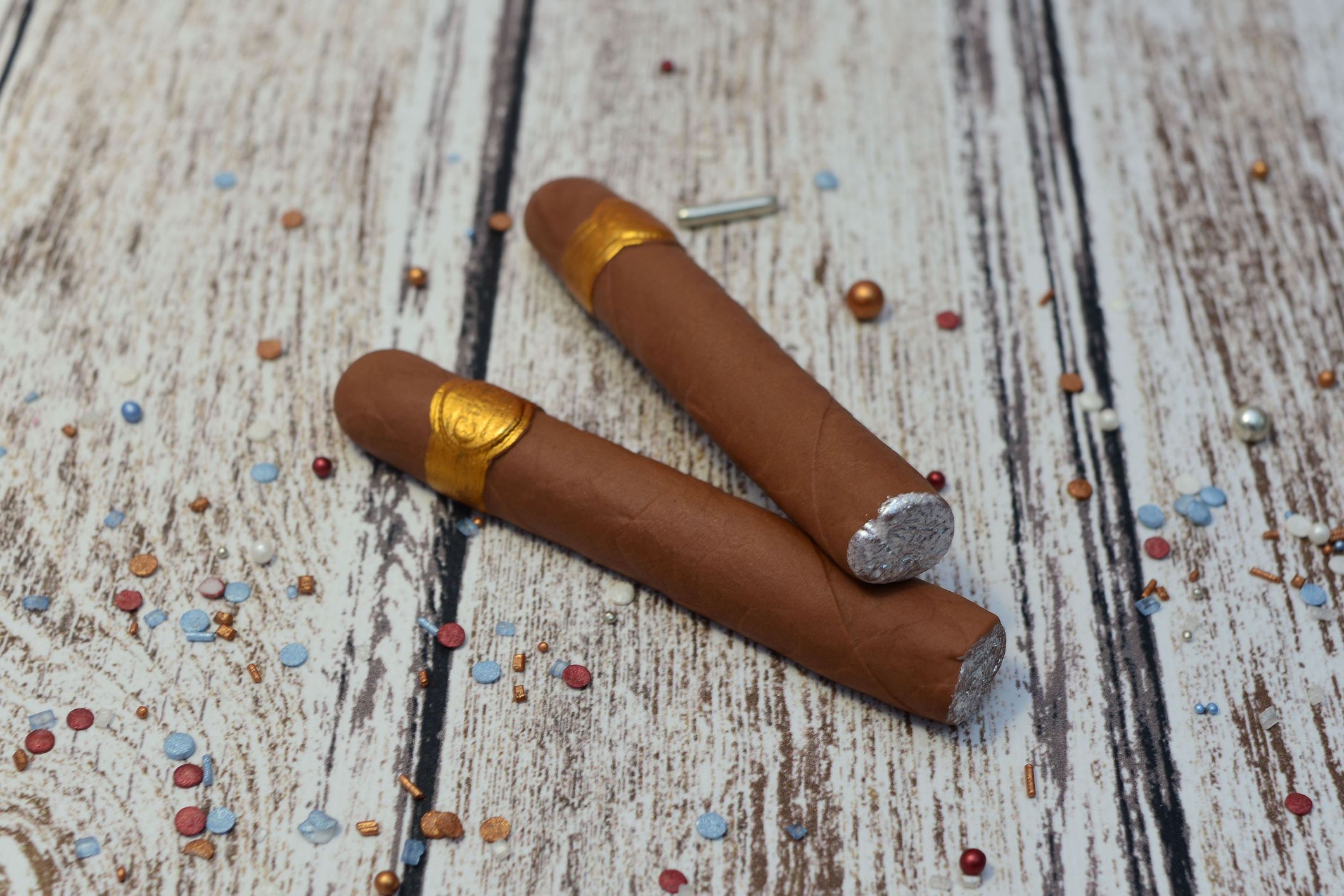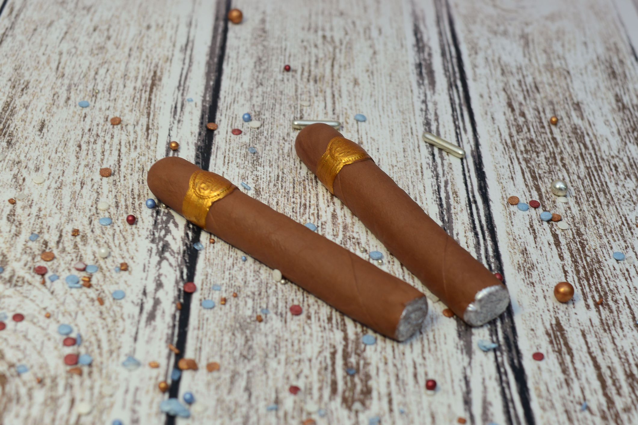 Ręcznie wykonany z masy cukrowej zestaw 2 szt cygar, idealny jako dekoracja tortów i innych słodkości na męskie przyjęcia. Każde cygaro posiada złotą banderolę, która dodaje całości elegancji i podkreśla styl dekoracji. Końcówka została wykonana z efektem realistycznego popiołu, co dodatkowo podkreśla jej autentyczny wygląd.