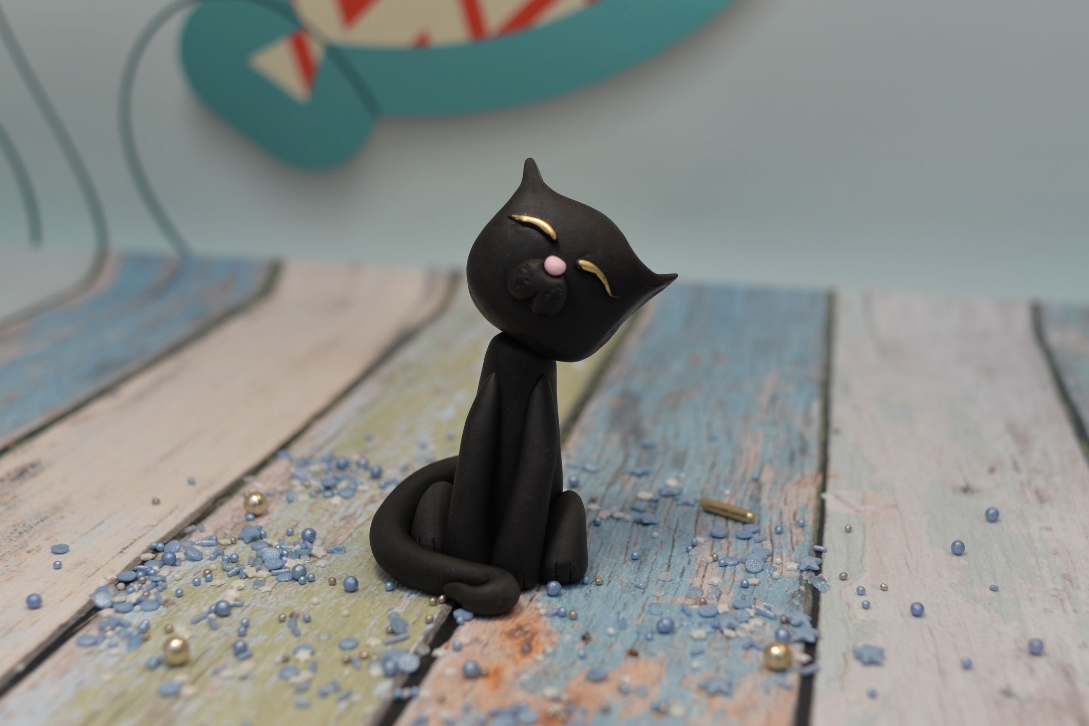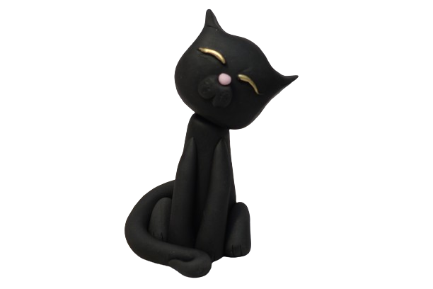Przedstawiamy figurkę czarnego kotka. Kotek ma zamknięte oczy pomalowane złotym barwnikiem, oraz lekko przechyloną na bok główkę. Jest wysoki i smukły, przez co elegancki i dostojny:)