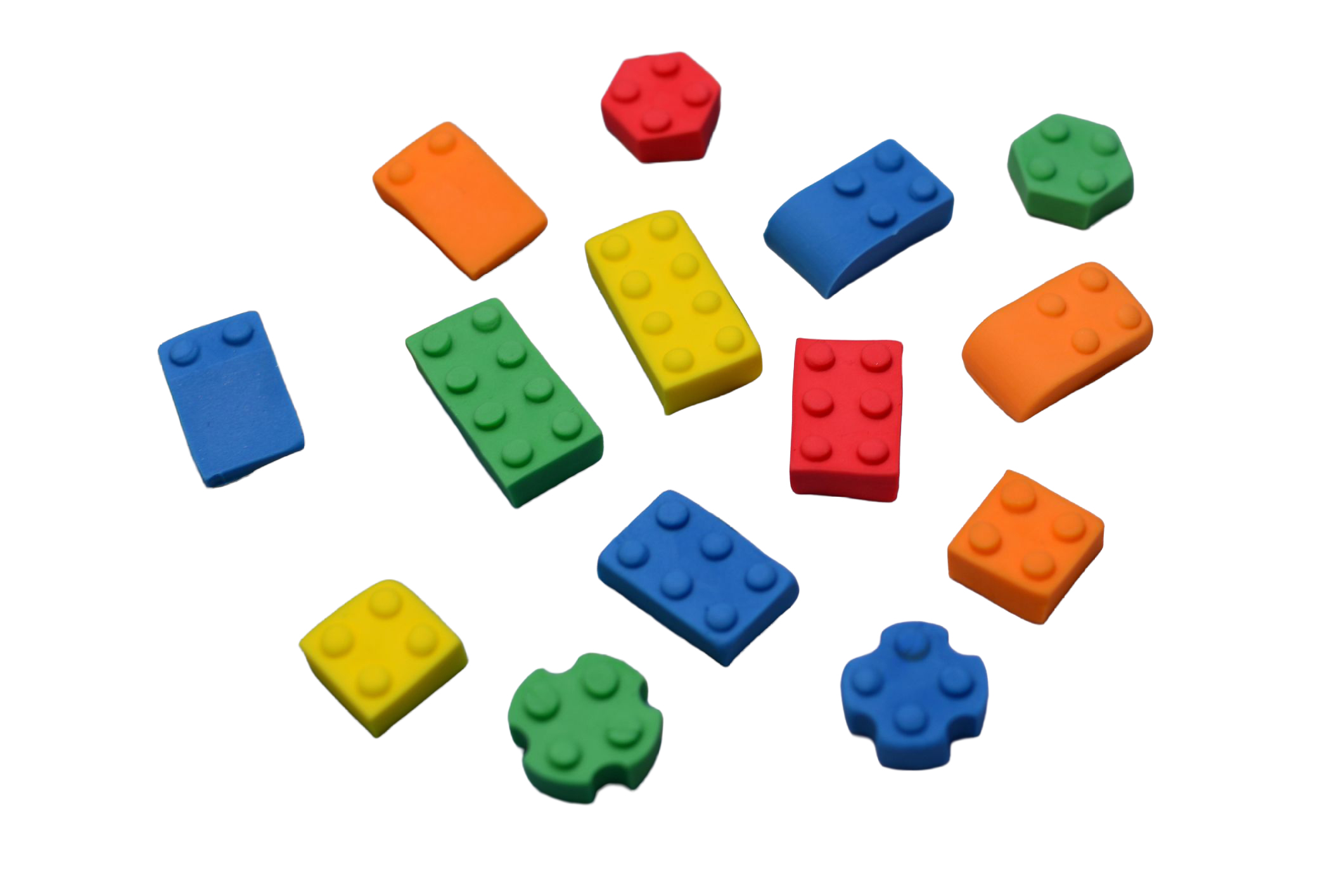 7 kształtów po 2 sztuki. Kolory klocków w opakowaniu dobieramy losowo – zawsze będą we wszystkich 5 kolorach.