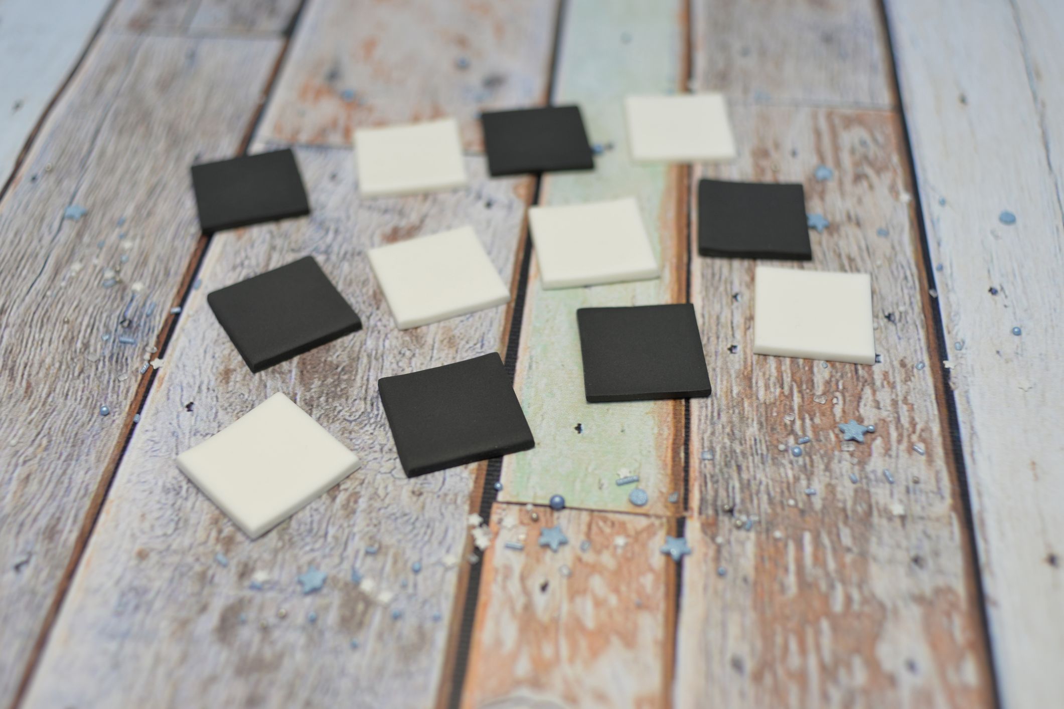 Dodaj nowoczesnego i eleganckiego charakteru swoim wypiekom dzięki naszym dekoracjom cukrowym w kształcie kwadratów w klasycznych kolorach bieli i czerni.