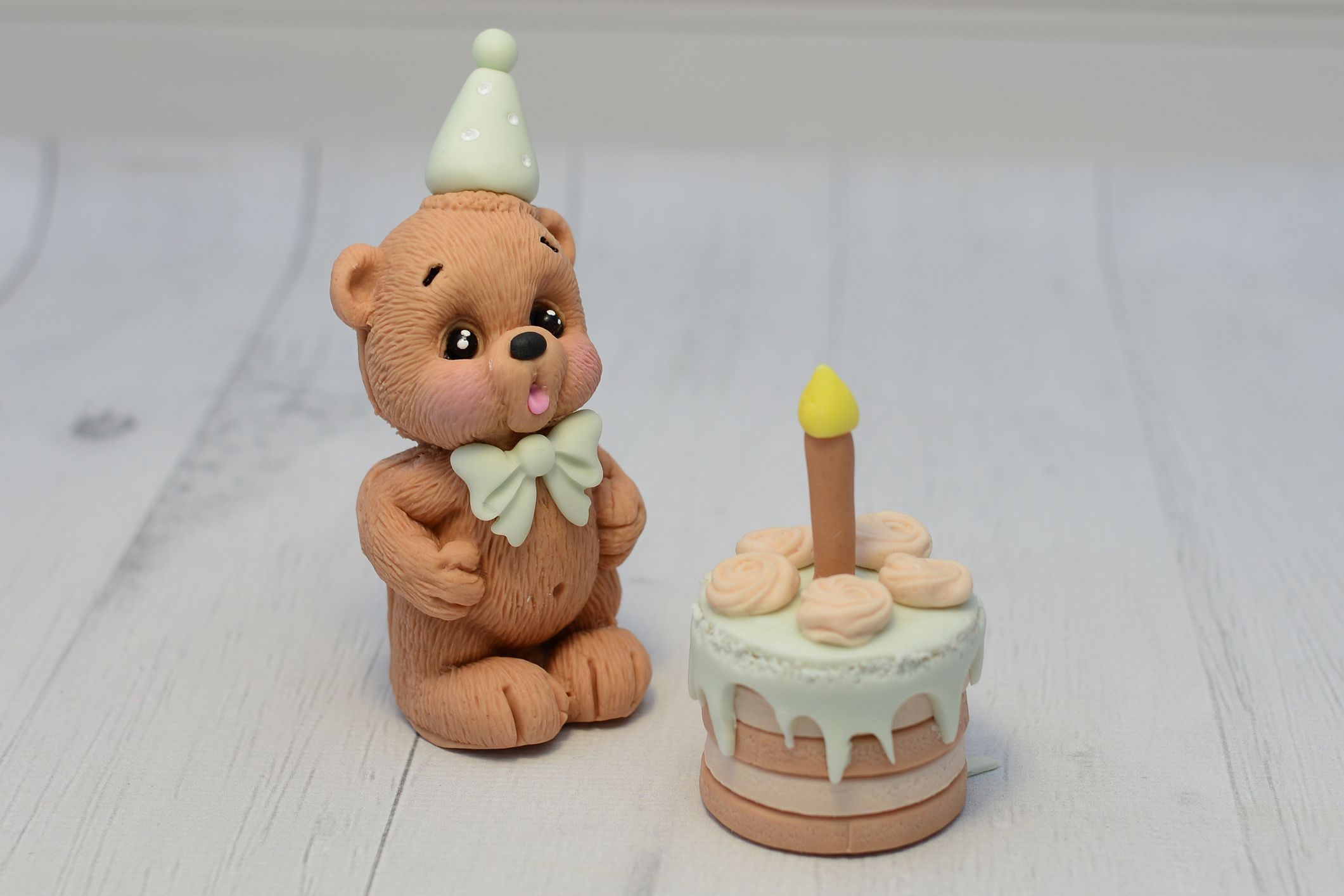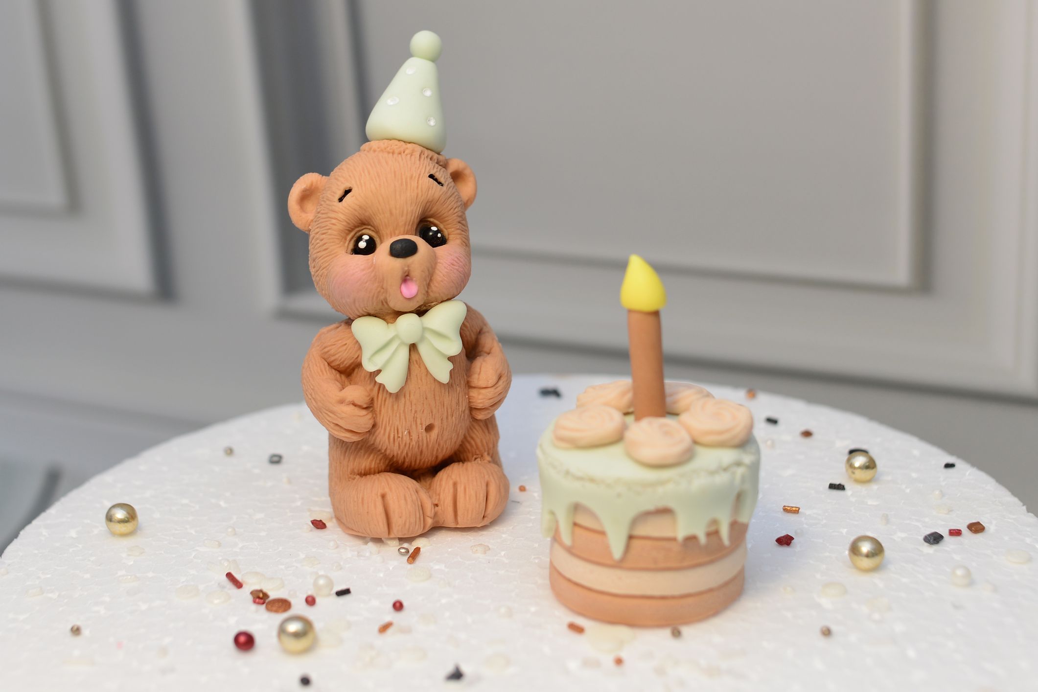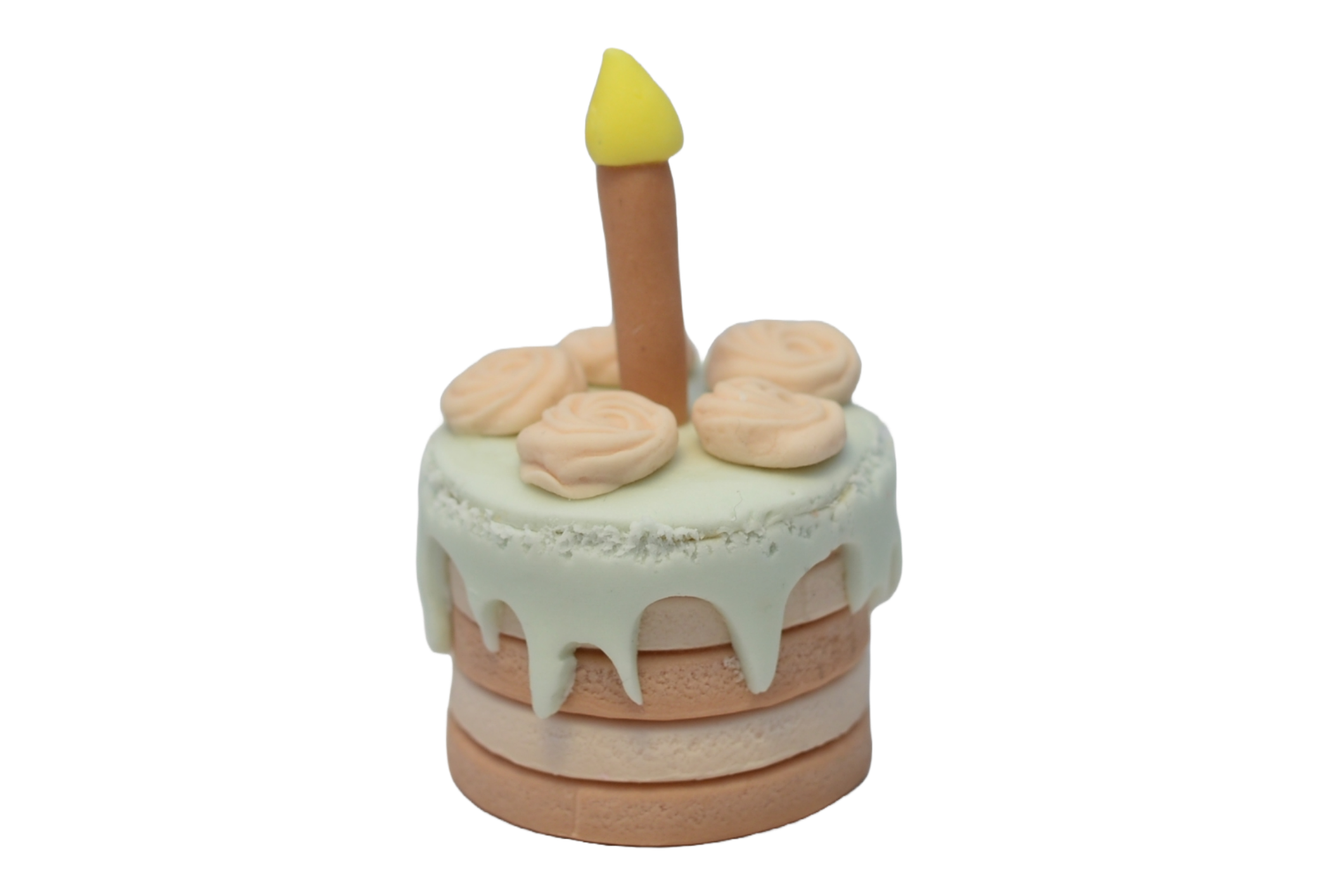 Przedstawiamy uroczą dekorację cukrową w kolorze beżowym z akcentami jasnej zieleni, wykonaną z masy cukrowej. Ta efektowna ozdoba w kształcie torcika będzie wspaniałym dodatkiem do Twojego tortu – idealnym na każdą okazję, od urodzin po tematyczne przyjęcia.