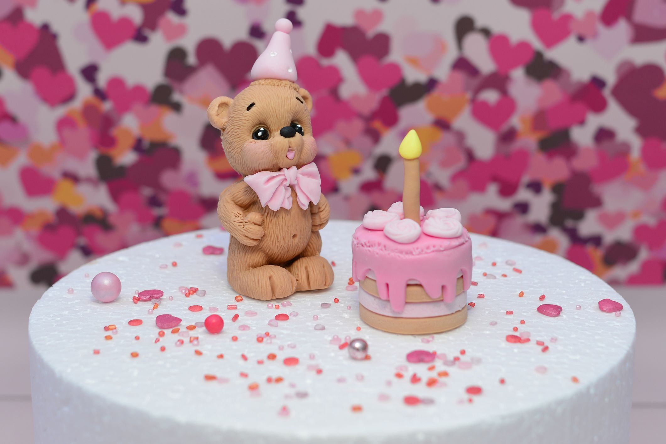 Przedstawiamy uroczą dekorację cukrową w kolorze beżowym z różowymi akcentami, wykonaną z masy cukrowej. Ta efektowna ozdoba w kształcie torcika będzie wspaniałym dodatkiem do Twojego tortu – idealnym na każdą okazję, od urodzin po tematyczne przyjęcia.
