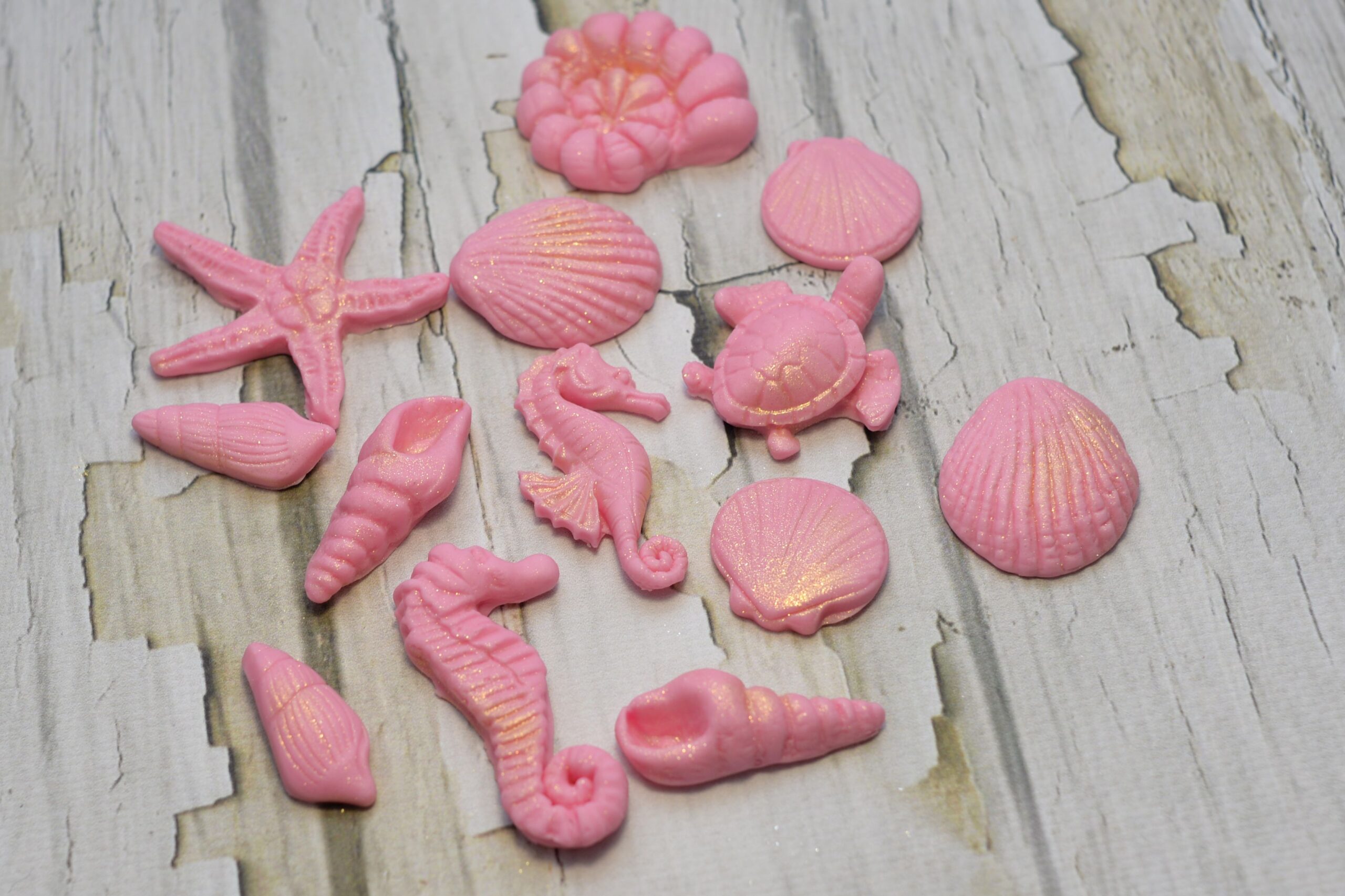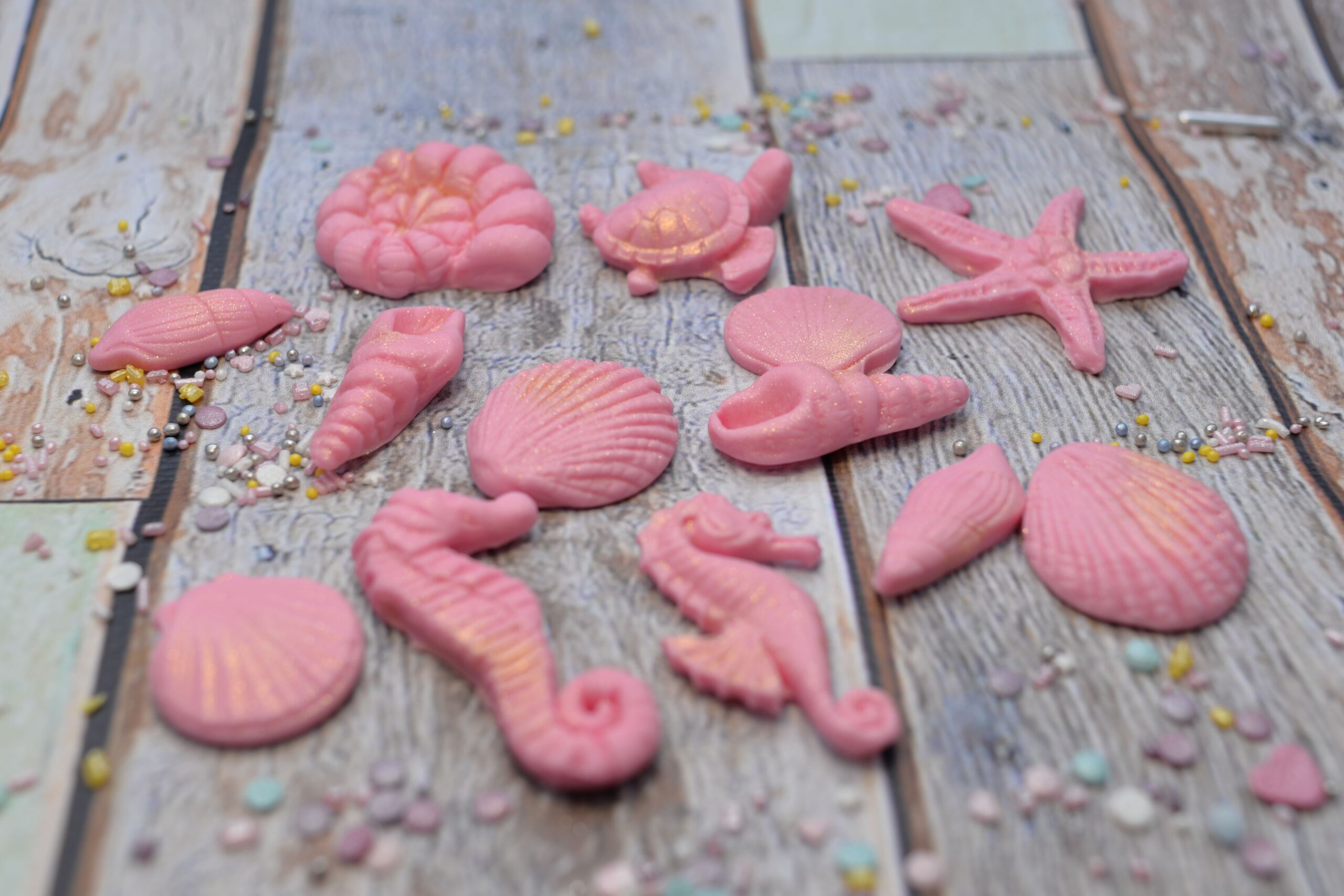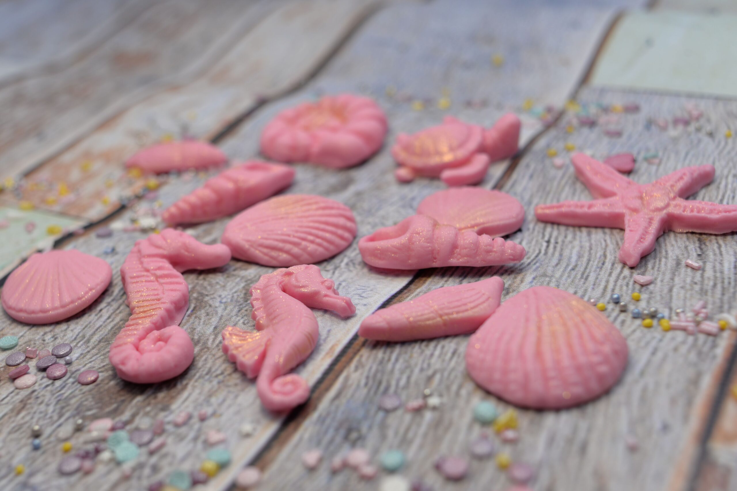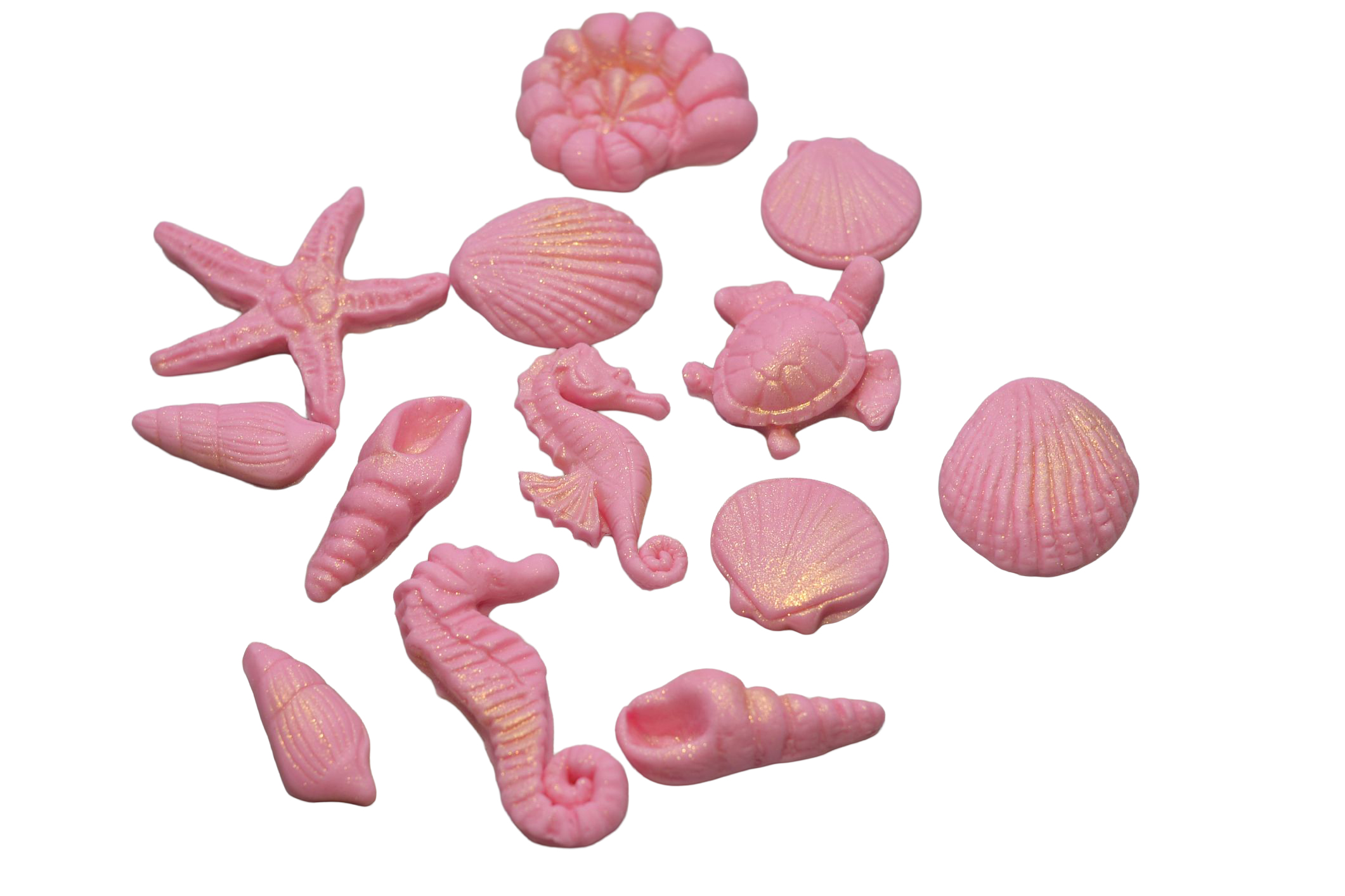 W zestawie rożne muszelki, koniki morskie, rozgwiazda oraz żółwik w kolorze różowym. Dekoracje pięknie się błyszczą. Pomalowane zostały delikatnie złotym spożywczym barwnikiem.