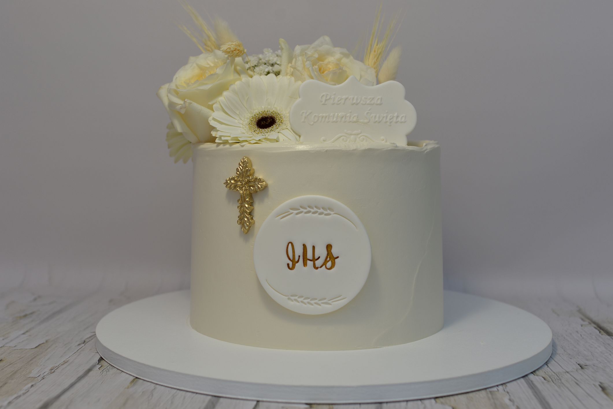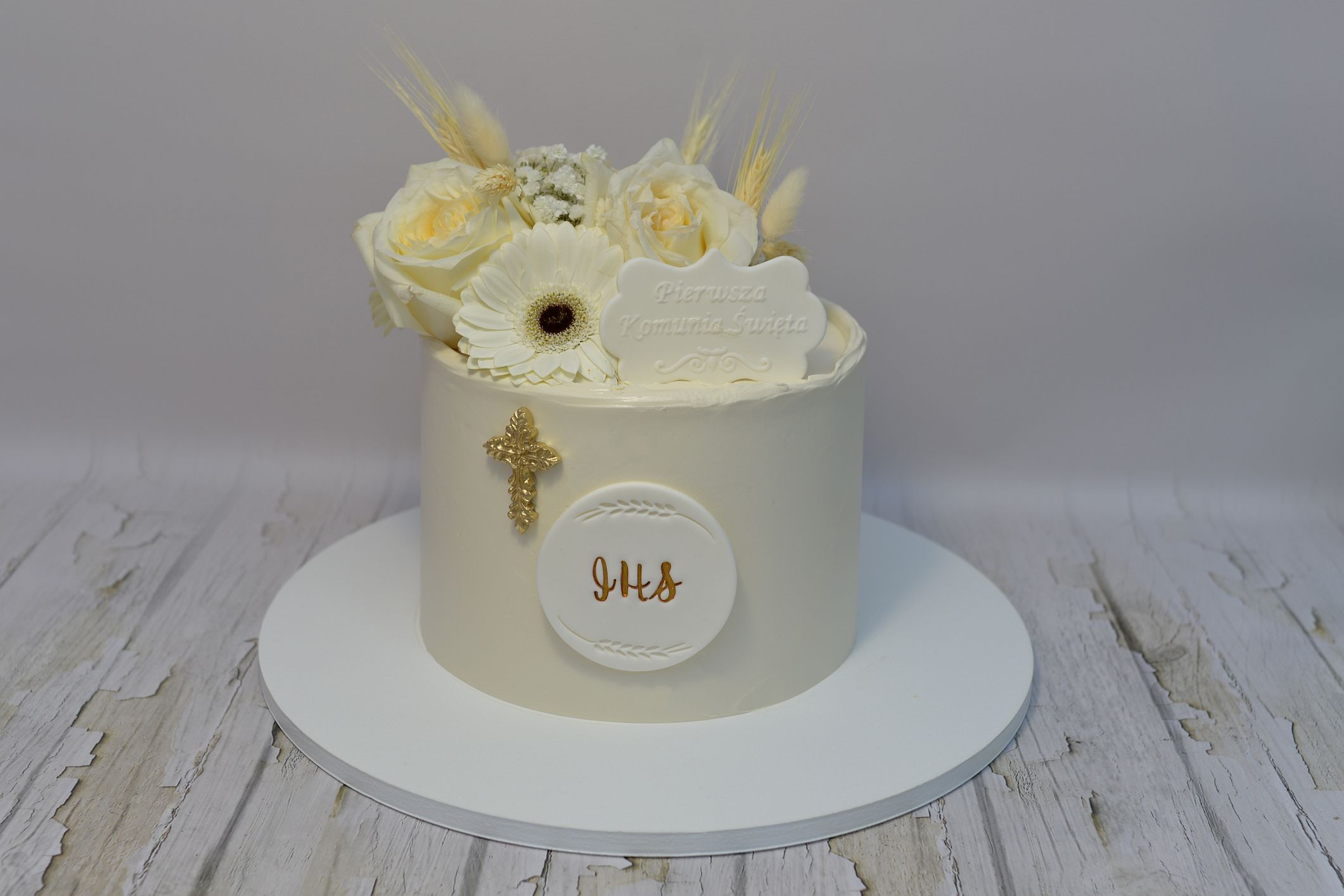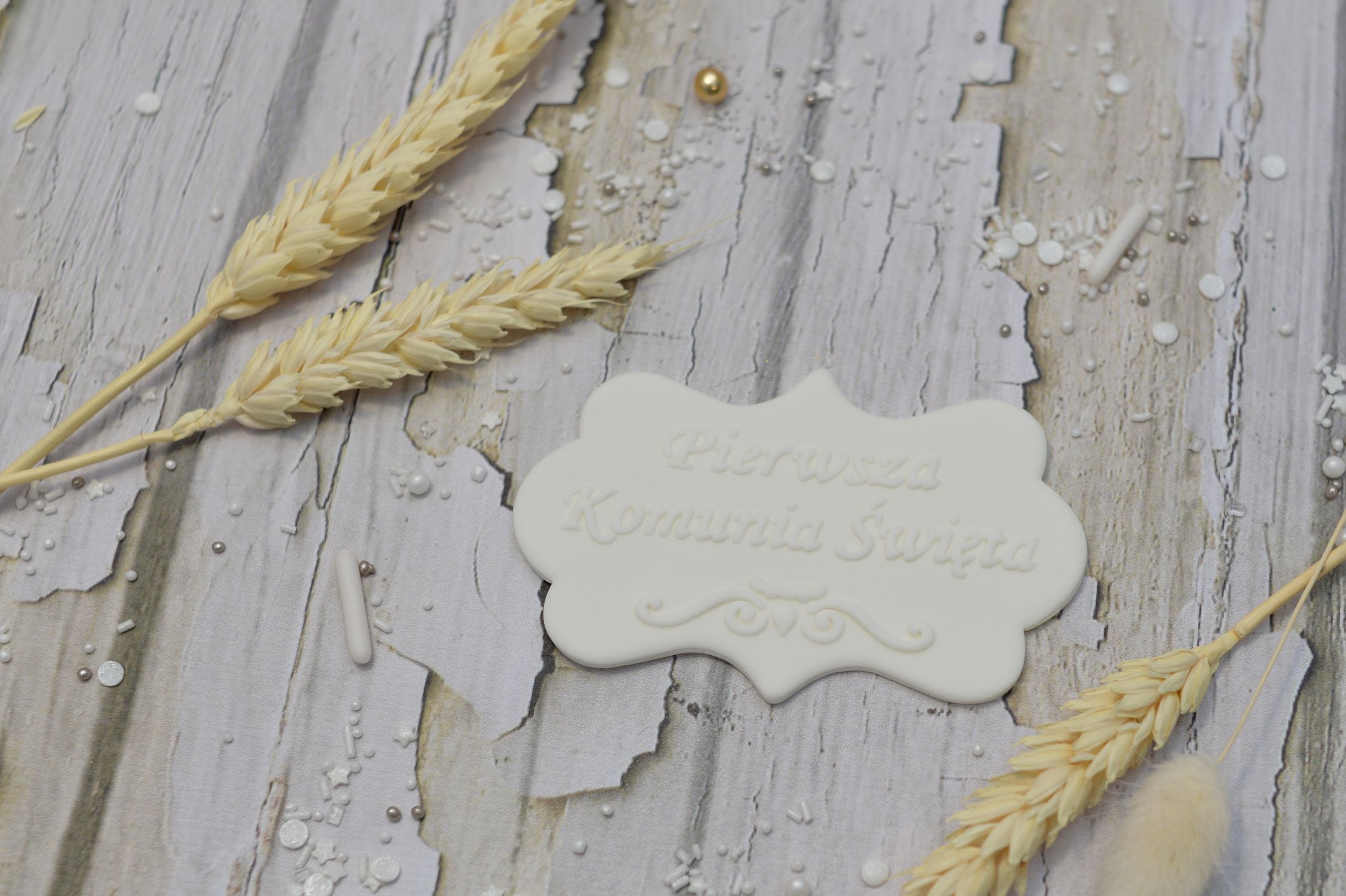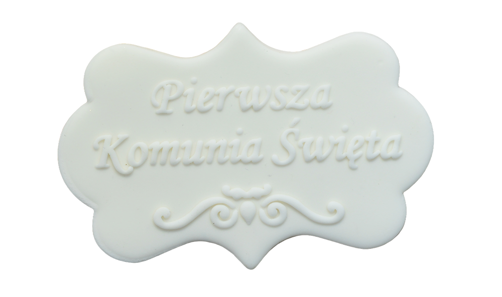 Ręcznie wykonana tabliczka z napisem „Pierwsza Komunia Święta” to elegancka i subtelna dekoracja tortu komunijnego. Klasyczna, biała kolorystyka oraz delikatne zdobienia nadają całości ponadczasowy i uroczysty charakter.