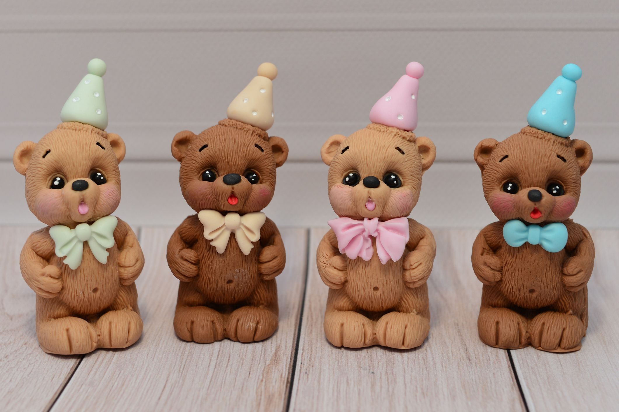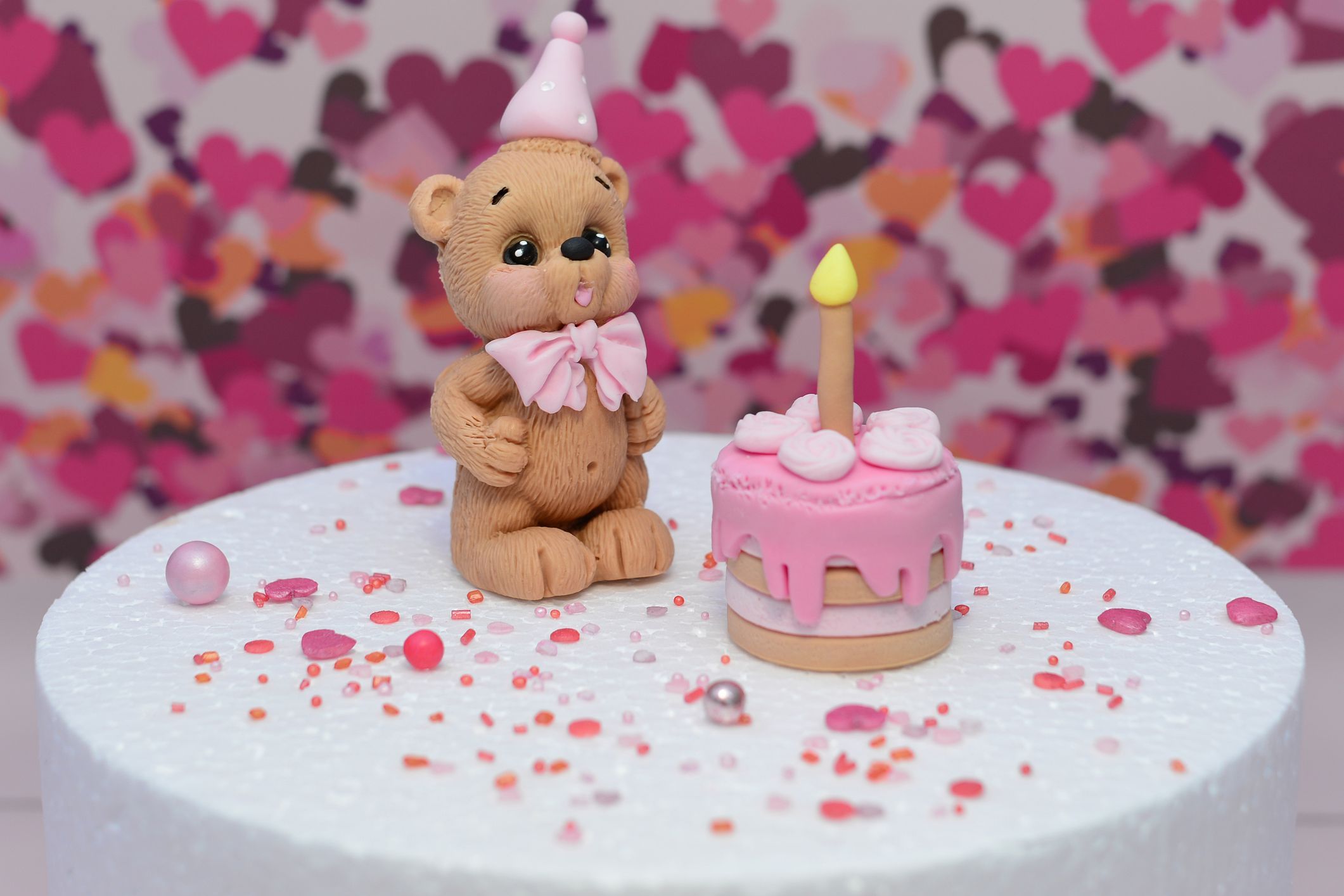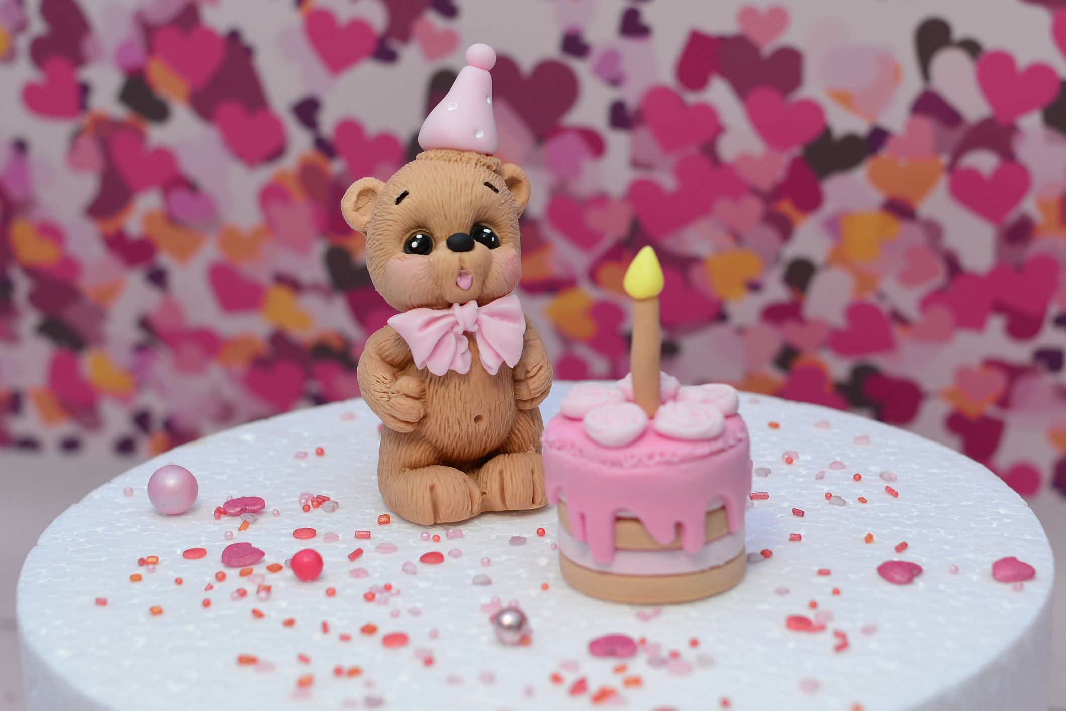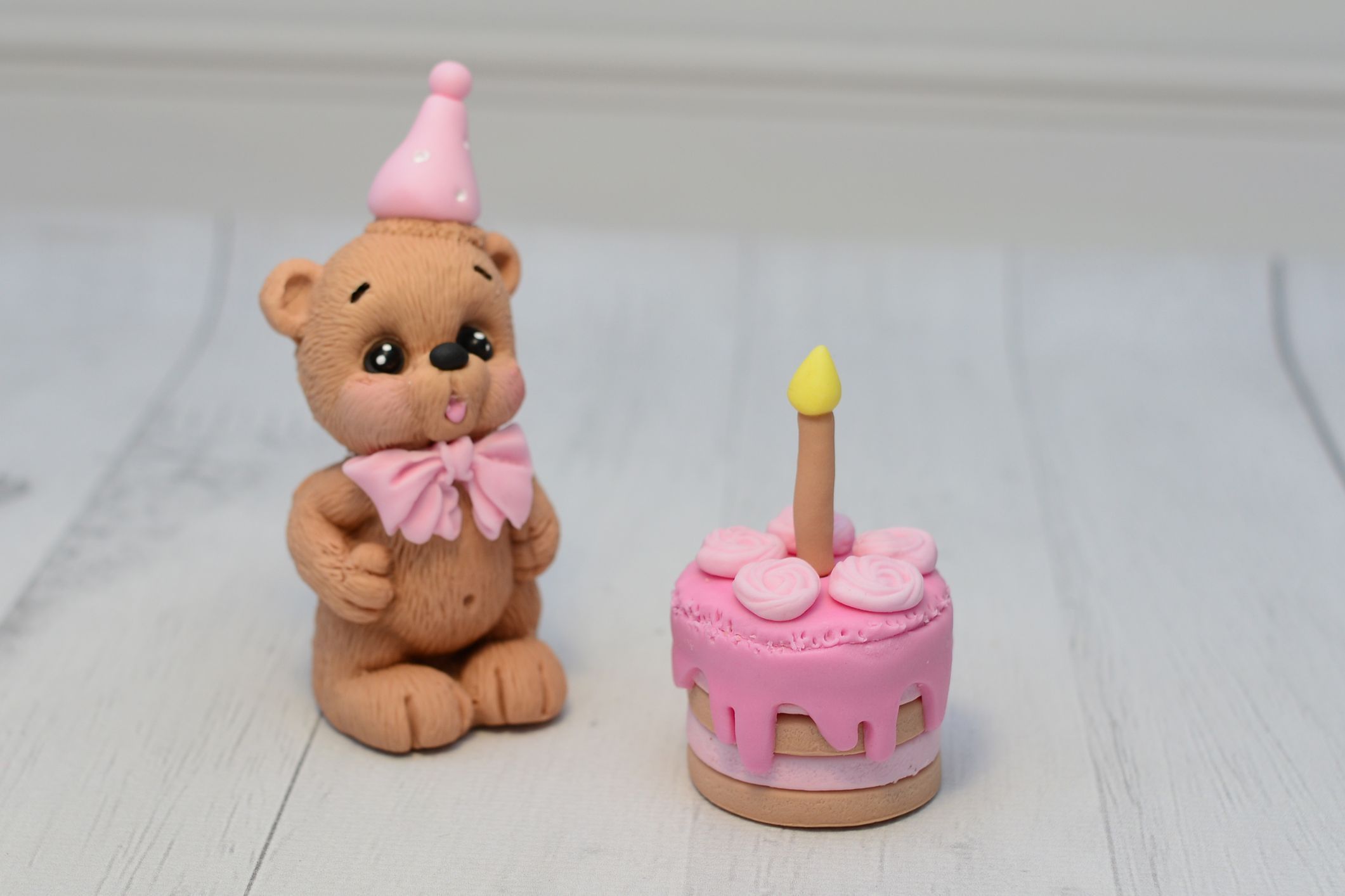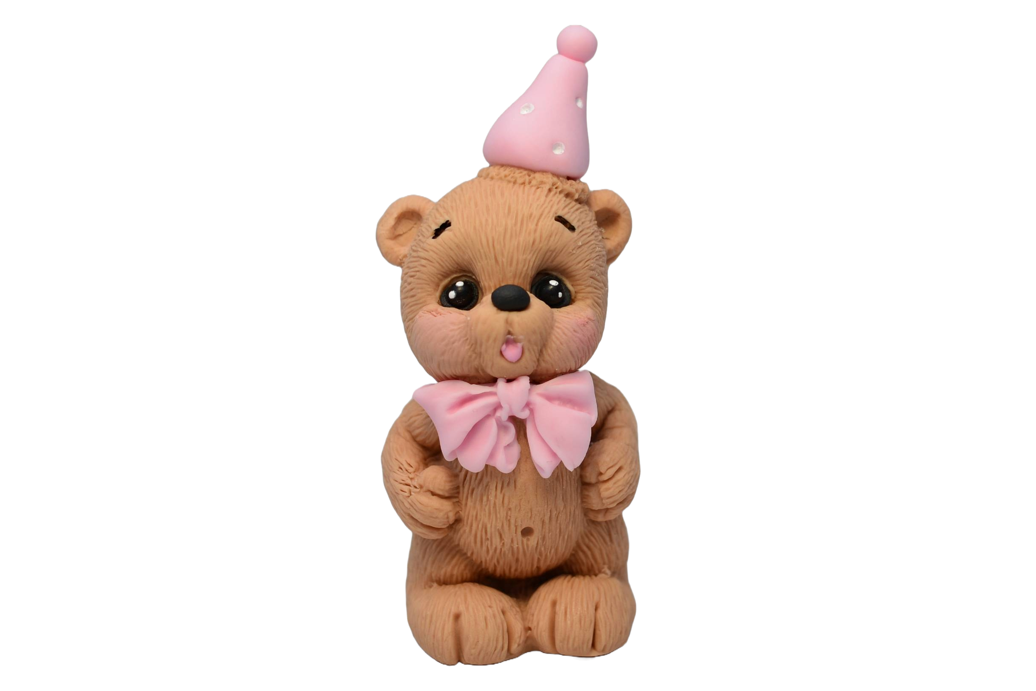 Przedstawiamy uroczego misia w kolorze beżowym, wykonanego z masy cukrowej, który dmucha świeczkę. Figurka ozdobiona jest różową czapeczką urodzinową, co nadaje jej wyjątkowego charakteru. Ta efektowna dekoracja będzie wspaniałym dodatkiem do Twojego tortu – idealnym na każdą okazję, od urodzin po tematyczne przyjęcia.