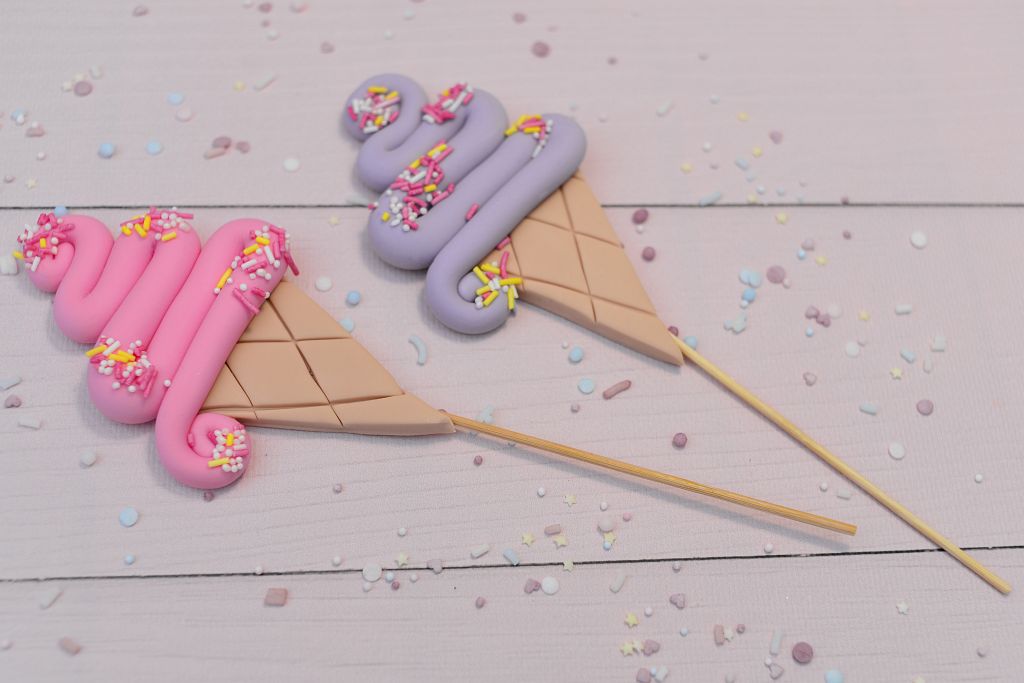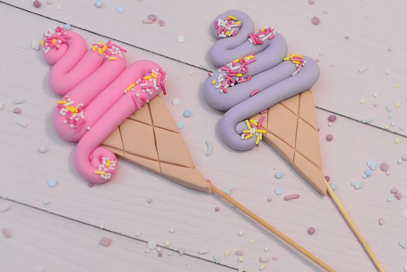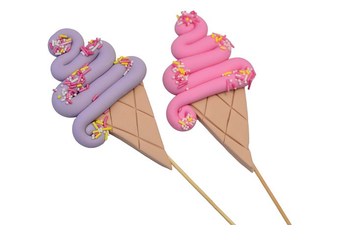 W zestawie znajdziesz dwie dekoracje w kształcie lodów w rożku – jeden w kolorze różowym, drugi w lawendowym – oba wykończone kolorową posypką i mnóstwem uroku.