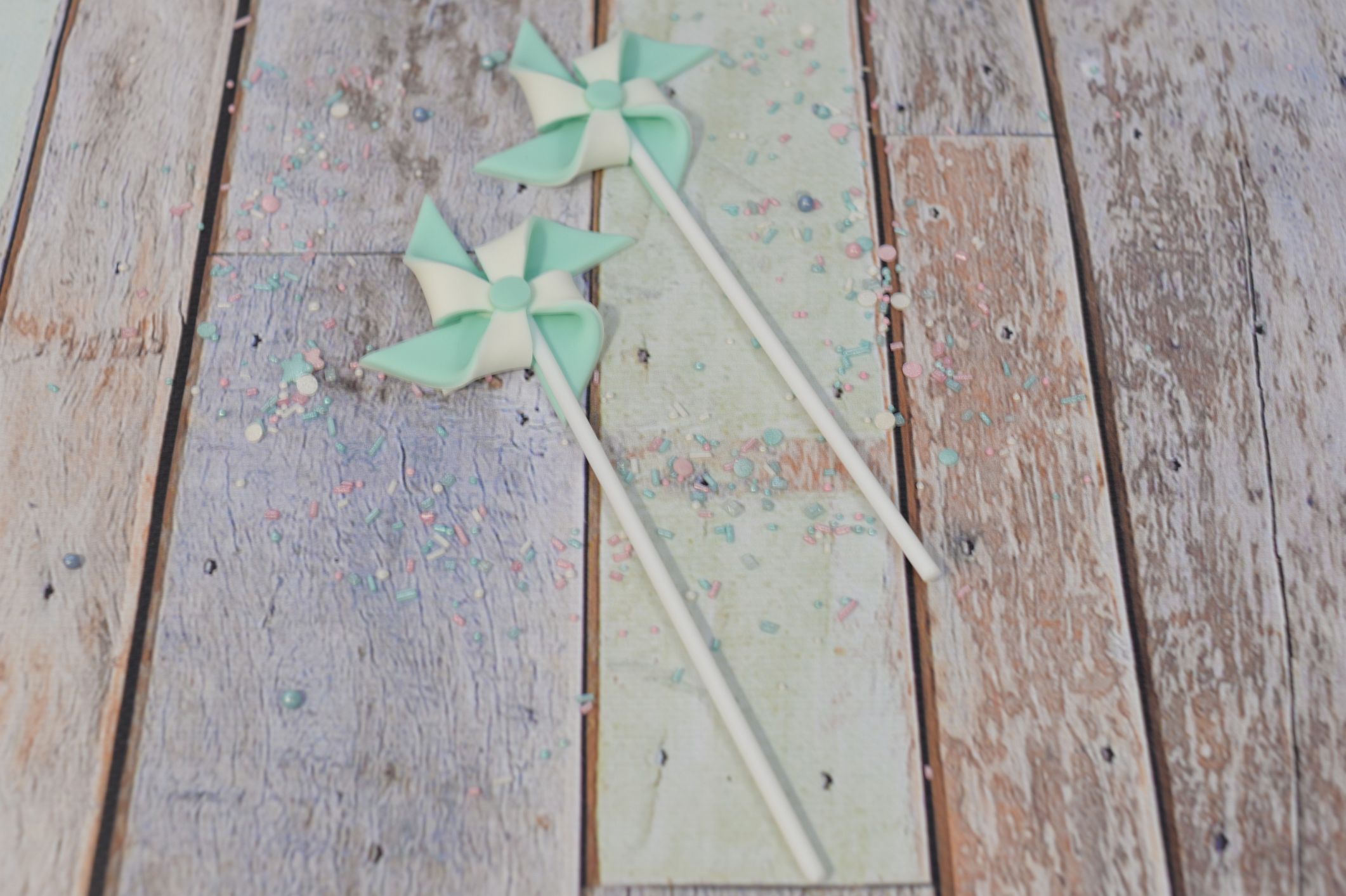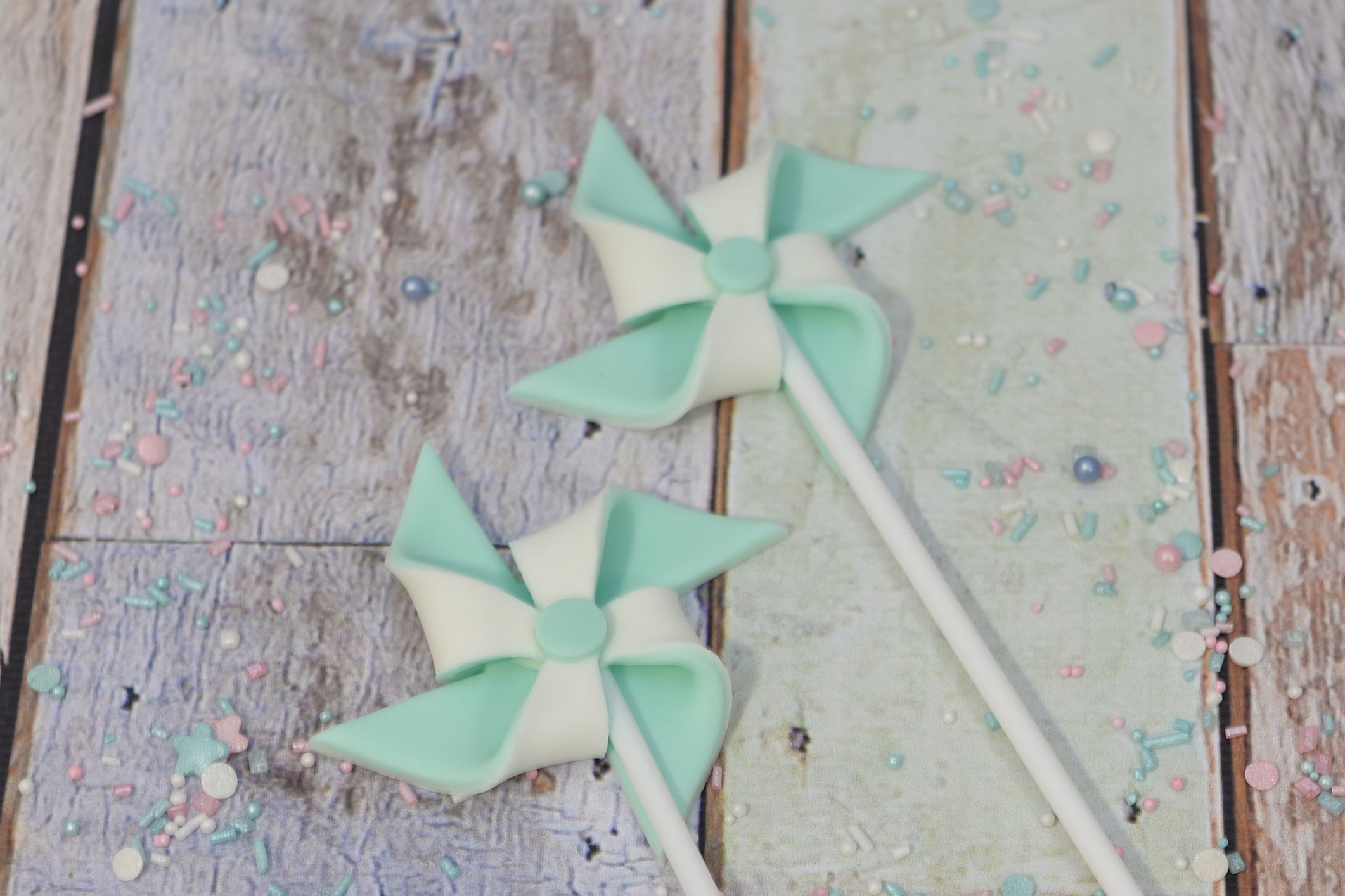 Wiatraczek wykonany z masy cukrowej, zamocowany na patyczku do lizaków.