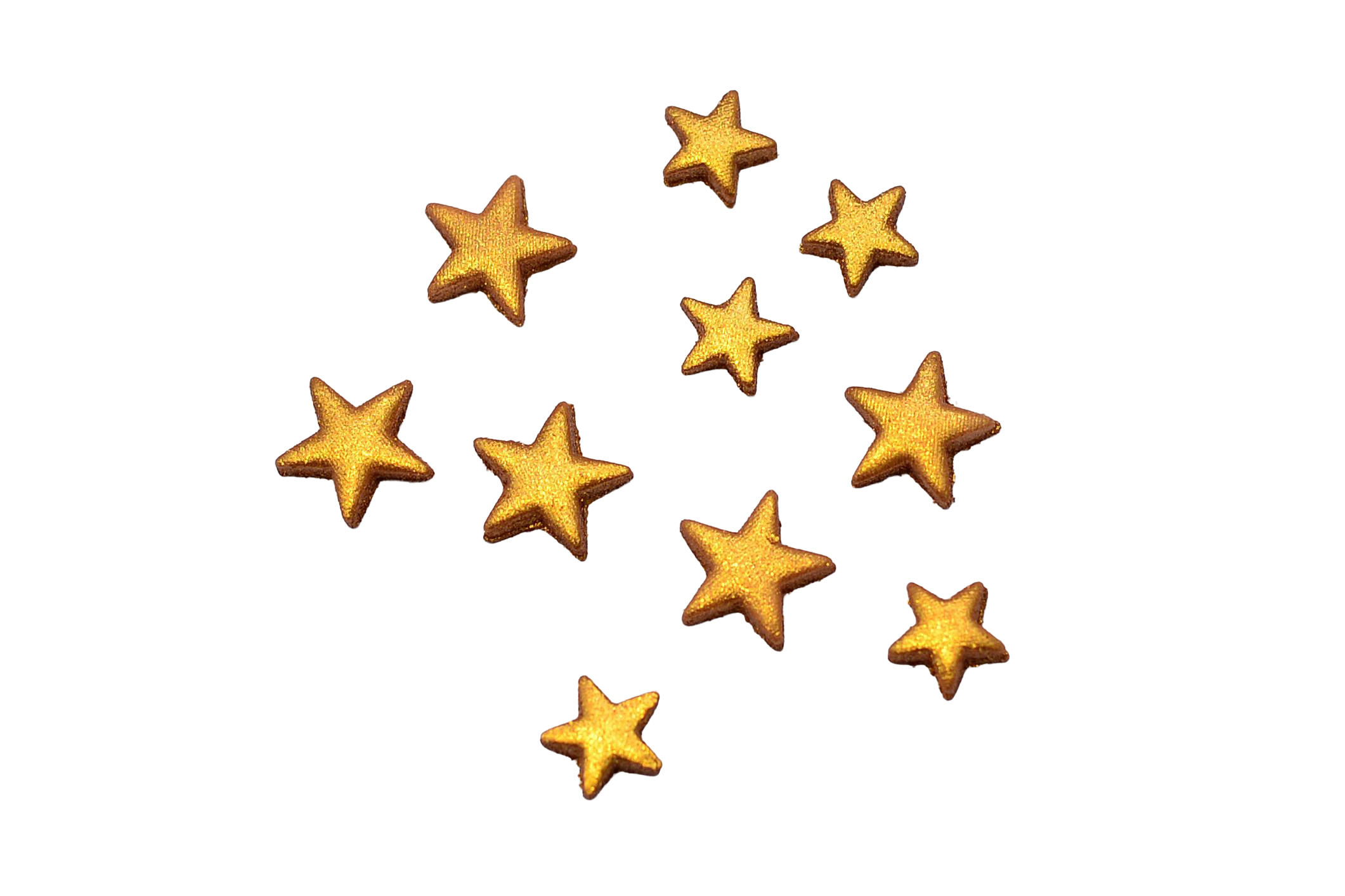 W zestawie 10 sztuk gwiazdek w dwóch rozmiarach (0,7 cm i 1 cm). Gwiazdki pomalowane barwnikiem spożywczym w pięknym złotym kolorze. Pięknie się błyszczą.