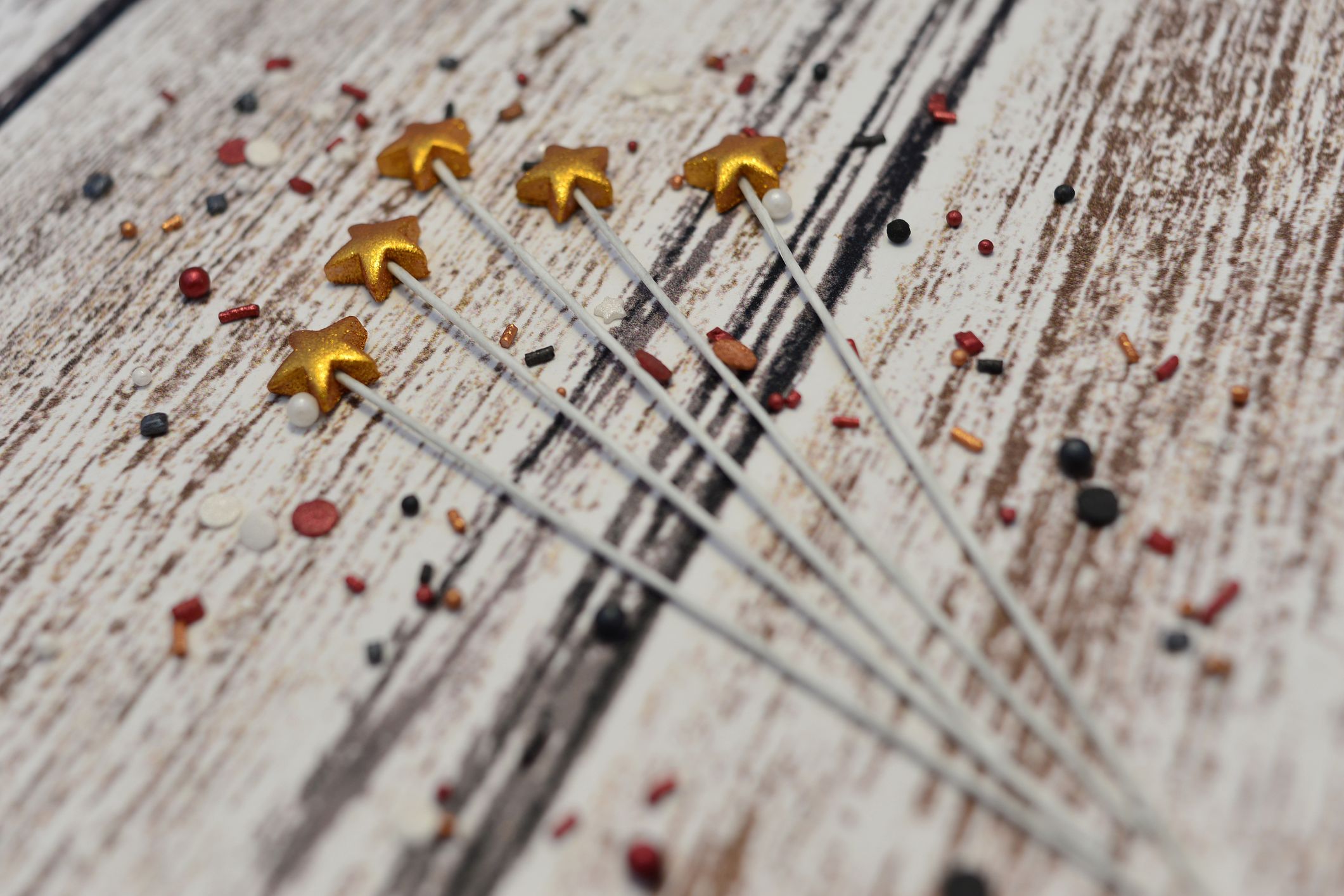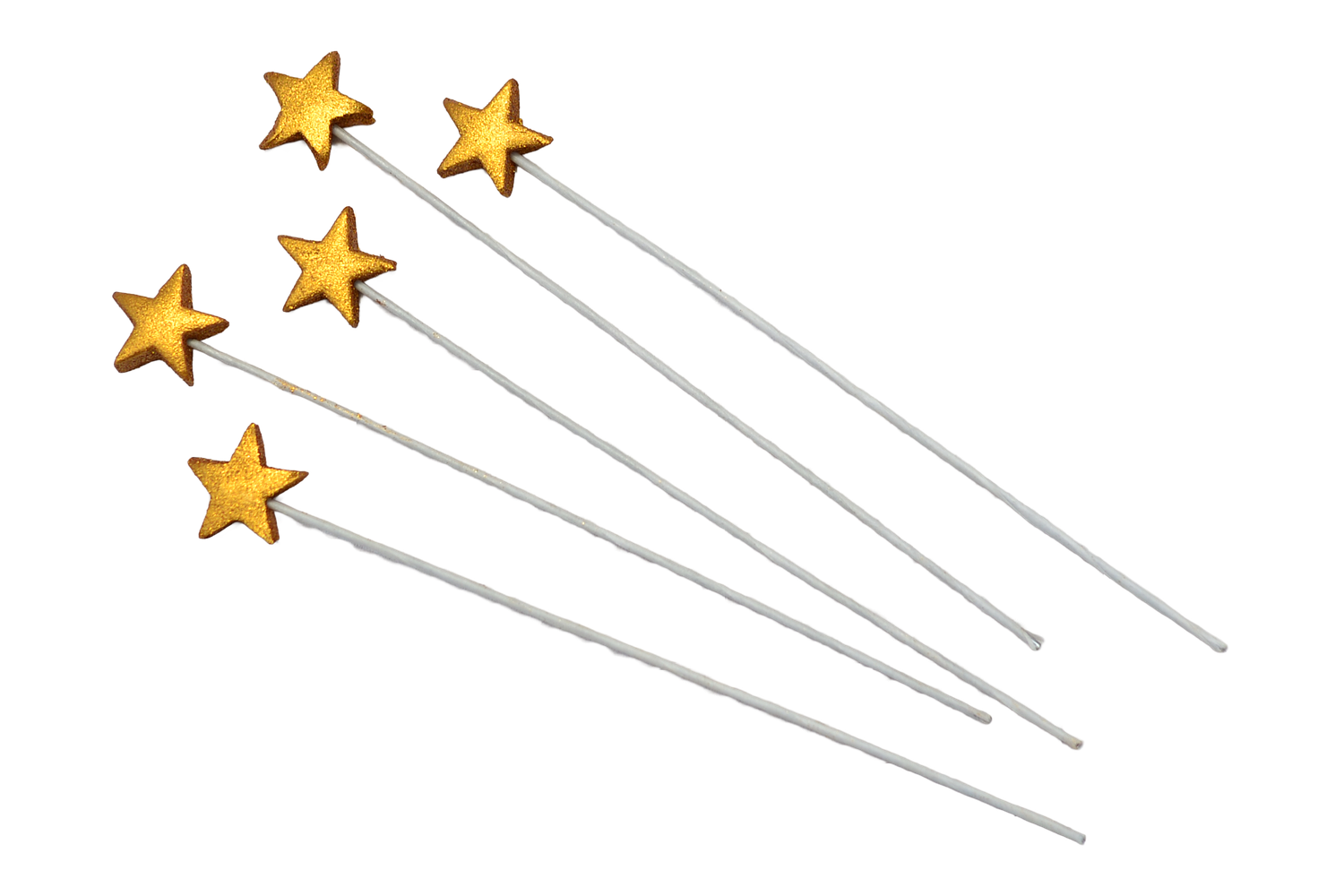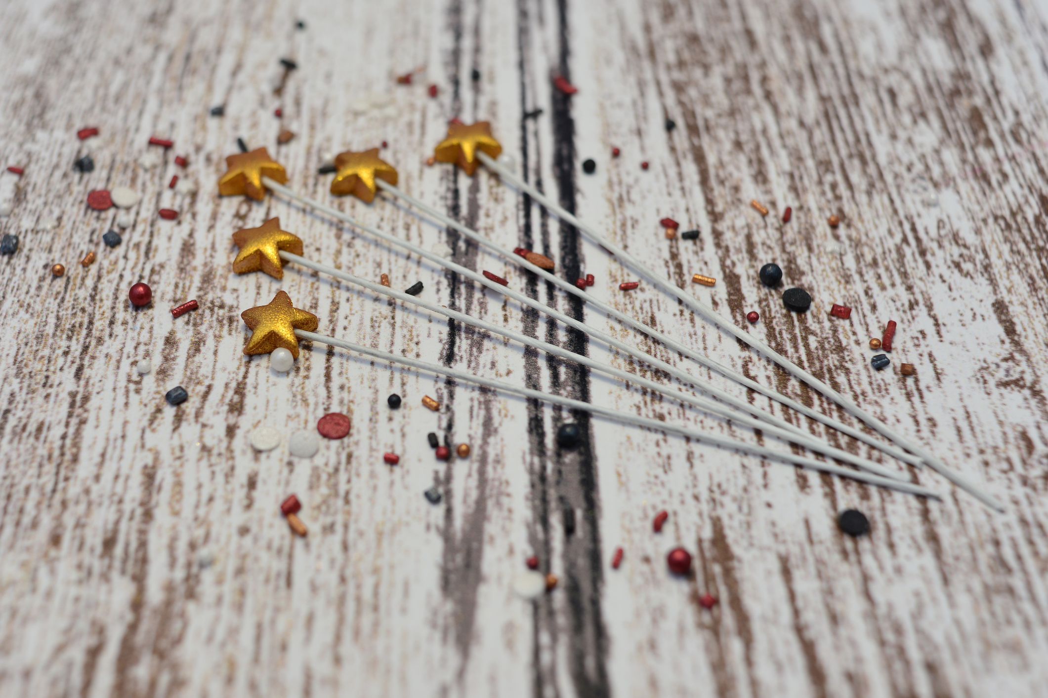 W zestawie 5 sztuk gwiazdek malowanych barwnikiem spożywczym w kolorze złotym, zamocowanych na drucikach do kontaktu z żywnością. Idealnie sprawdzą się jako np. uzupełnienie dekoracji tortu urodzinowego.