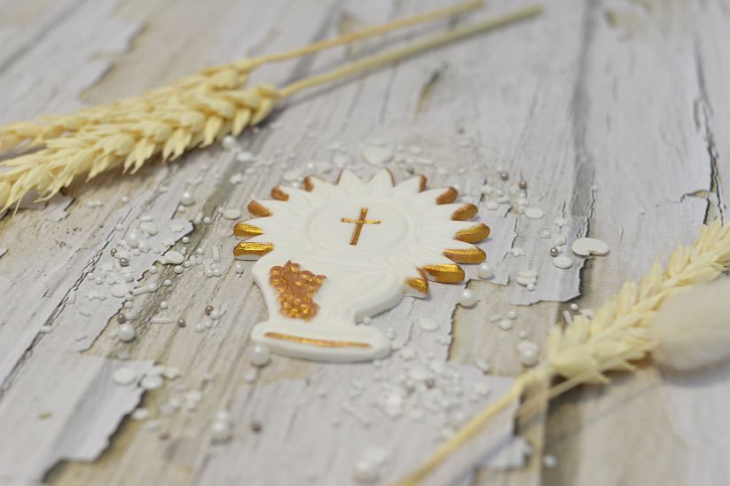 Ręcznie wykonana dekoracja komunijna przedstawiająca kielich z hostią to elegancka i symboliczna ozdoba tortu. Klasyczna biała kolorystyka w połączeniu ze złotymi detalami podkreśla uroczysty charakter dekoracji i doskonale wpisuje się w stylistykę Pierwszej Komunii Świętej.
