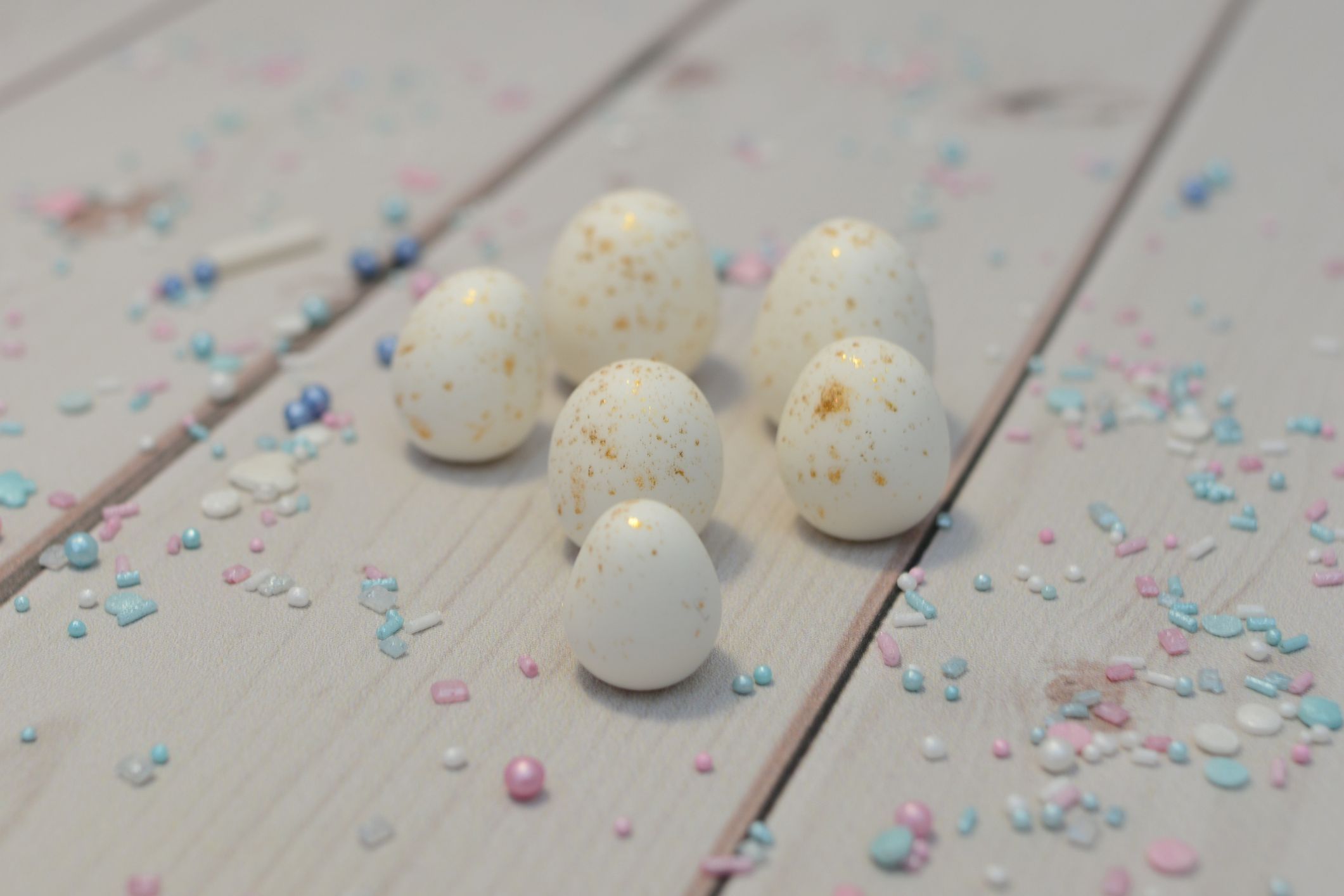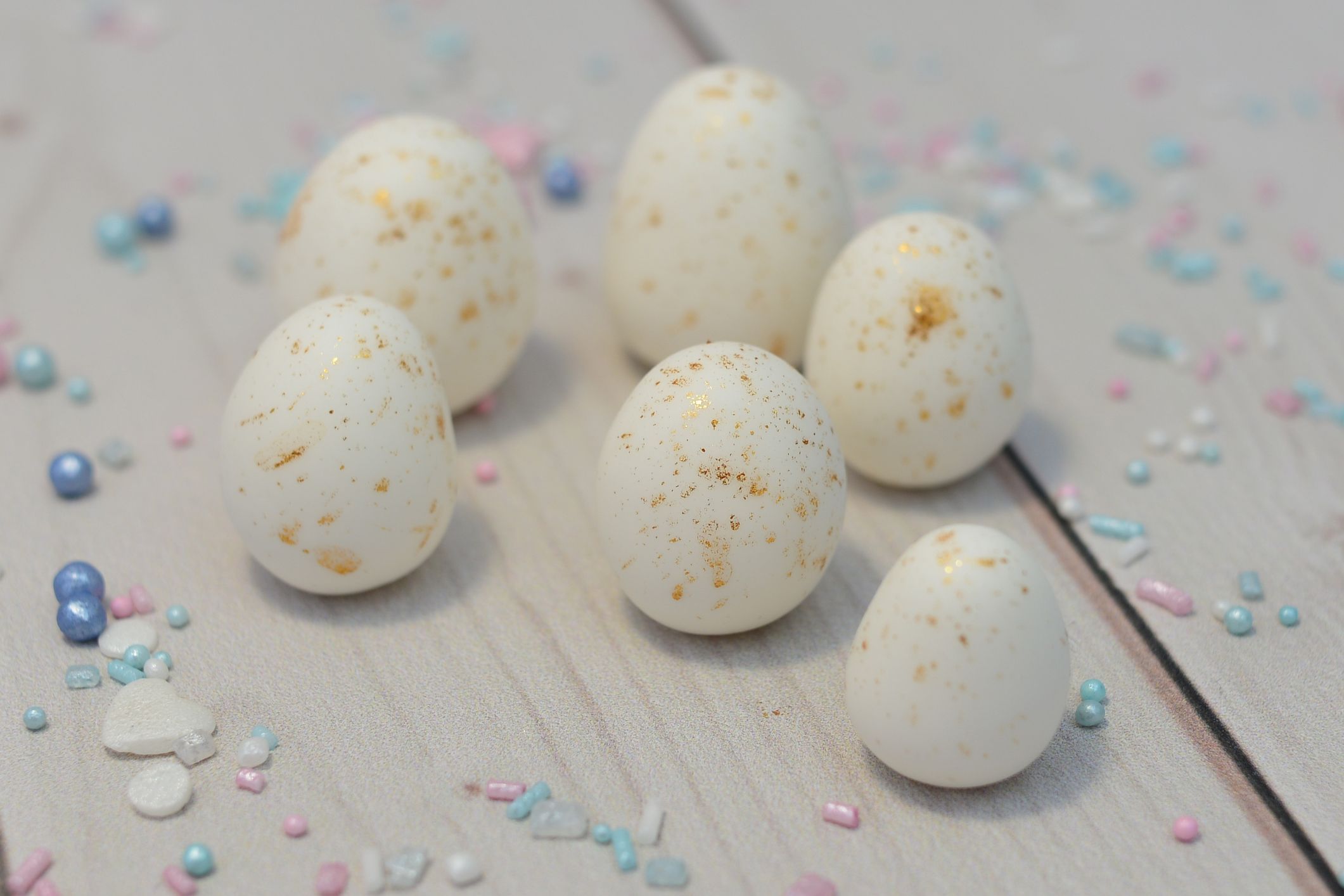 W zestawie 6 szt. białych jajeczek pozłoconych barwnikiem spożywczym, idealnie sprawdzą się jako uzupełnienie dekoracji tortu wielkanocnego, urodzinowego lub innych wypieków.