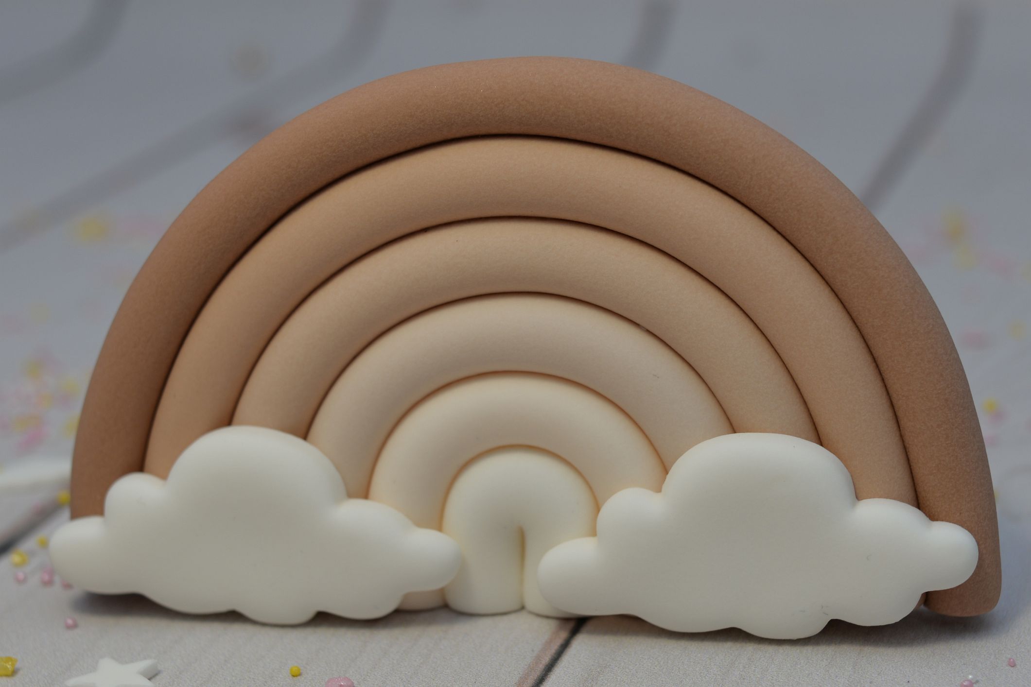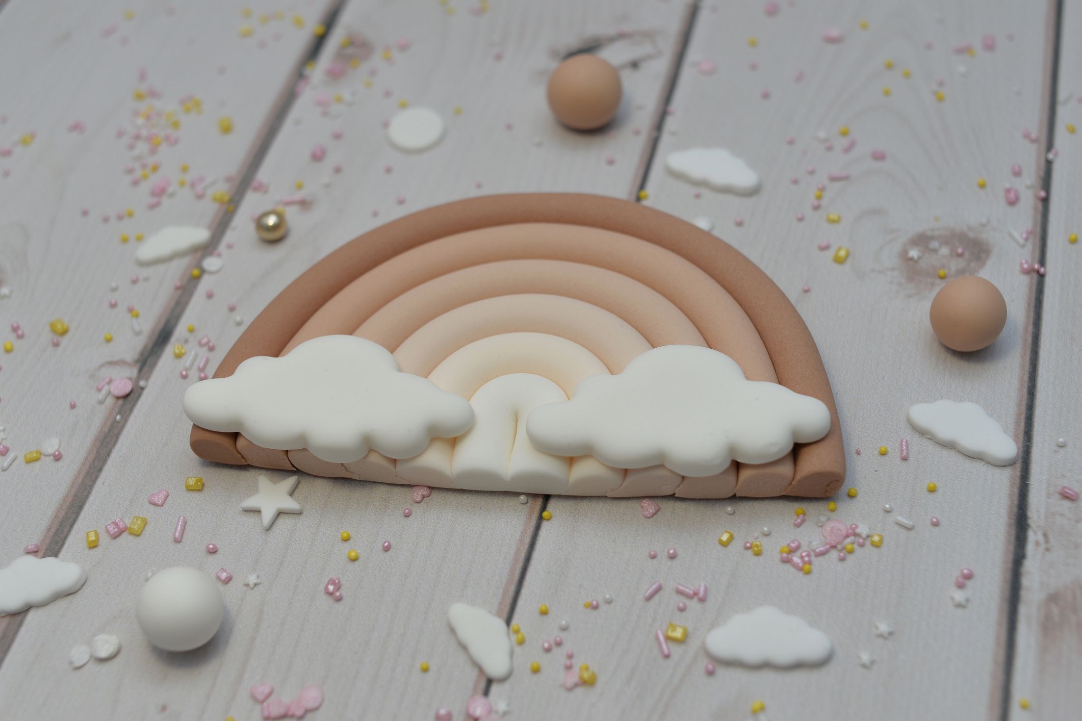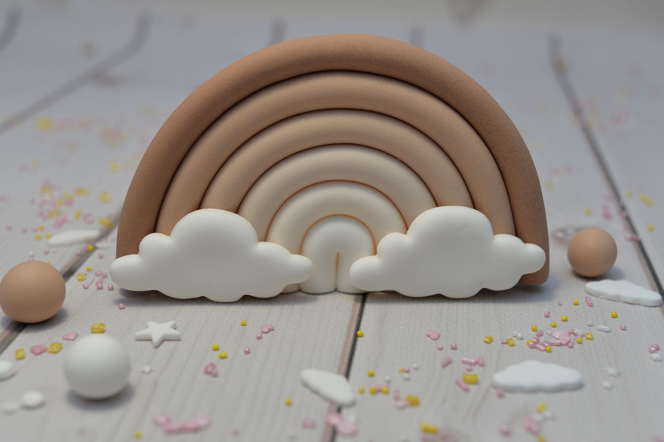 Tęcza wykonana została w przepięknych odcieniach beżu oraz biel, a zdobią ją dodatkowo dwie chmurki, które mają zaoblone brzegi. Dzięki temu całość dekoracji wygląda lekko i niebiańsko.