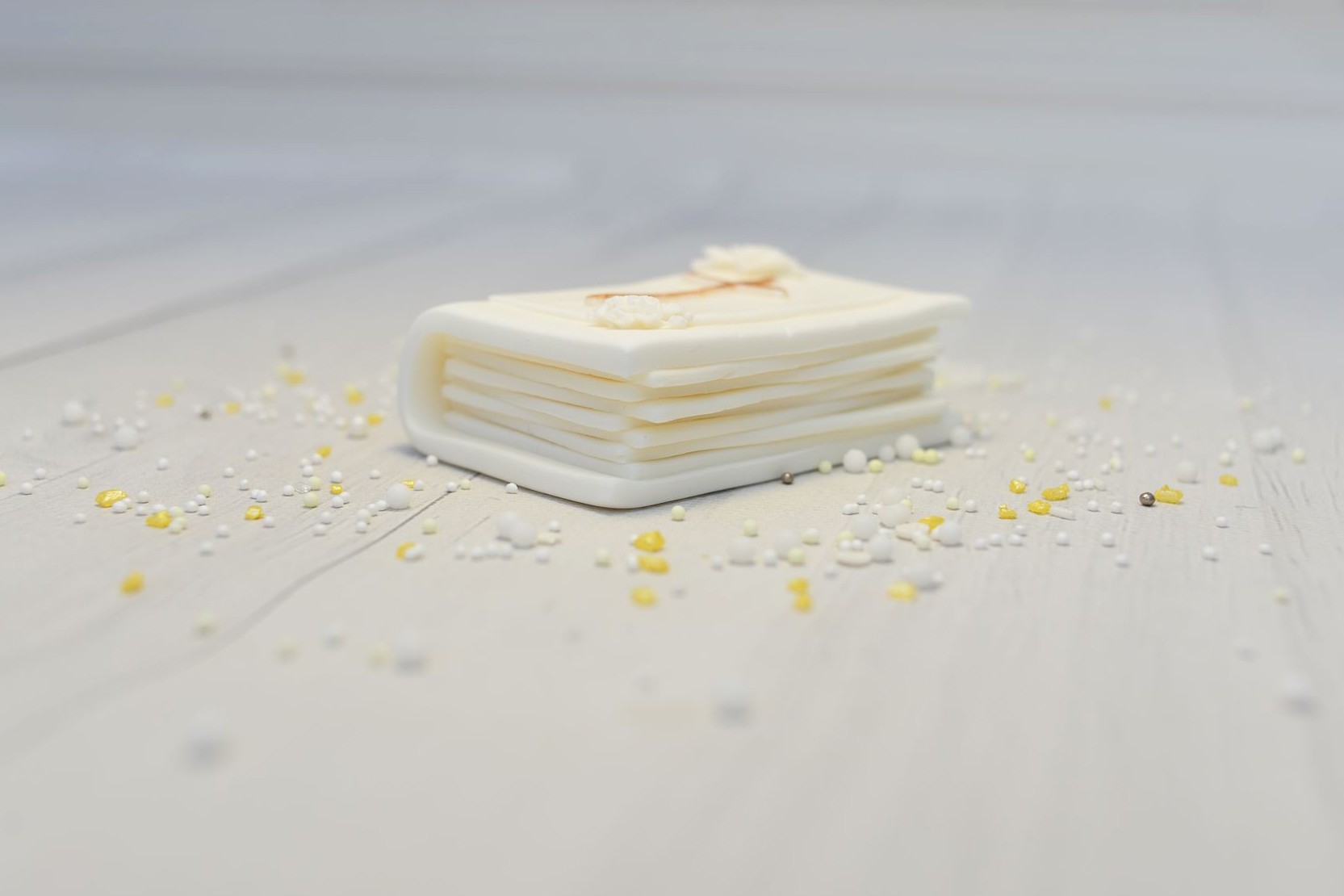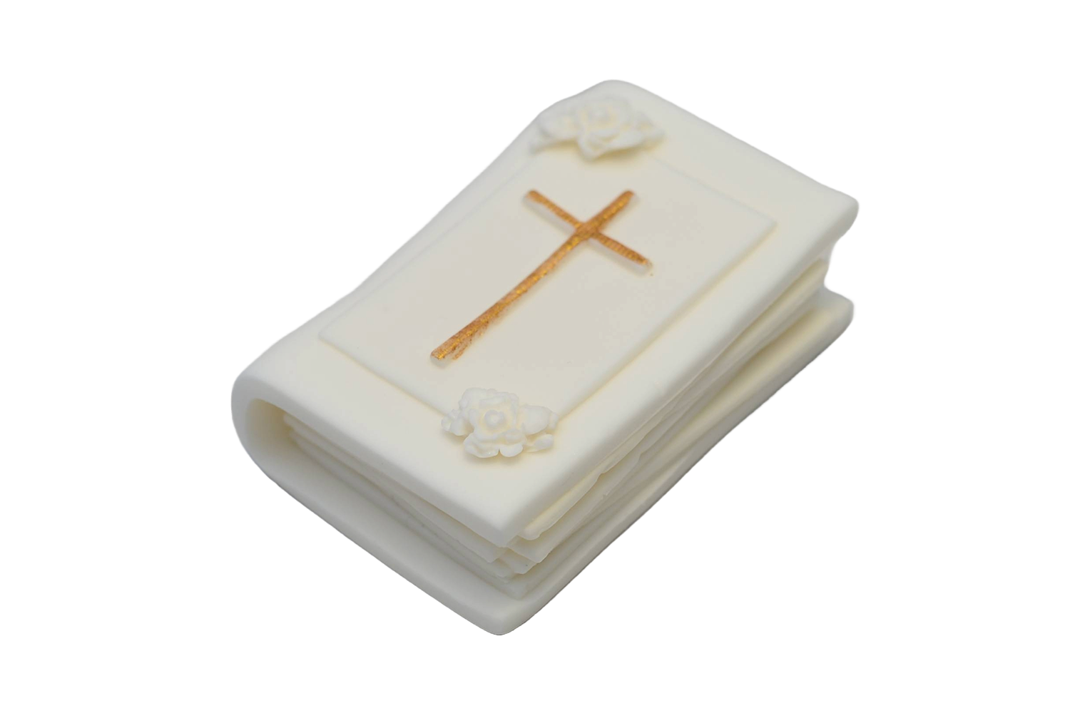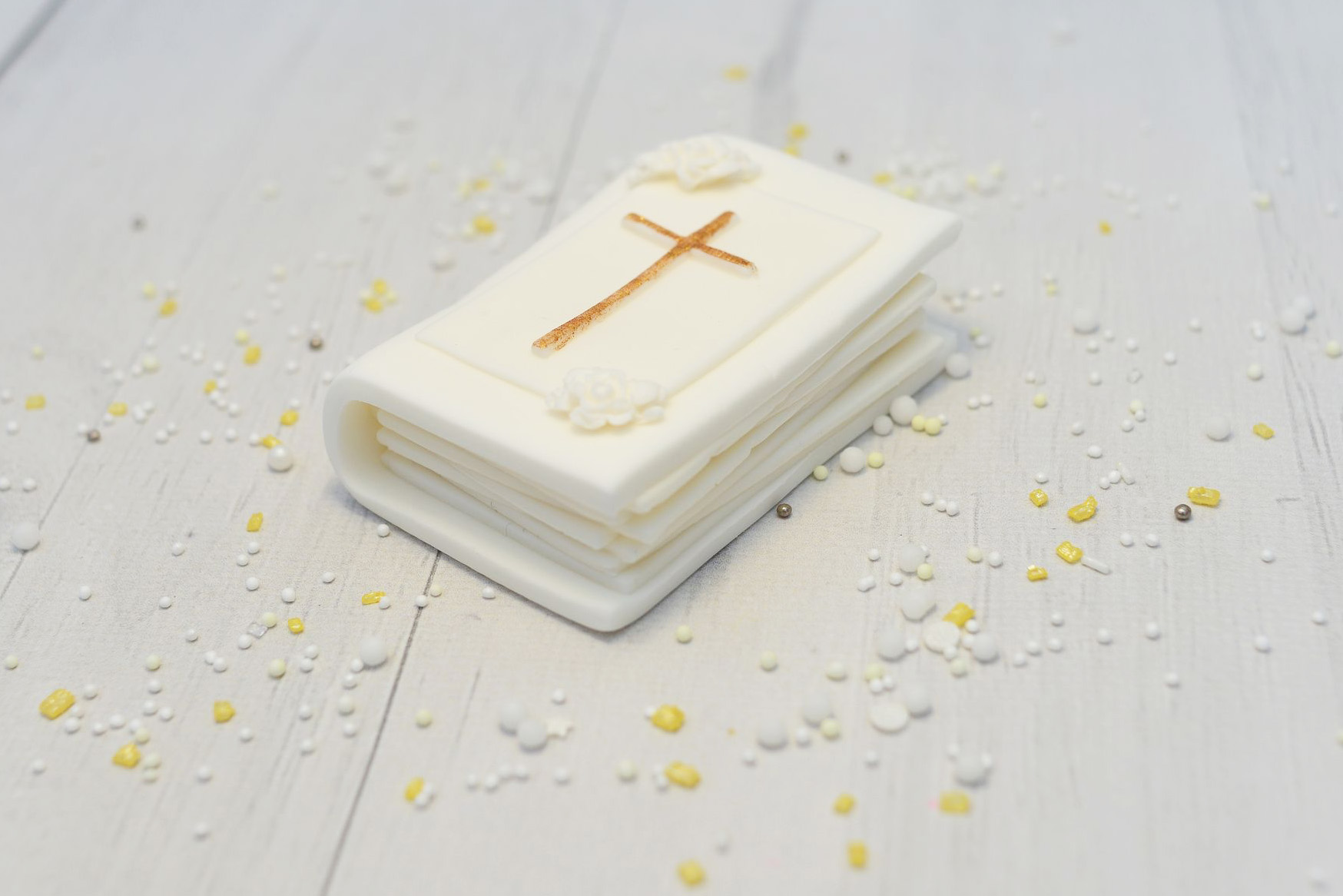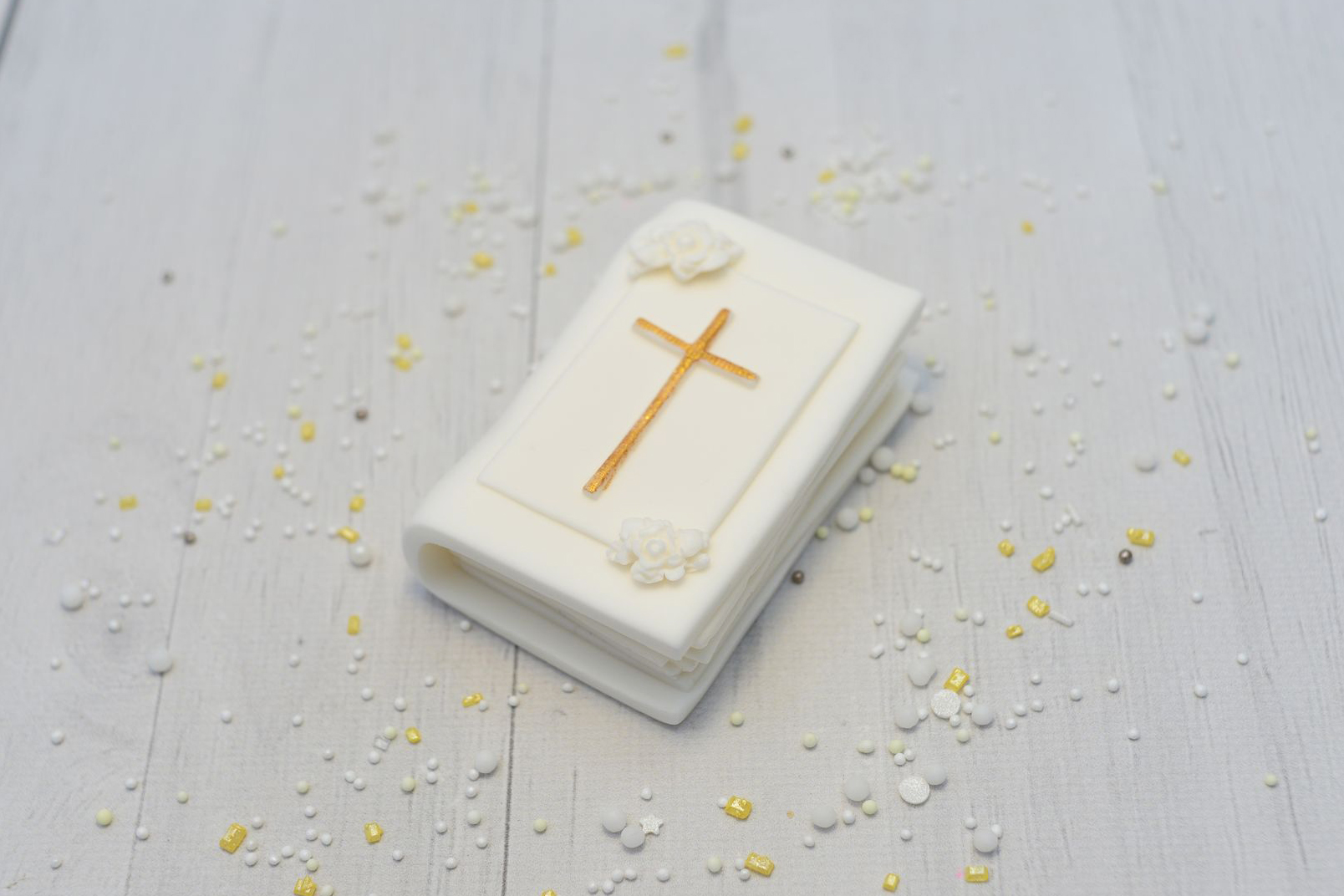 Ręcznie wykonana dekoracja w kształcie księgi z delikatnym złotym krzyżem to subtelna i elegancka ozdoba tortu komunijnego. Jasna kolorystyka oraz minimalistyczne zdobienia podkreślają uroczysty charakter dekoracji i doskonale wpisują się w stylistykę Pierwszej Komunii Świętej.