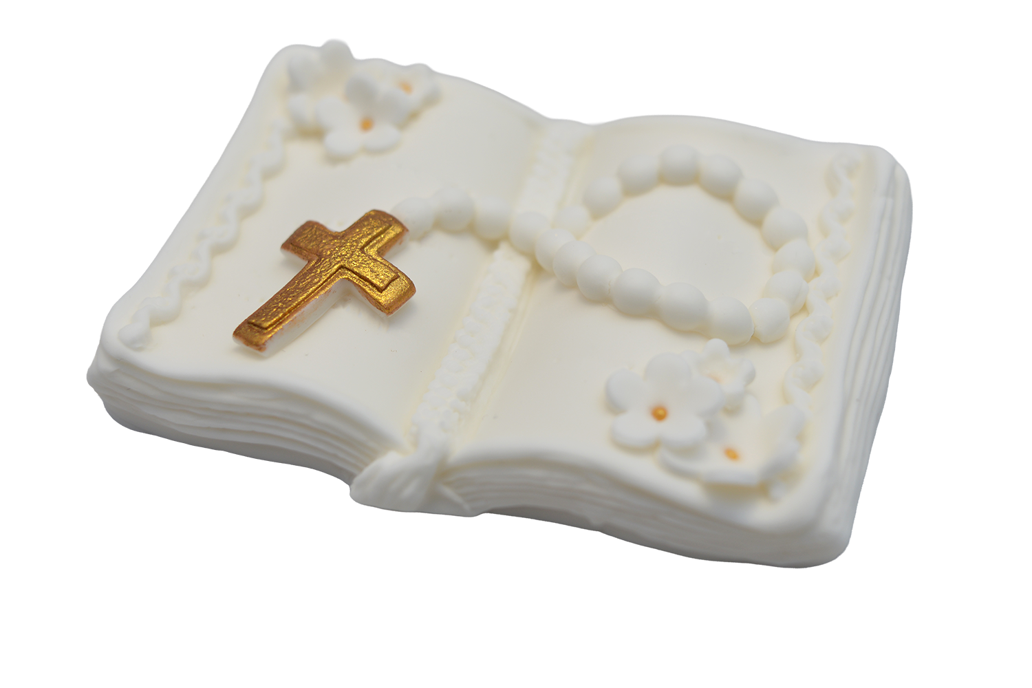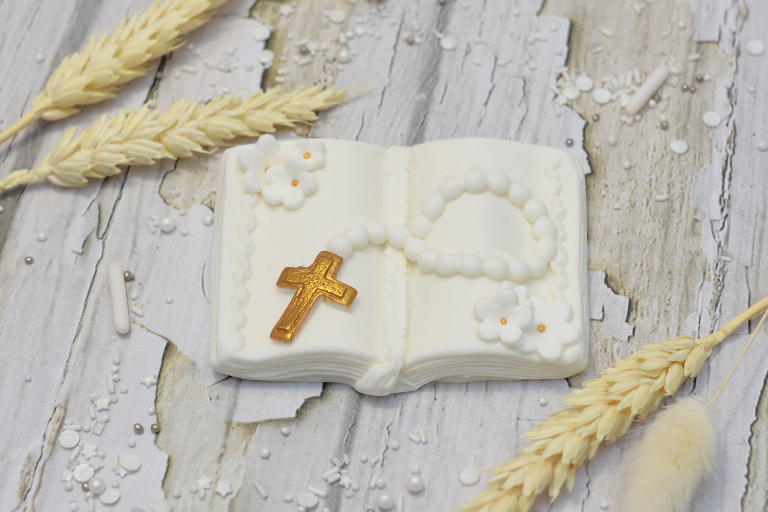 Ręcznie wykonana dekoracja w kształcie otwartej księgi z krzyżem i różańcem to elegancka i symboliczna ozdoba tortu komunijnego. Subtelna, jasna kolorystyka oraz delikatne detale nadają całości wyjątkowo uroczysty i spokojny charakter.