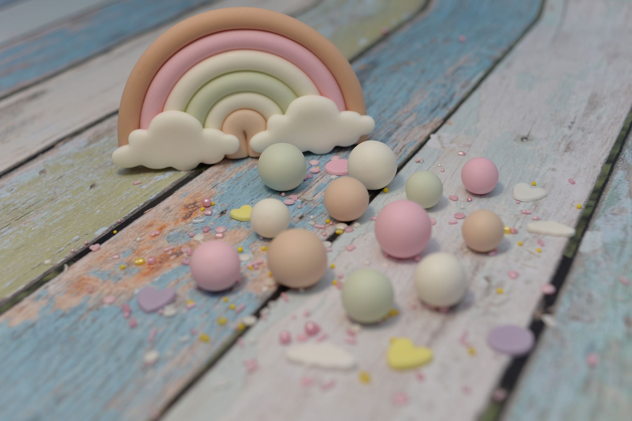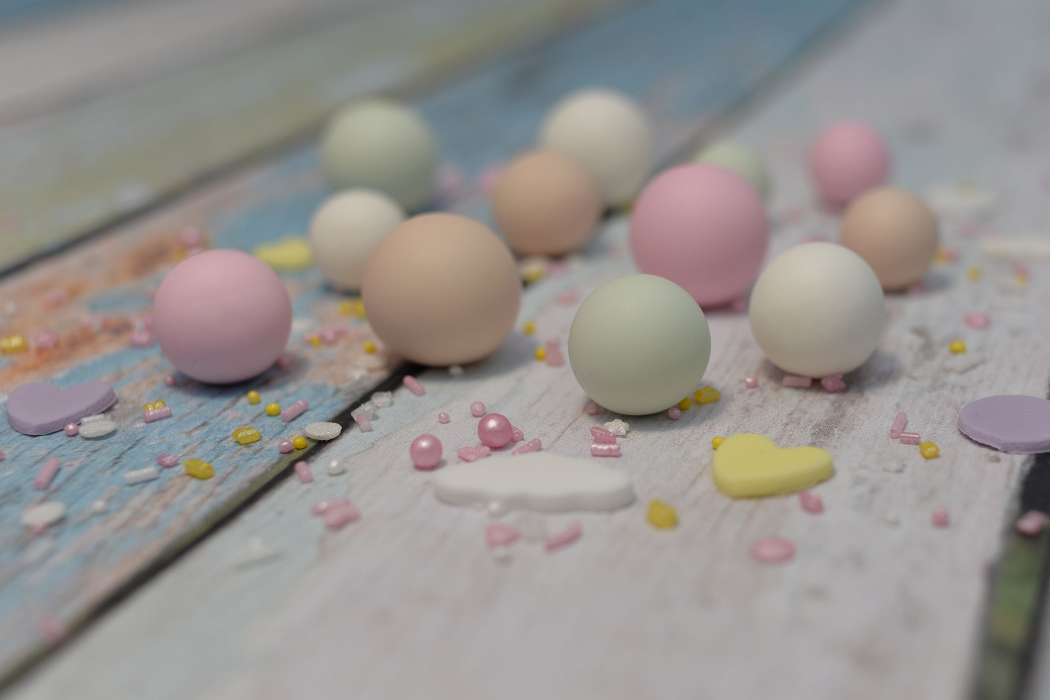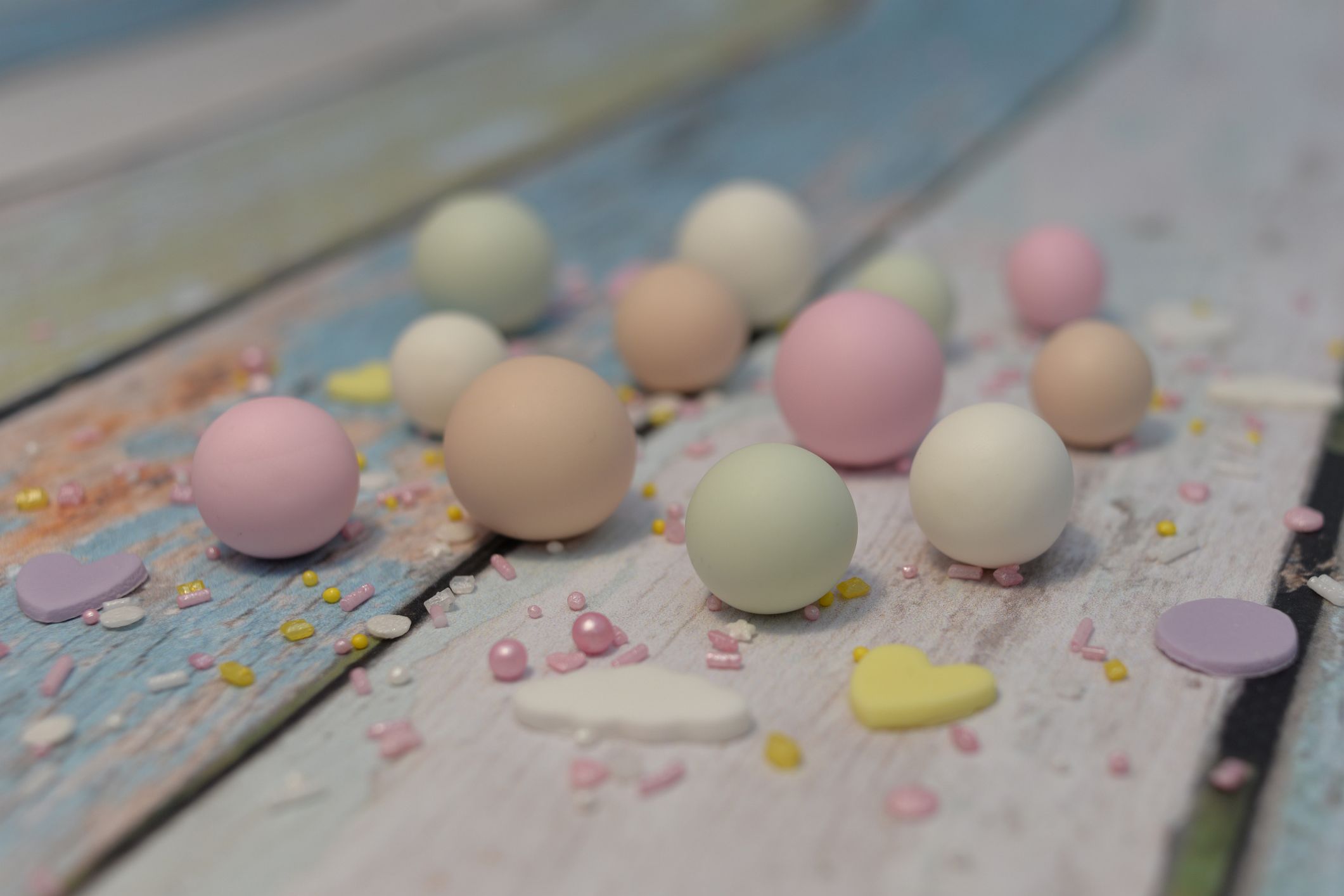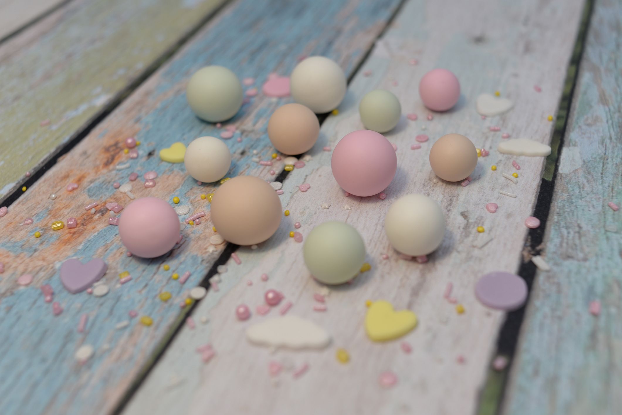 W zestawie 12 szt kuleczek w pastelowych kolorach: jasna zieleń, róż, beż oraz biel. Idealnie sprawdzą się jako np. uzupełnienie dekoracji tortu urodzinowego, czy babeczek.