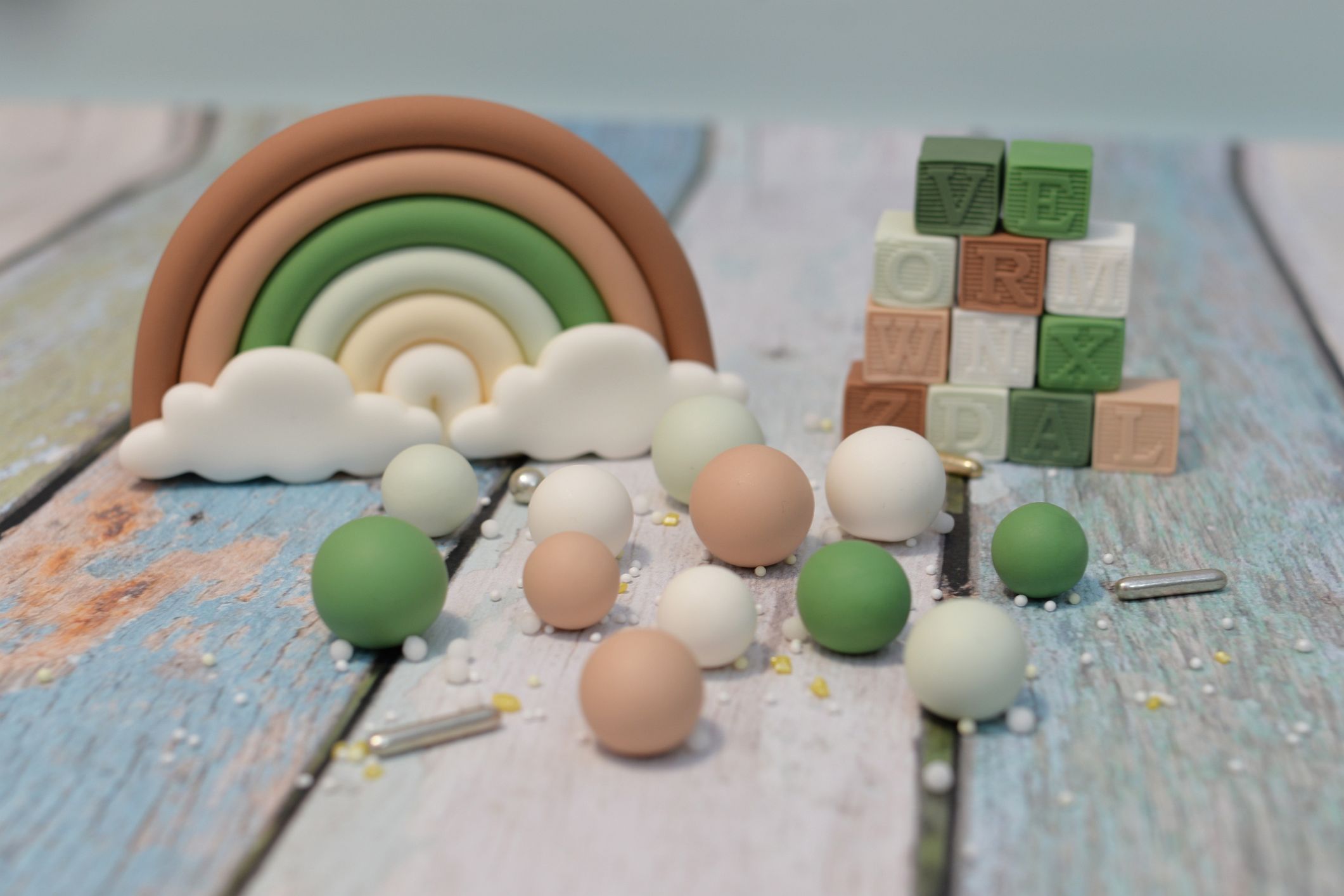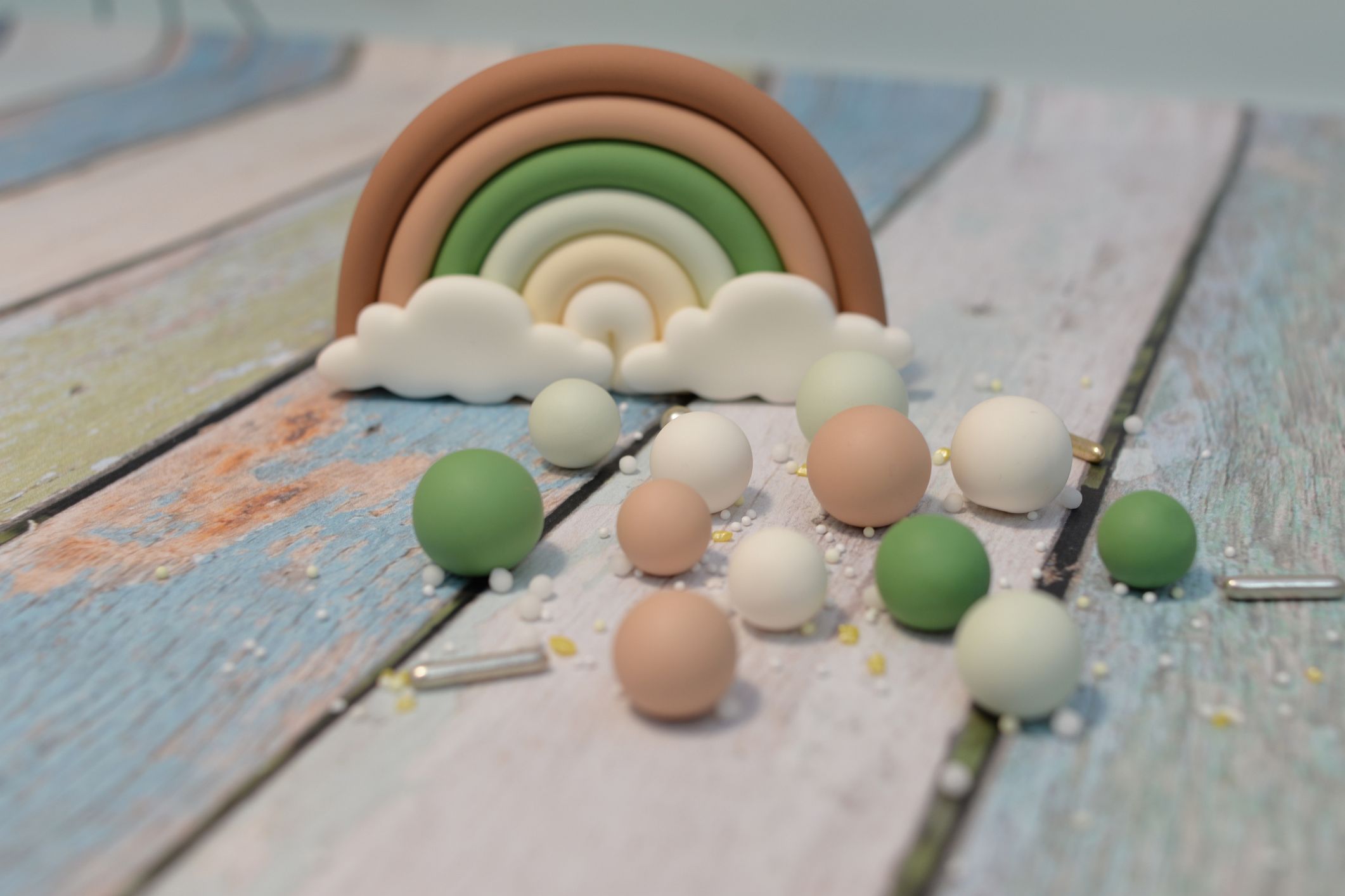 W zestawie 12 szt kuleczek w dwóch odcieniach zieleni, beż oraz biel. Idealnie sprawdzą się jako np. uzupełnienie dekoracji tortu urodzinowego, czy babeczek.