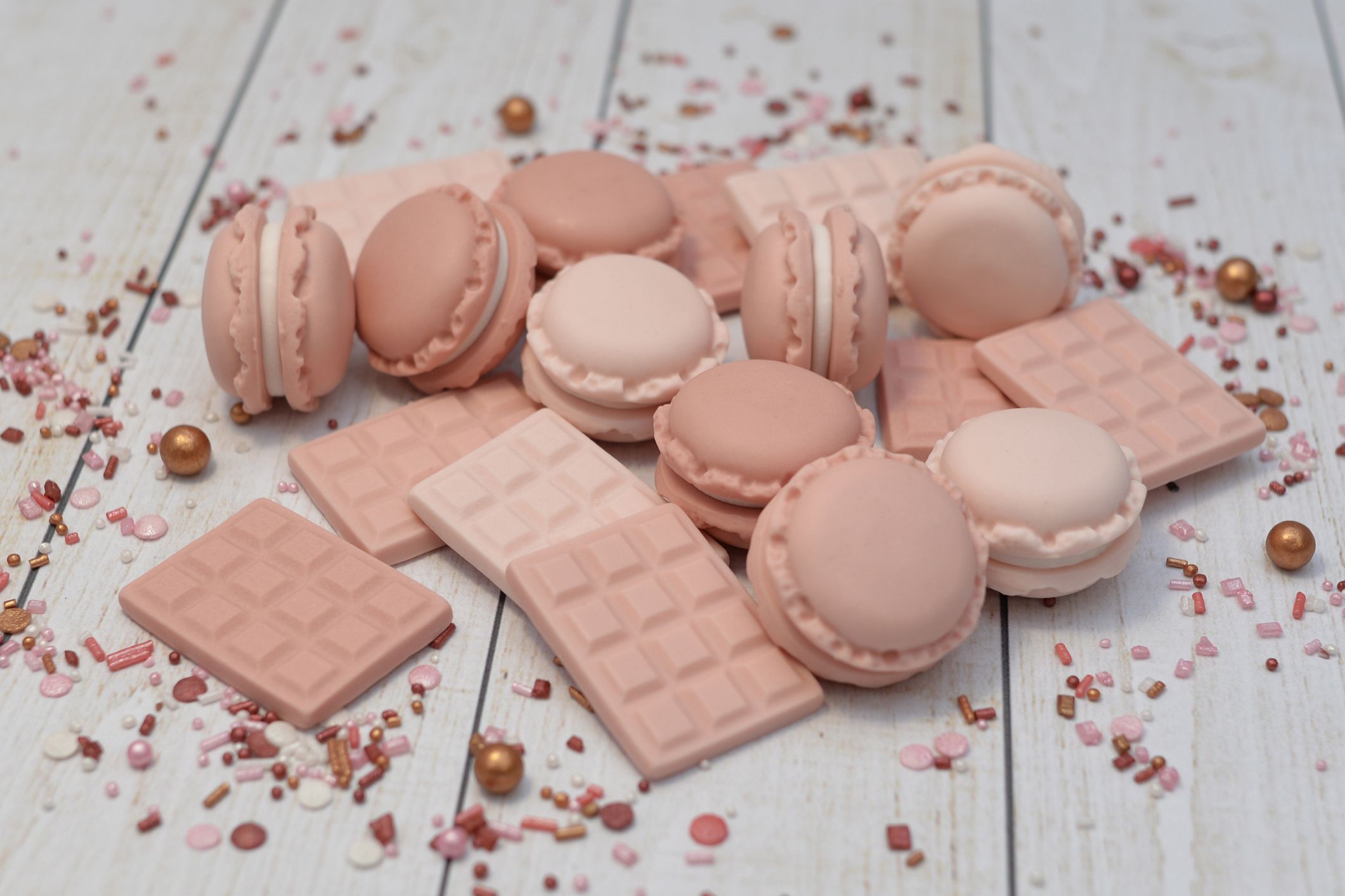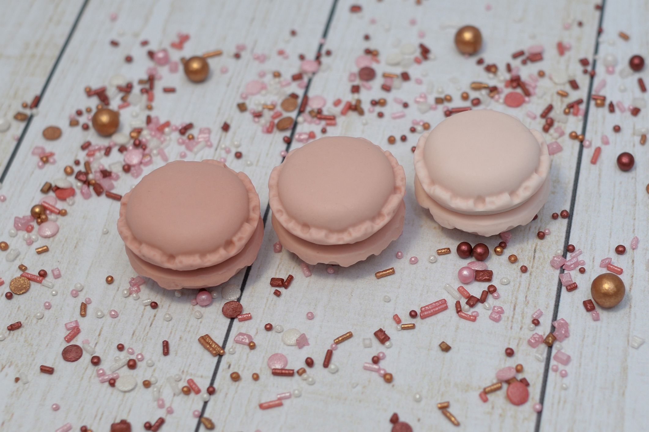 Prezentujemy Ci trzy wyjątkowe sztuki makaroników wykonanych w całości z masy cukrowej w trzech odcieniach bladego różu. To drobne, ale niezwykle urocze dekoracje, które dodadzą wyjątkowego uroku Twoim słodkim kreacjom.