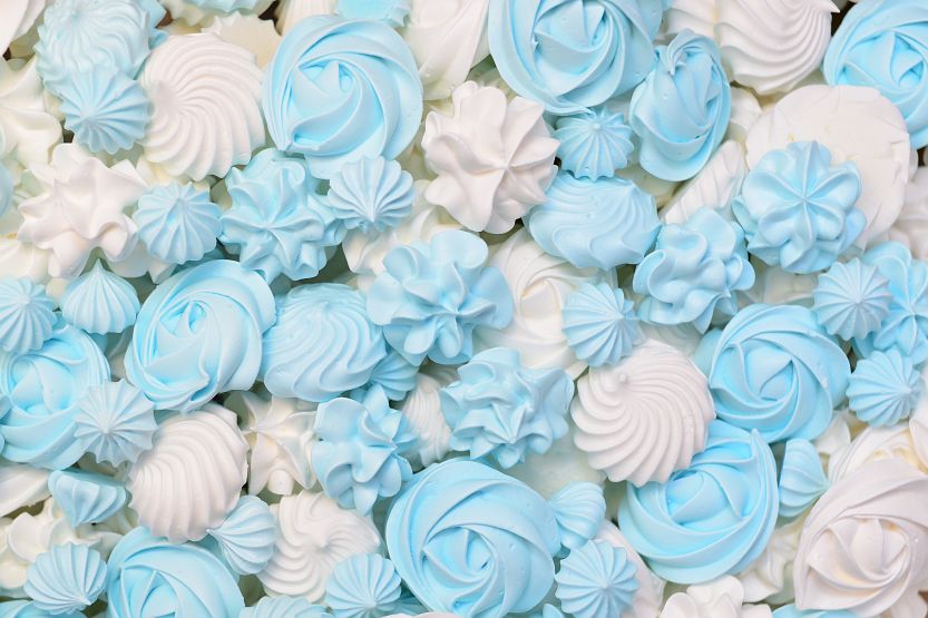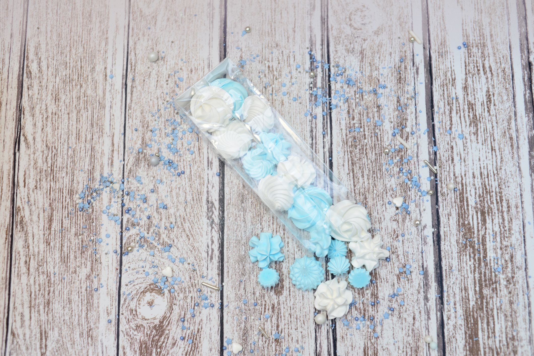 4 x duża beza w kształcie róży, około 4-4,5 cm. Dwie w kolorze białym, dwie w kolorze niebieskim