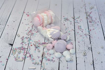 Skład: cukier, białko jaja kurzego, barwniki spożywcze (E122, E133)
