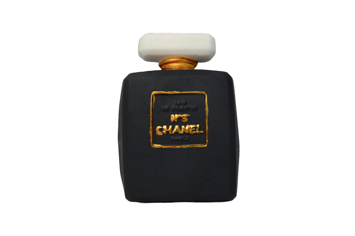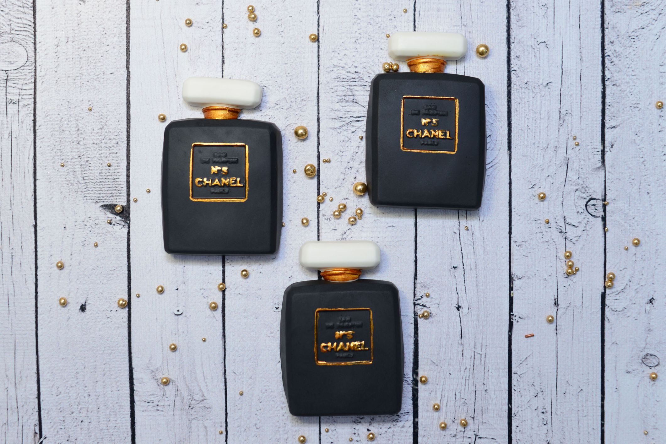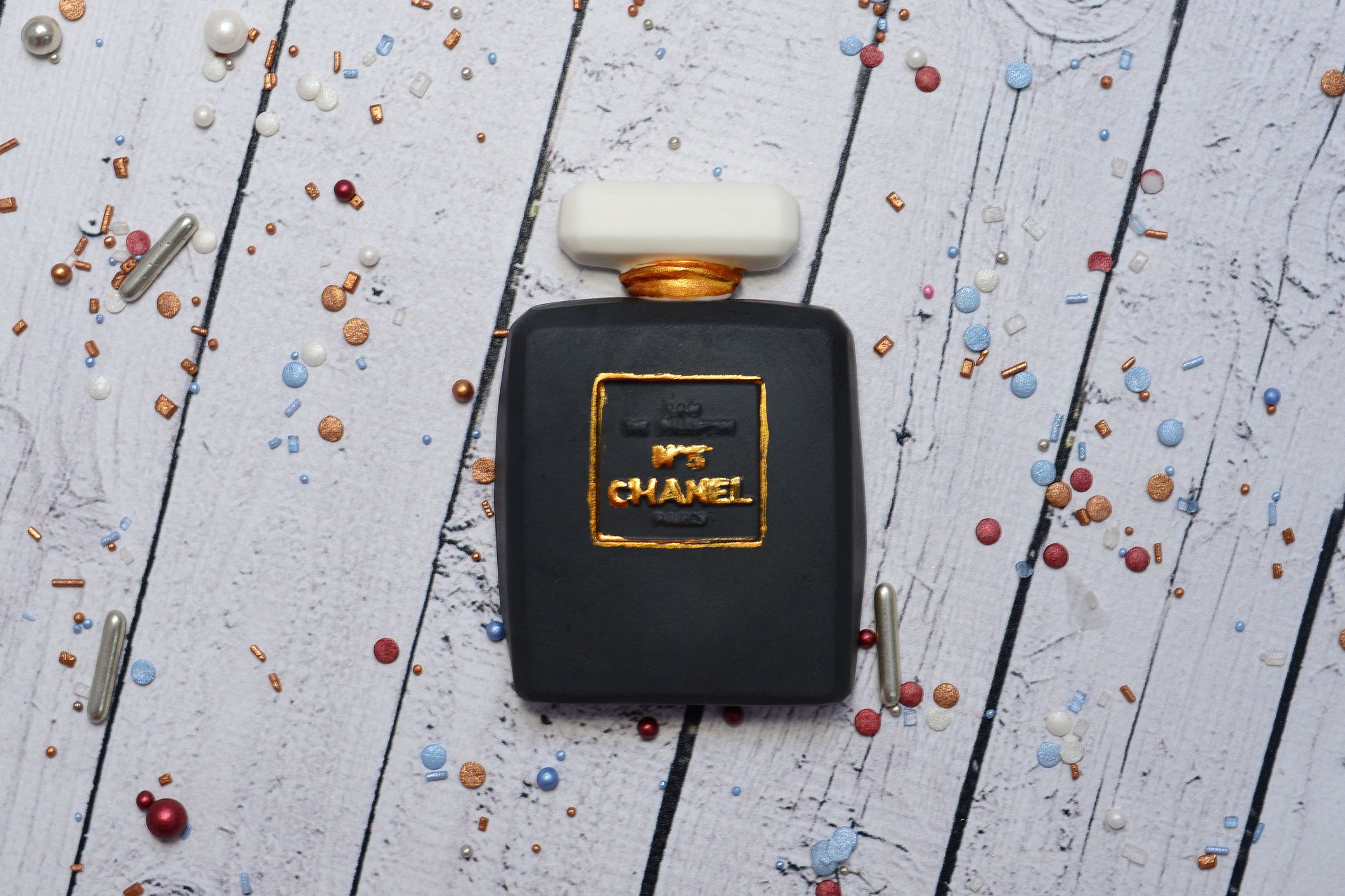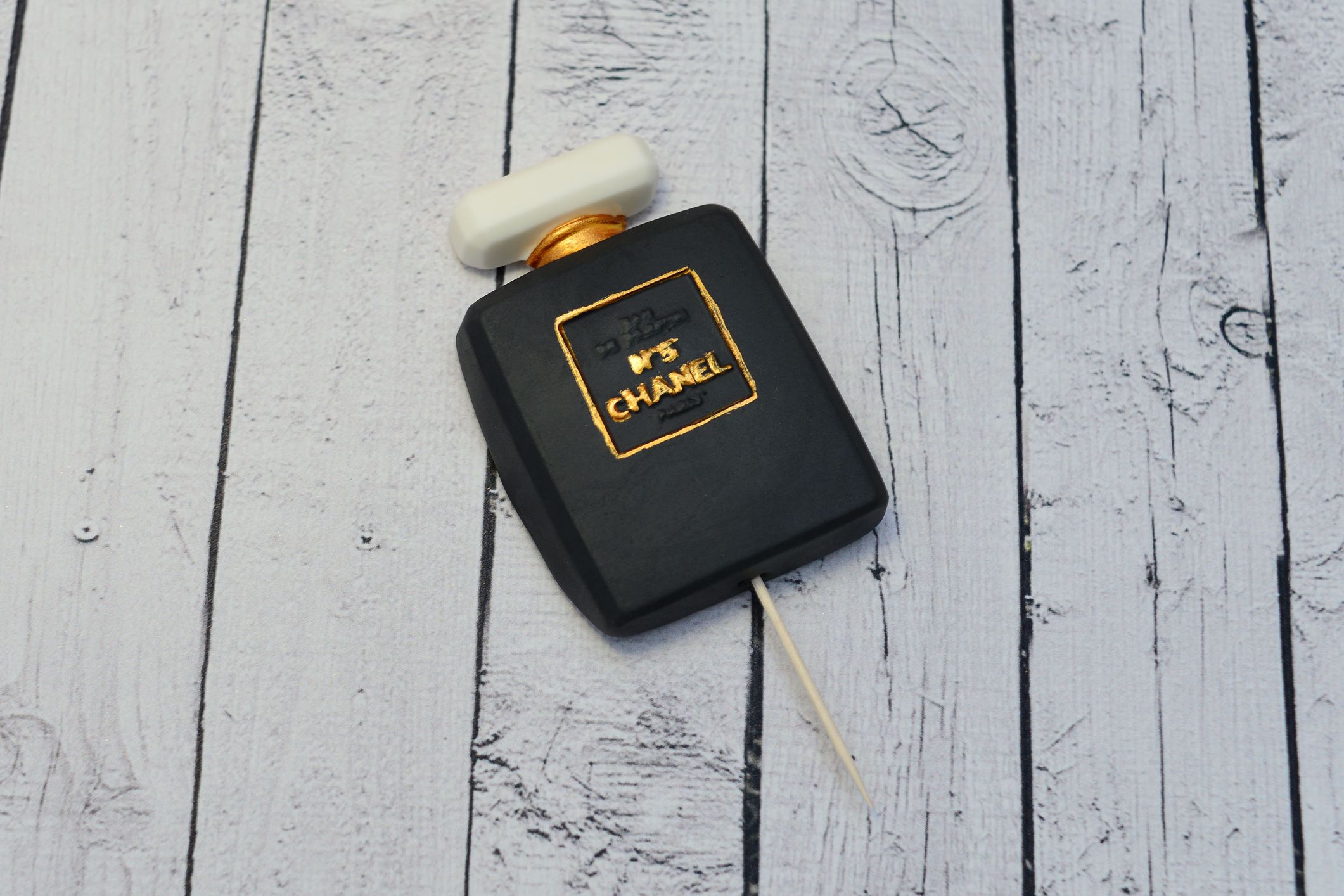 Dekoracja z masy cukrowej, czarne perfumy. Prosty i elegancki wzór sprawia, że dekoracja dobrze prezentuje się na tortach urodzinowych i tematycznych.