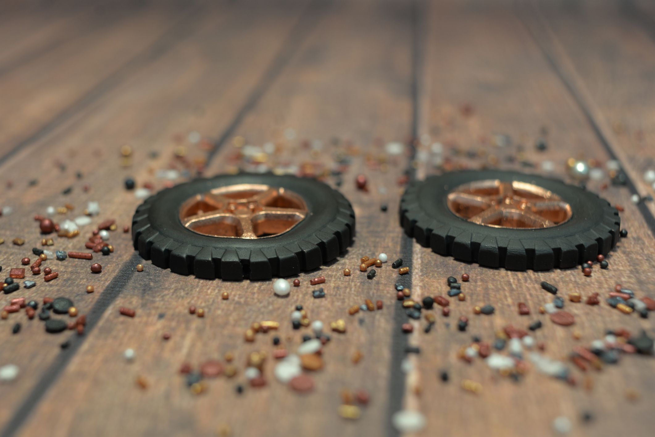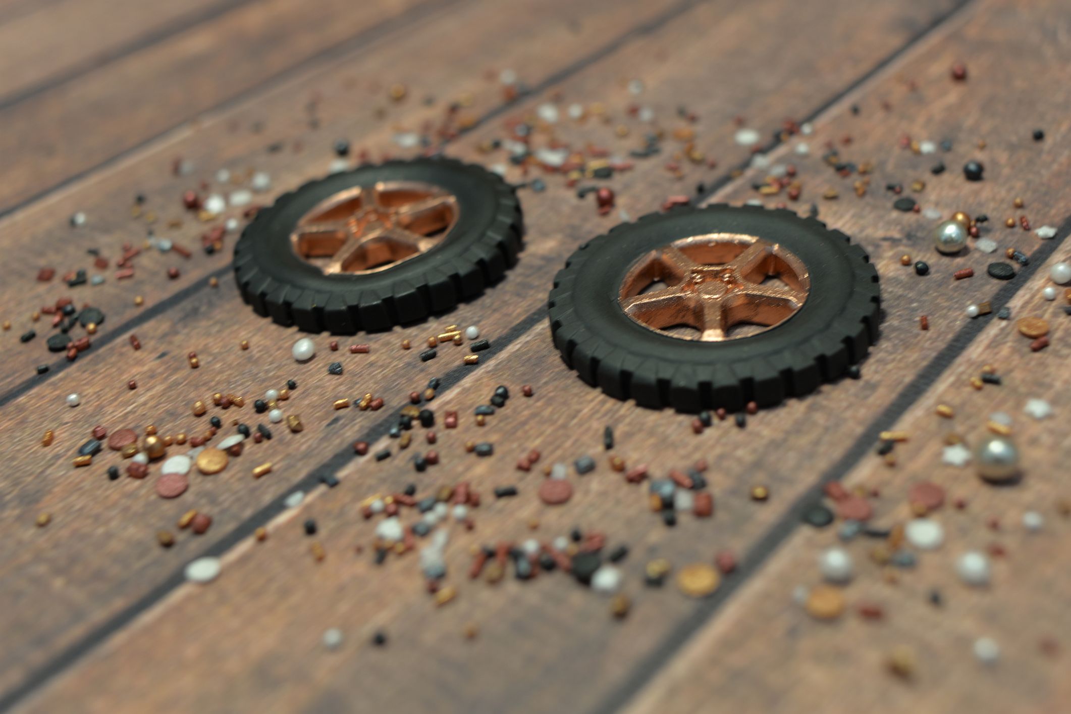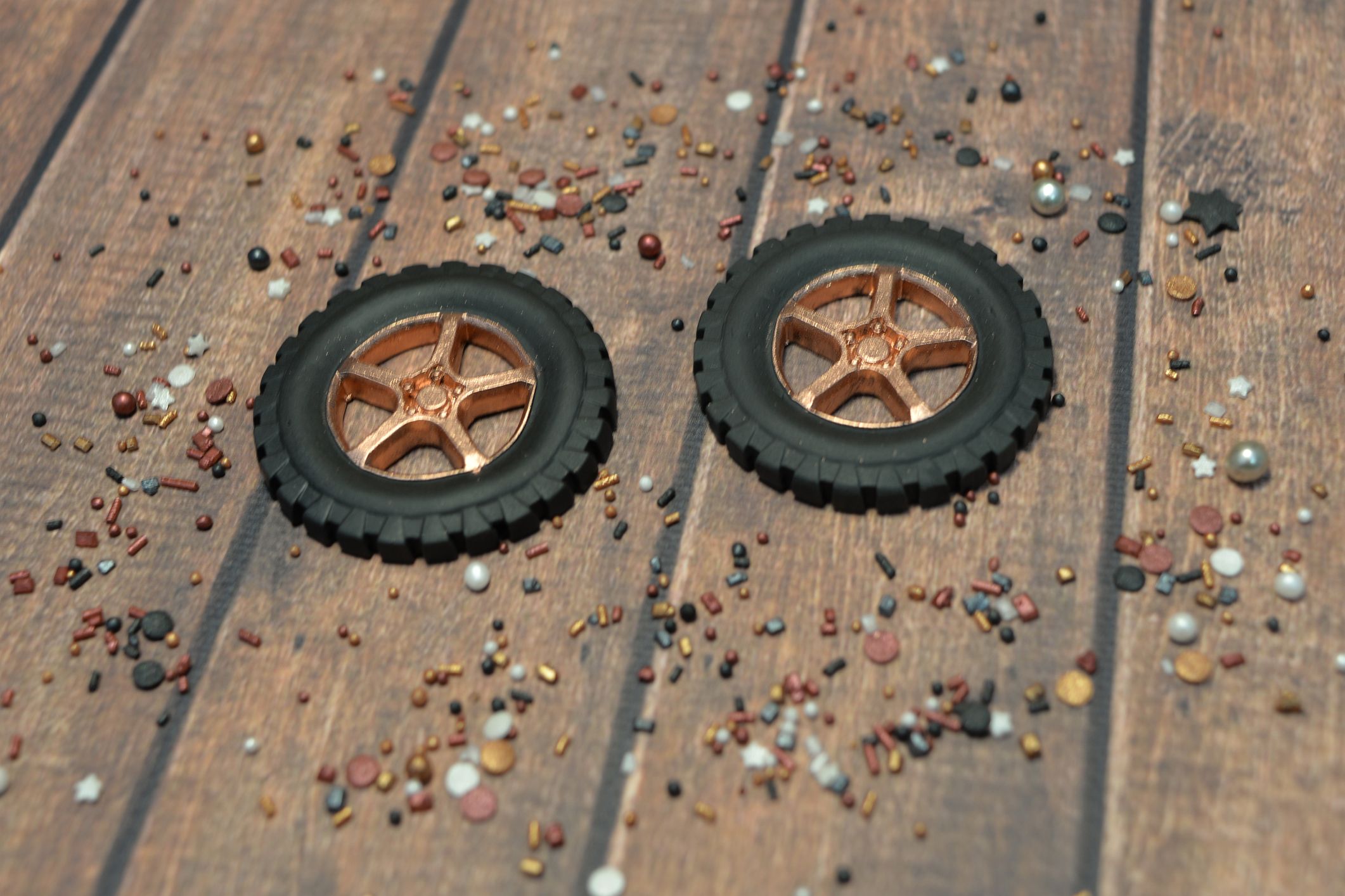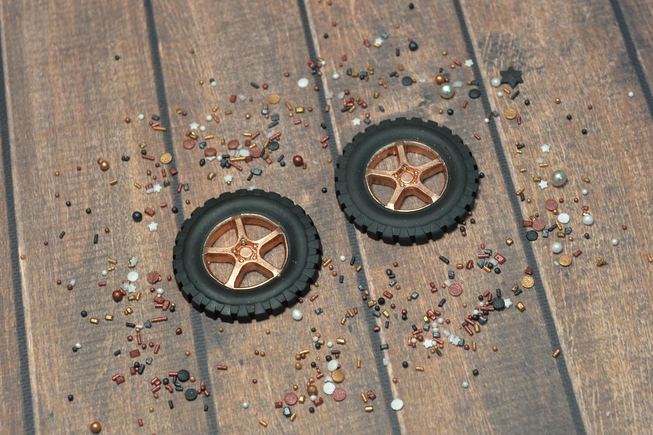 Wspaniała dekoracja tortu dla fana motoryzacji. Przedstawiamy 2 szt czarnych kół z felgami pomalowanymi złotym barwnikiem.