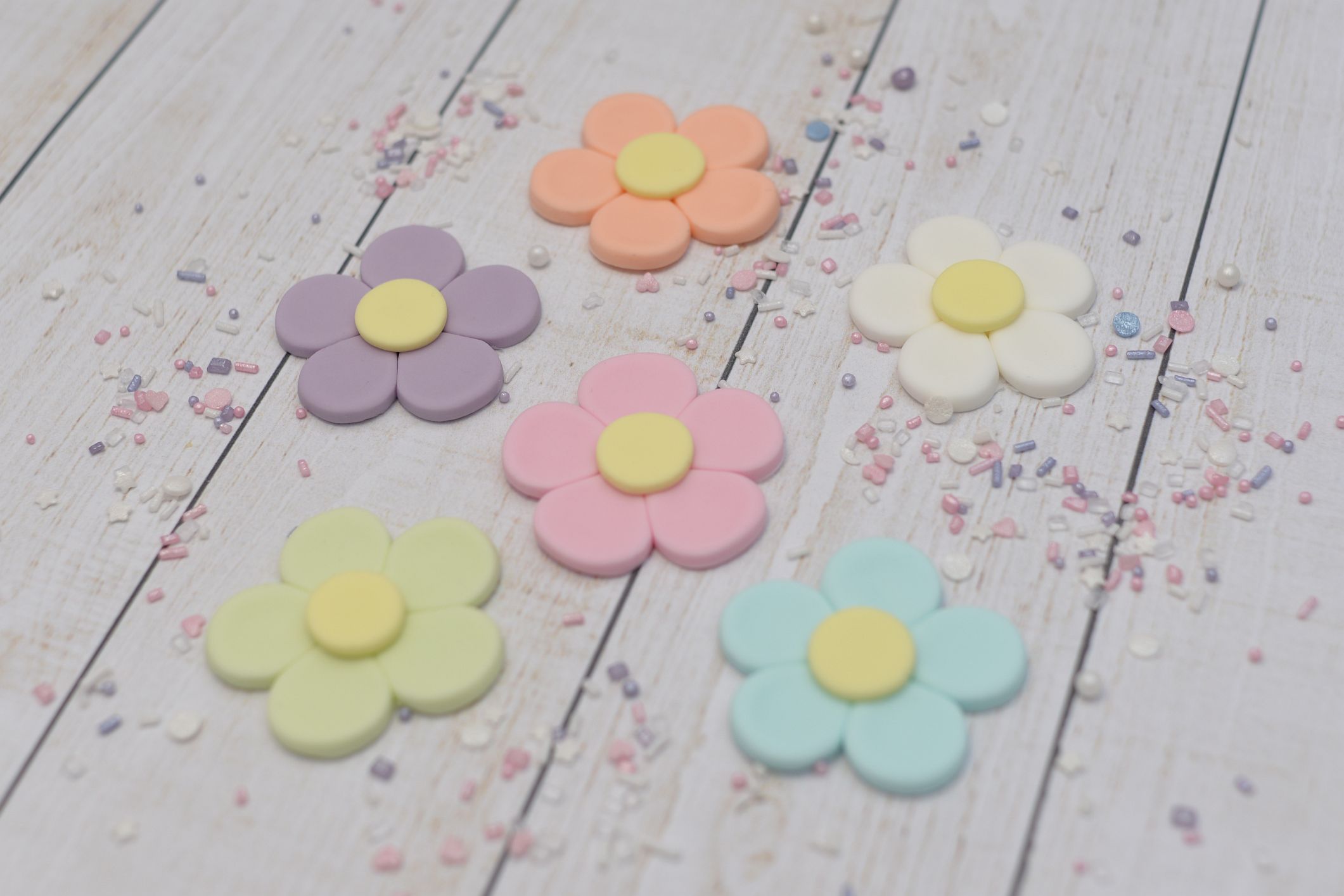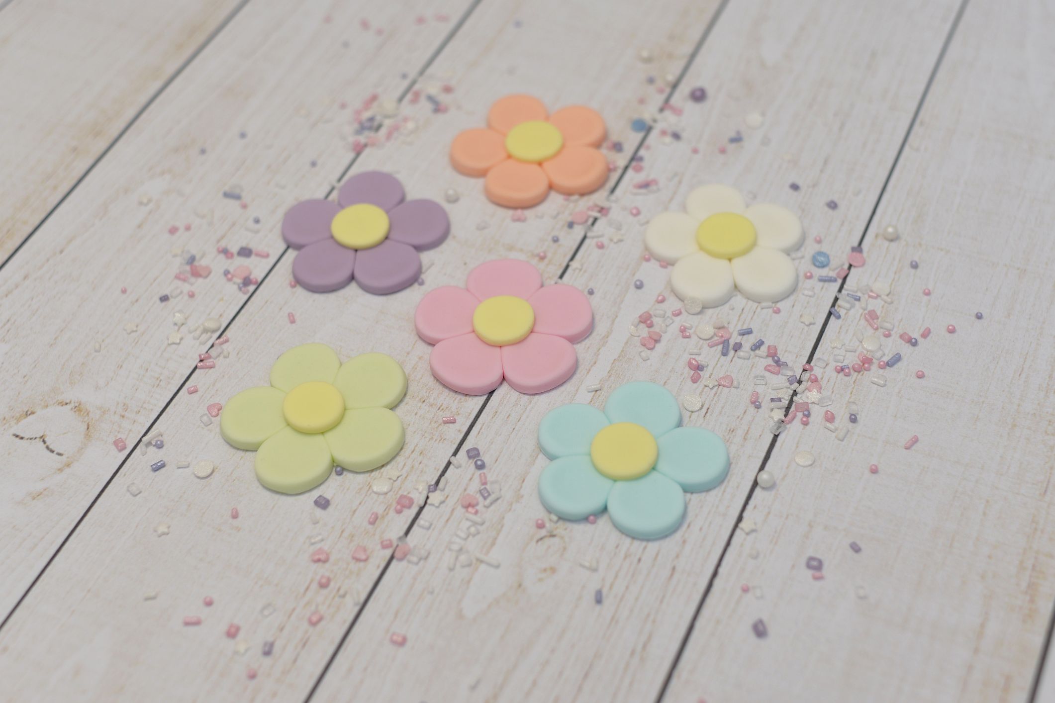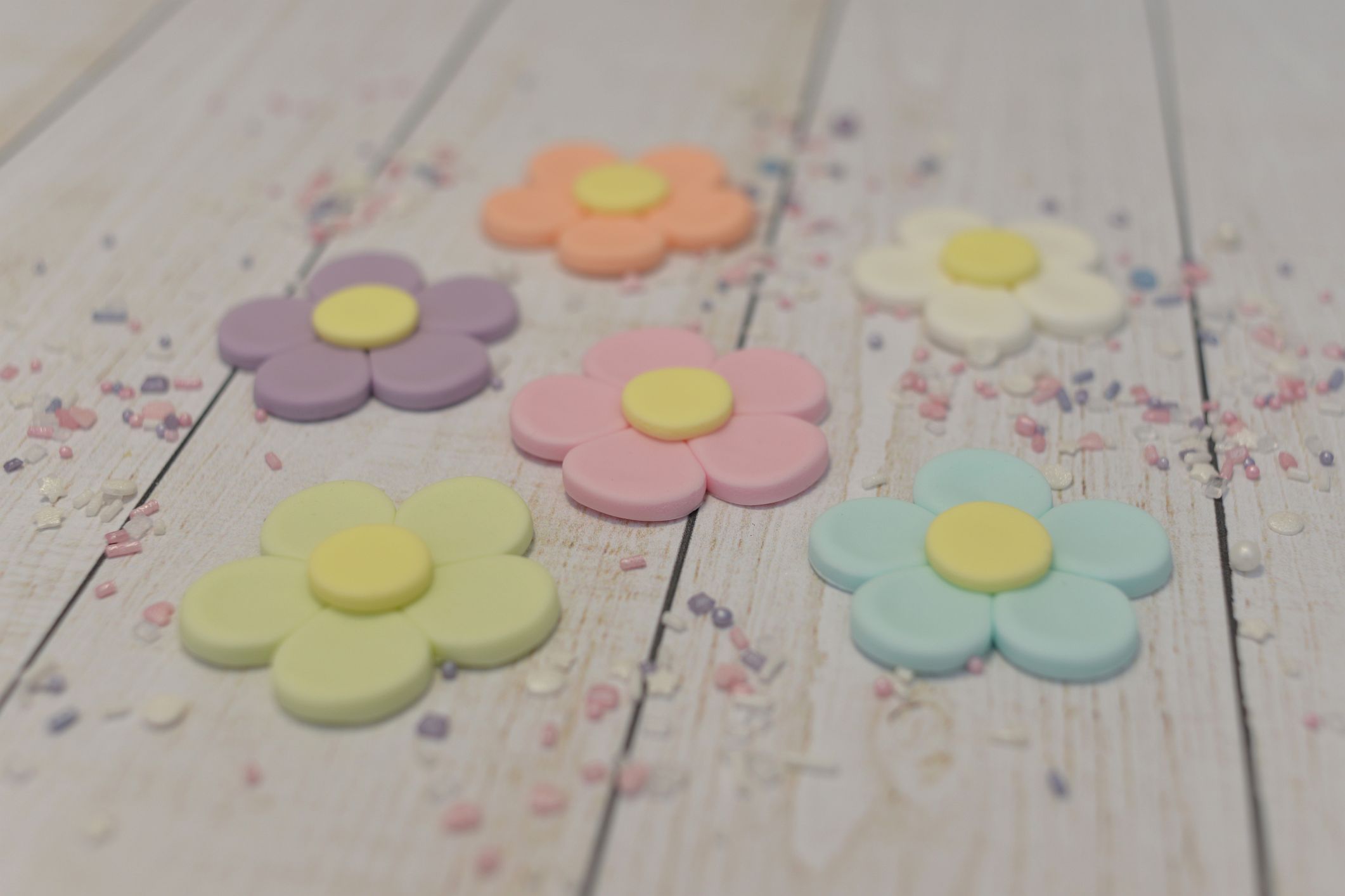 W zestawie 6 szt kwiatków w różnych pastelowych kolorach. Idealnie sprawdzą się jako np. uzupełnienie dekoracji tortu urodzinowego, lub babeczek