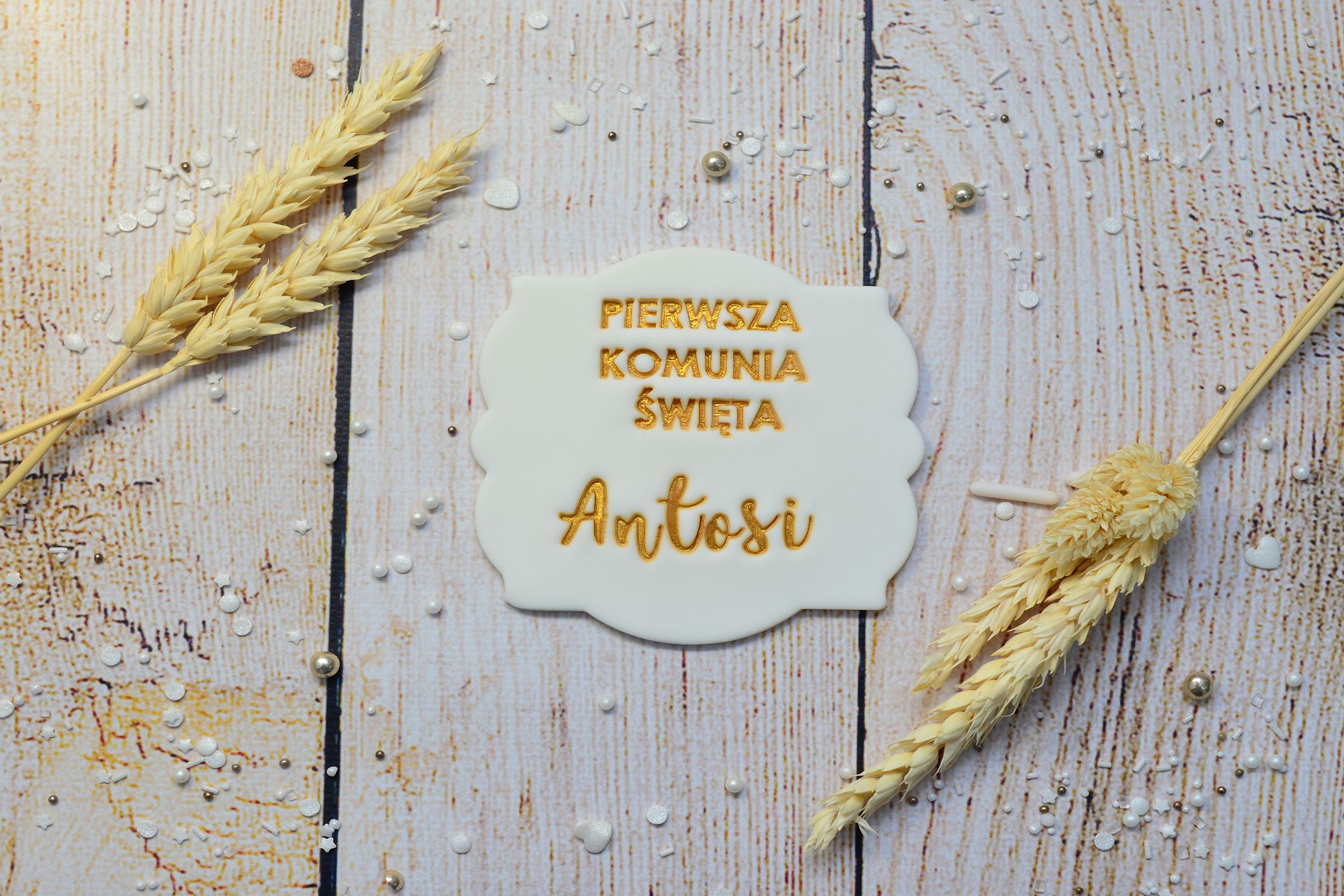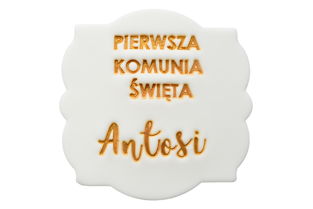 Elegancka dekoracja komunijna z napisem „Pierwsza Komunia Święta” oraz imieniem dziecka to wyjątkowa ozdoba tortu na tę ważną uroczystość. Złoty napis pięknie kontrastuje z jasnym tłem, tworząc klasyczną i bardzo elegancką kompozycję.