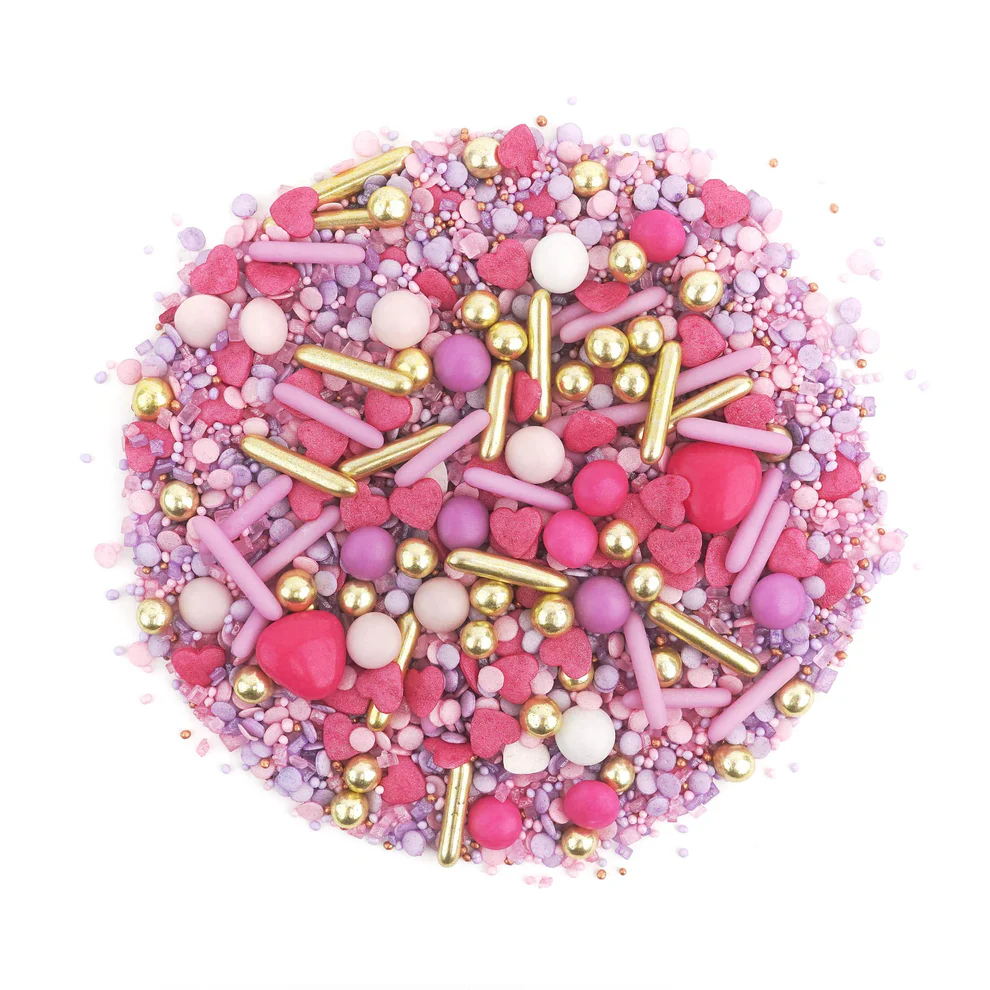 RENDEZVOUS to prawdziwa definicja romantyzmu. Idealnie sprawdzi się jako akcent na walentynkowych deserach, urodzinowych babeczkach czy torcie dla ukochanej osoby. Połączenie różu, delikatnego fioletu i klasycznego złota, uzupełnione o konfetti w kształcie serduszek, tworzy kompozycję, która mówi sama za siebie – słodka miłość. 💖
