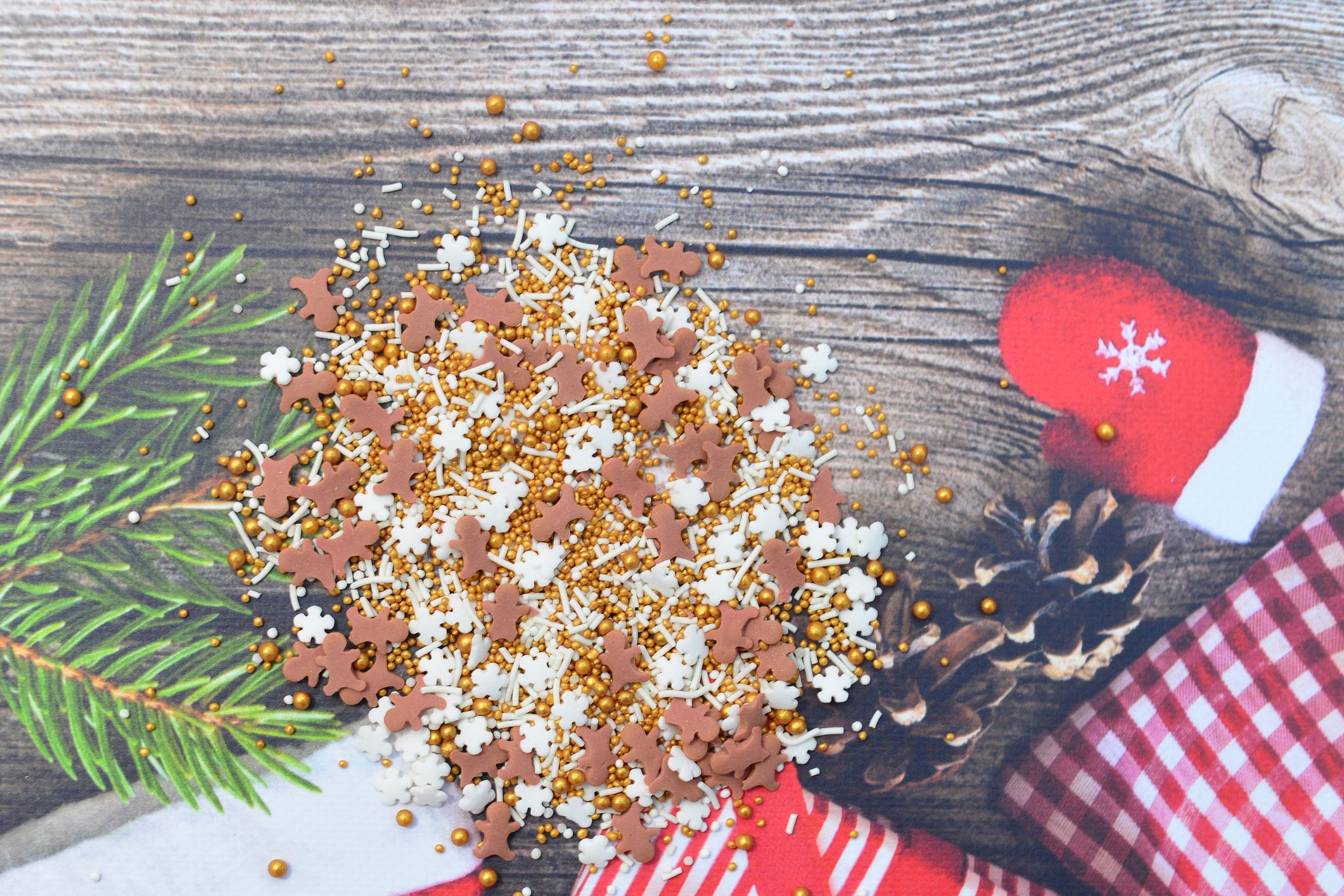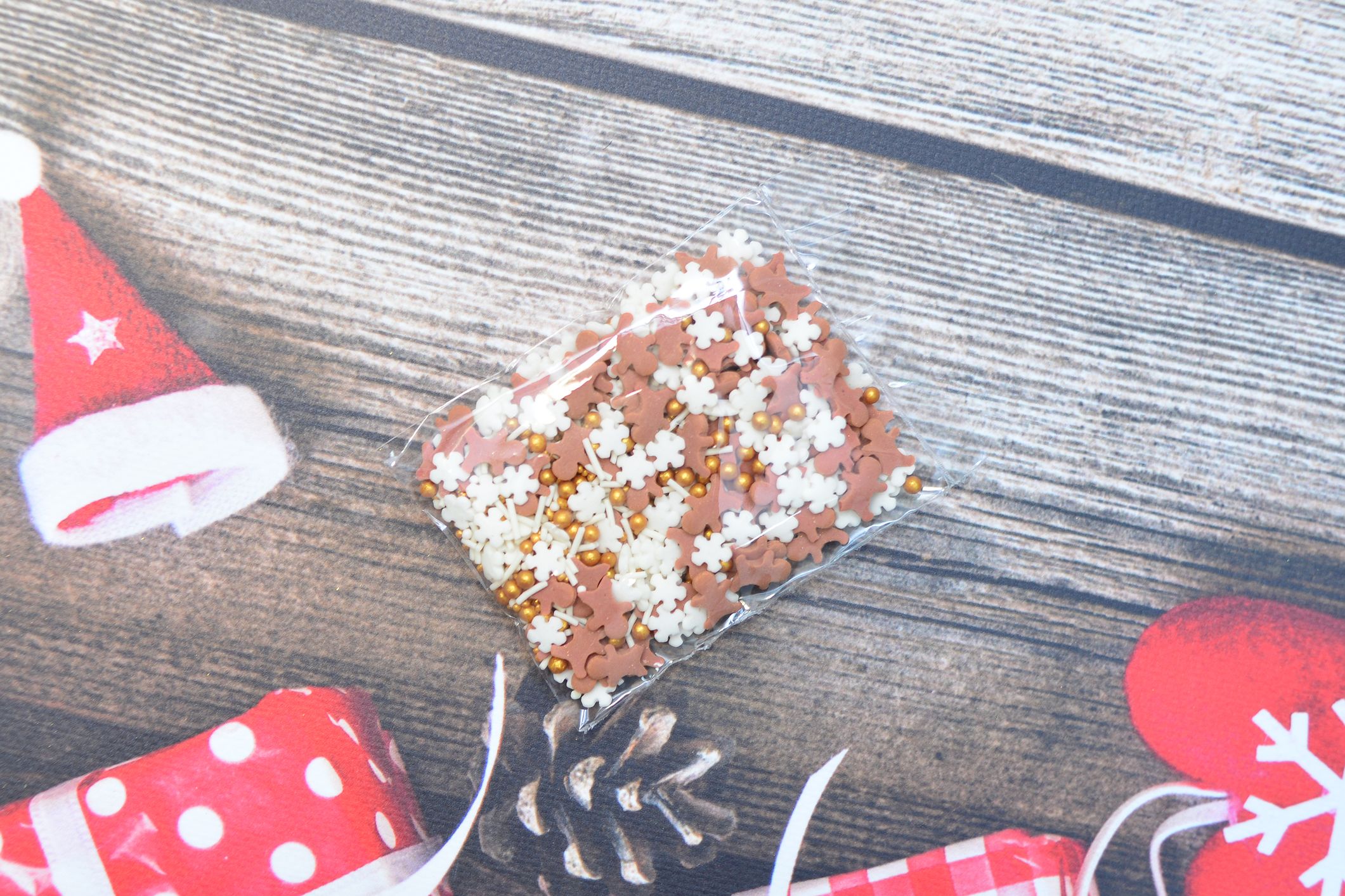 Posypka cukrowa, brązowy ciastek, białe śnieżynki, złote i białe kuleczki, 30g