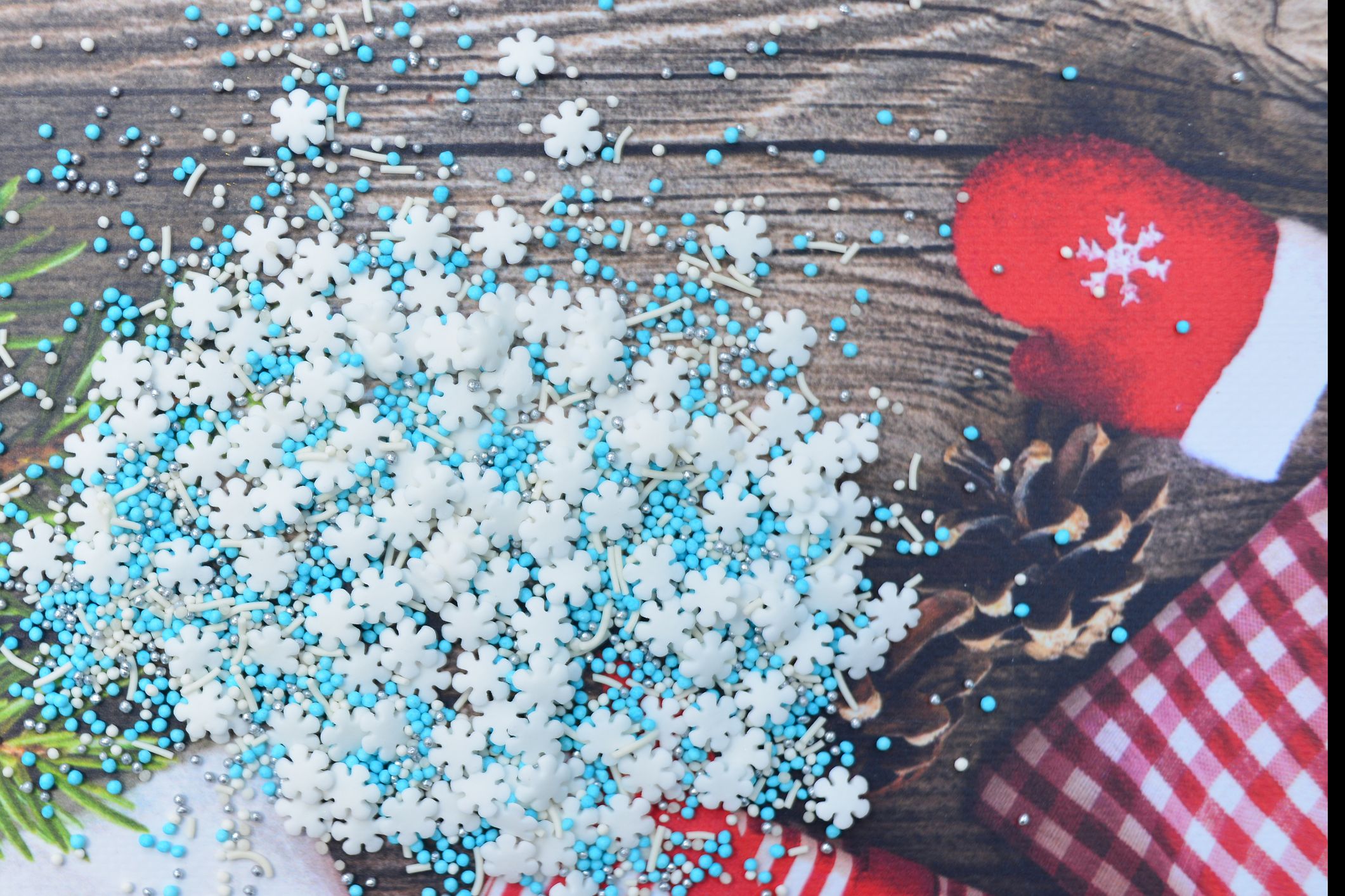 Posypka cukrowa, Płatki śniegu, kuleczki w kolorach niebieskim oraz białym, 30g