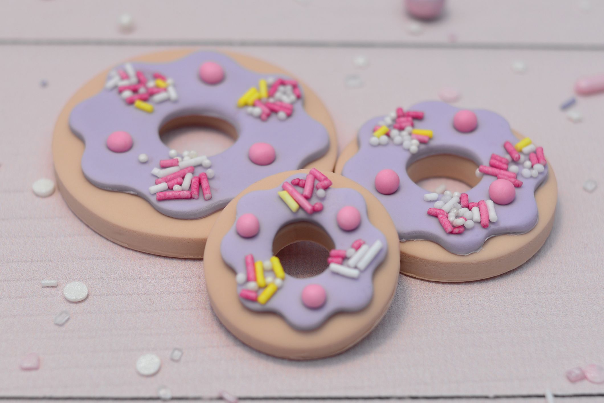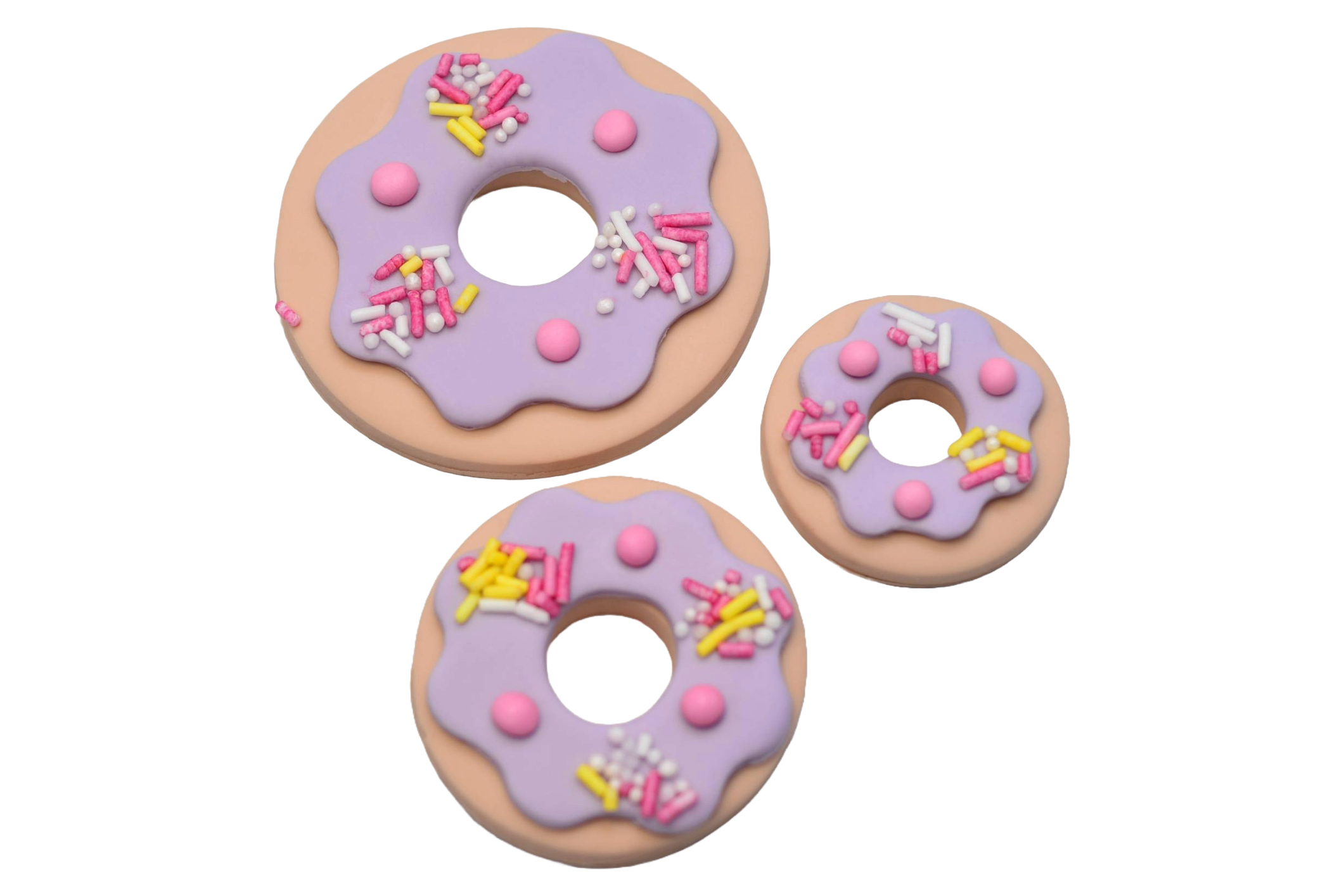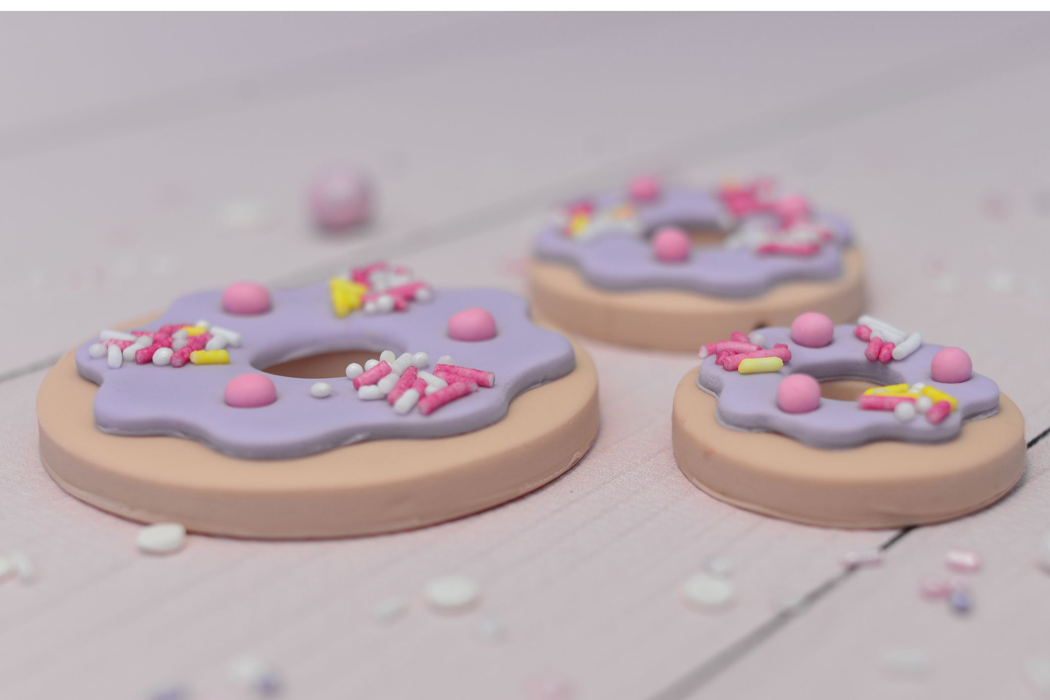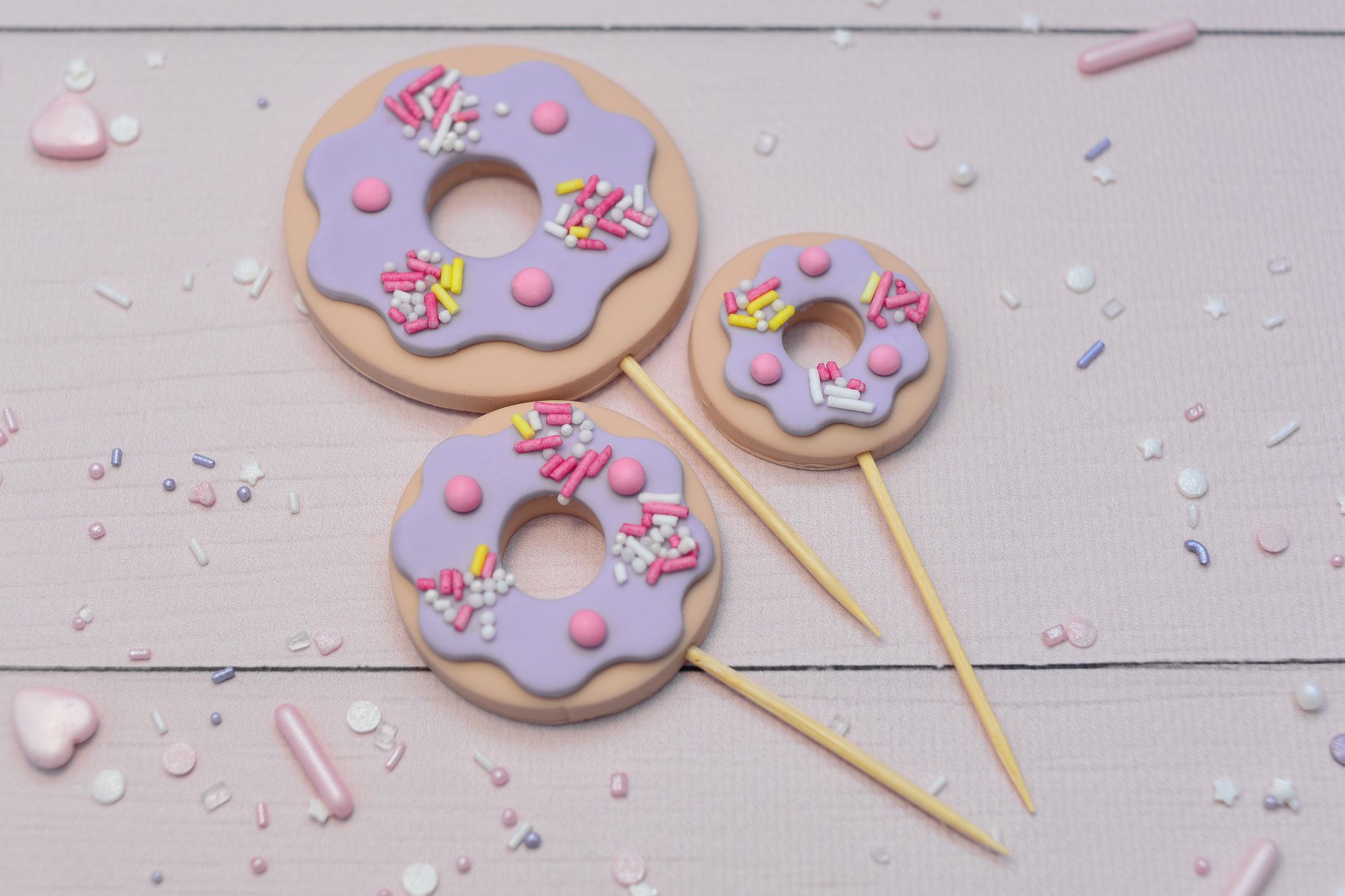 Zestaw „Dziurka w lukrze” to trzy urocze dekoracje w kształcie pączków z kolorową polewą i posypką.
