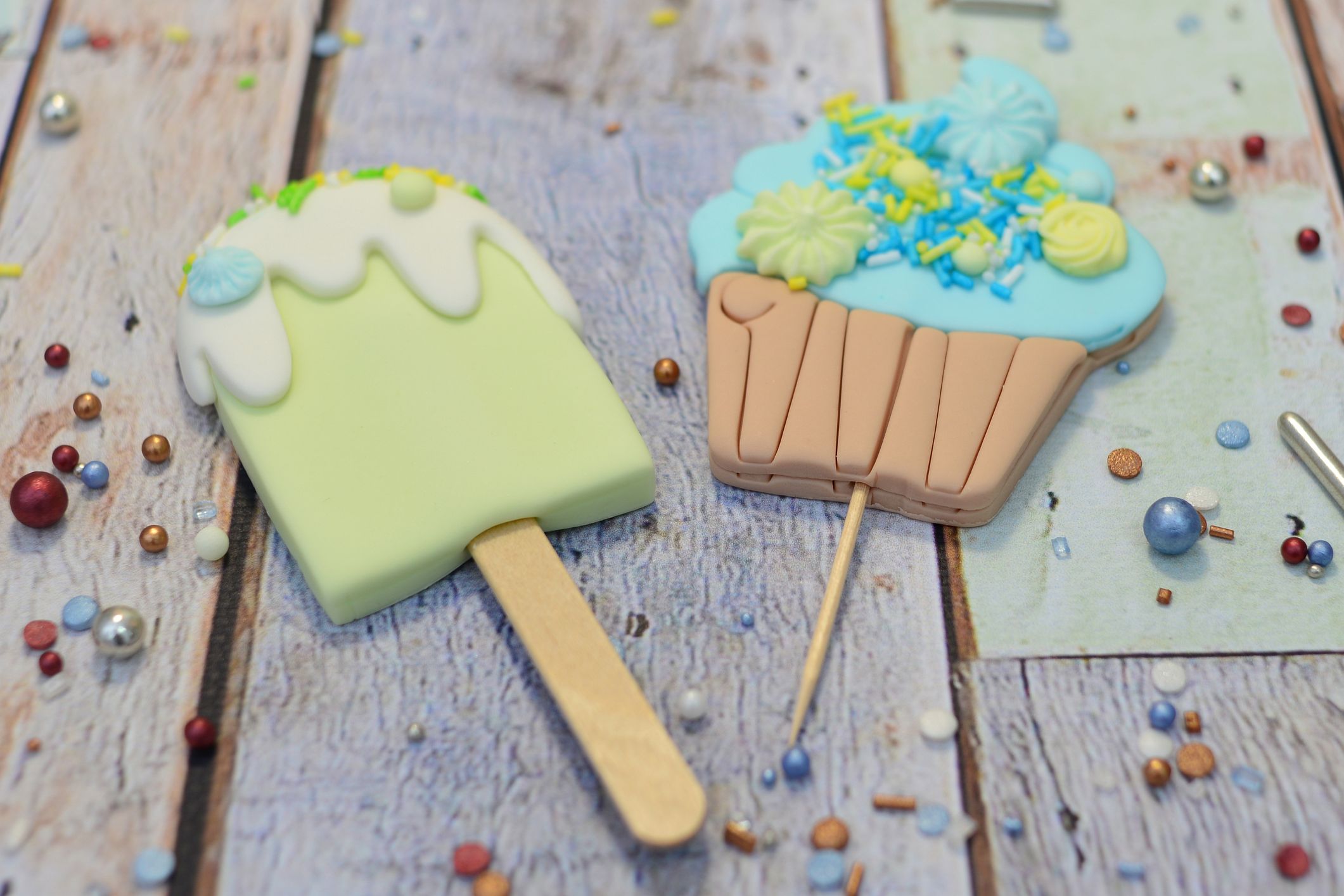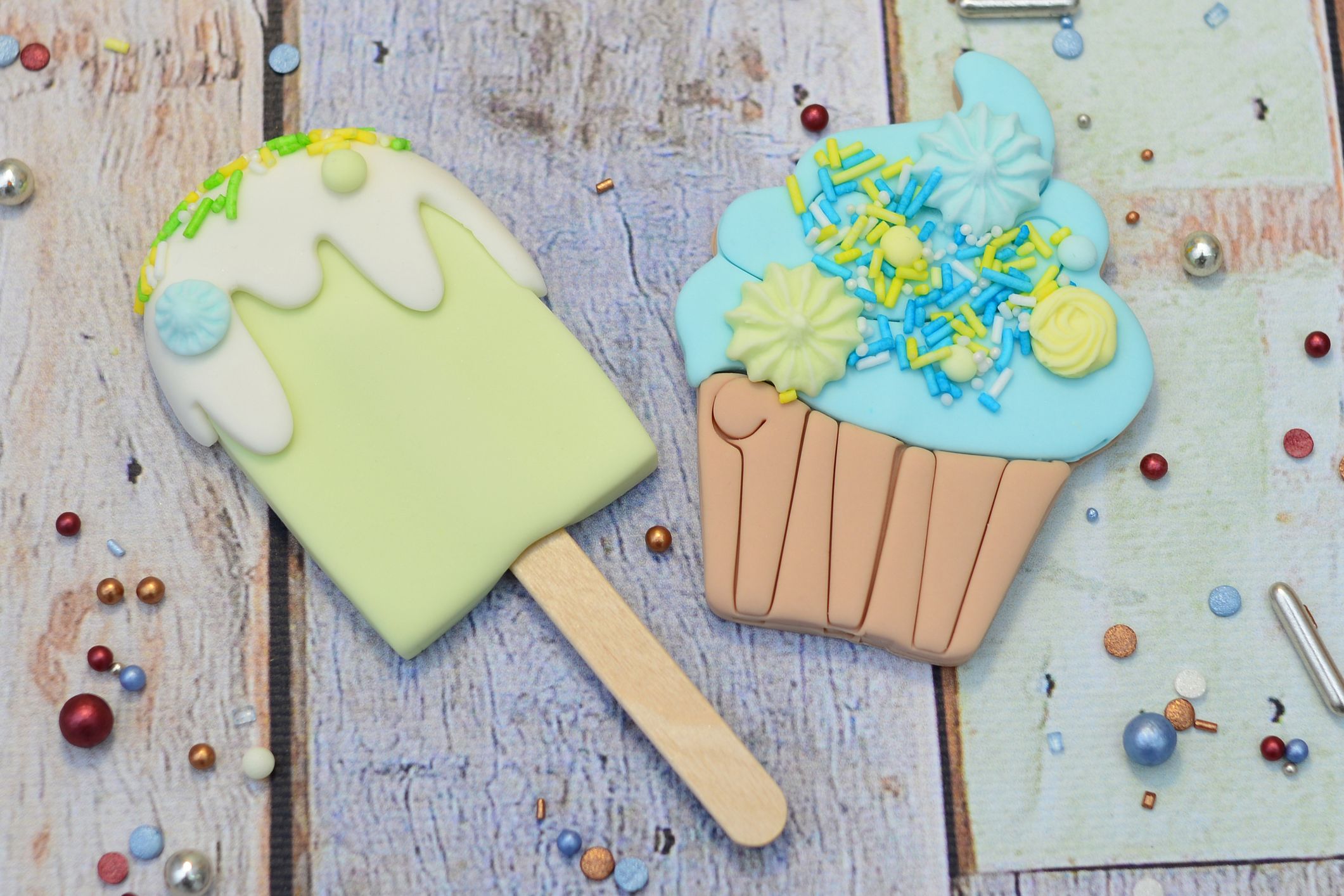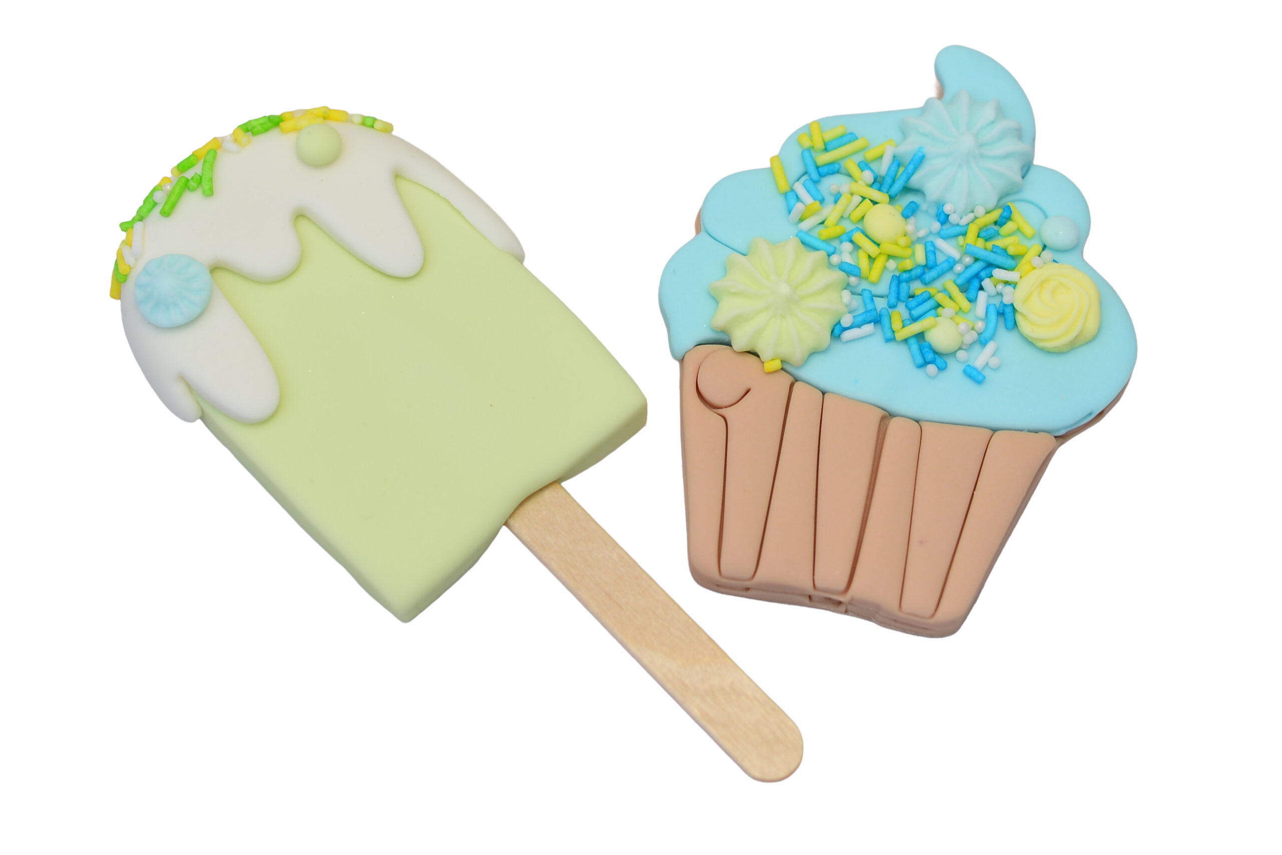 W skład tego uroczego zestawu wchodzą dwie dekoracje – pastelowy lód na patyku i niebieska babeczka z kremem, ozdobione słodką posypką w kolorach błękitu, mięty i cytrynowej żółci.