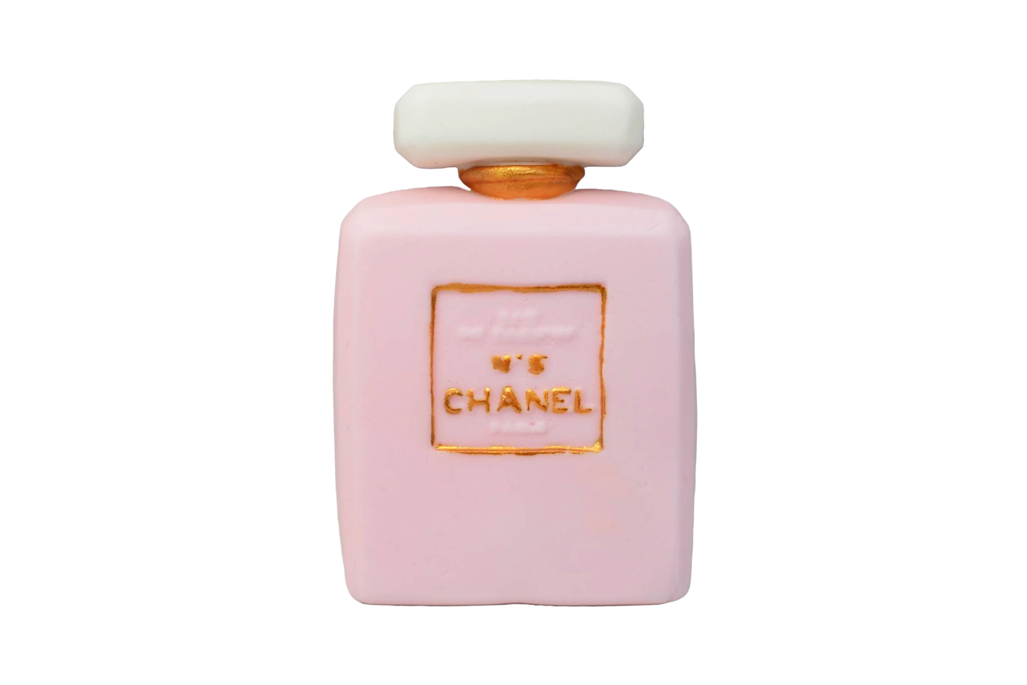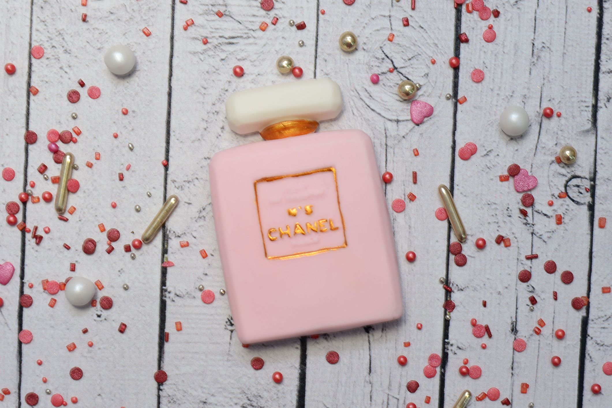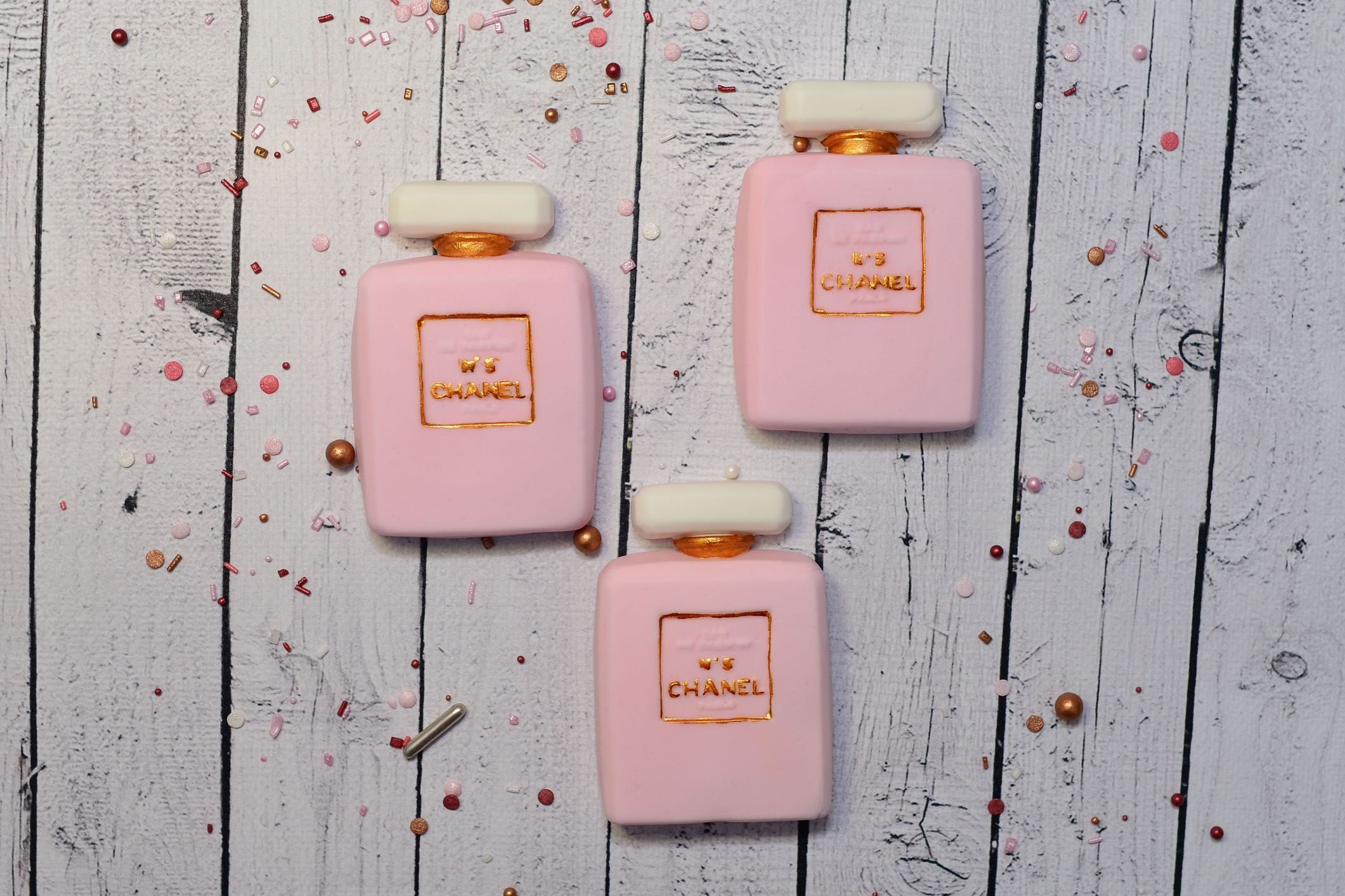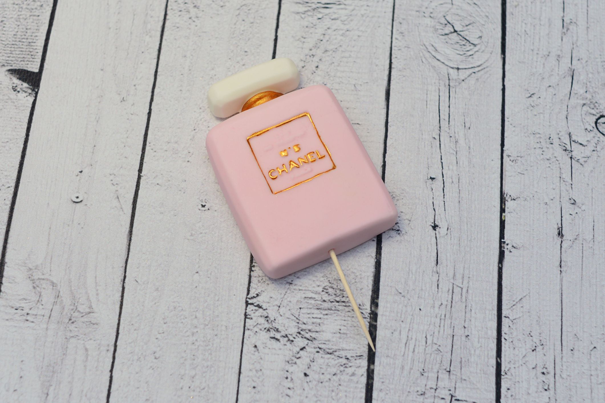 Dekoracja z masy cukrowej, różowe perfumy. Prosty i elegancki wzór sprawia, że dekoracja dobrze prezentuje się na tortach urodzinowych i tematycznych.