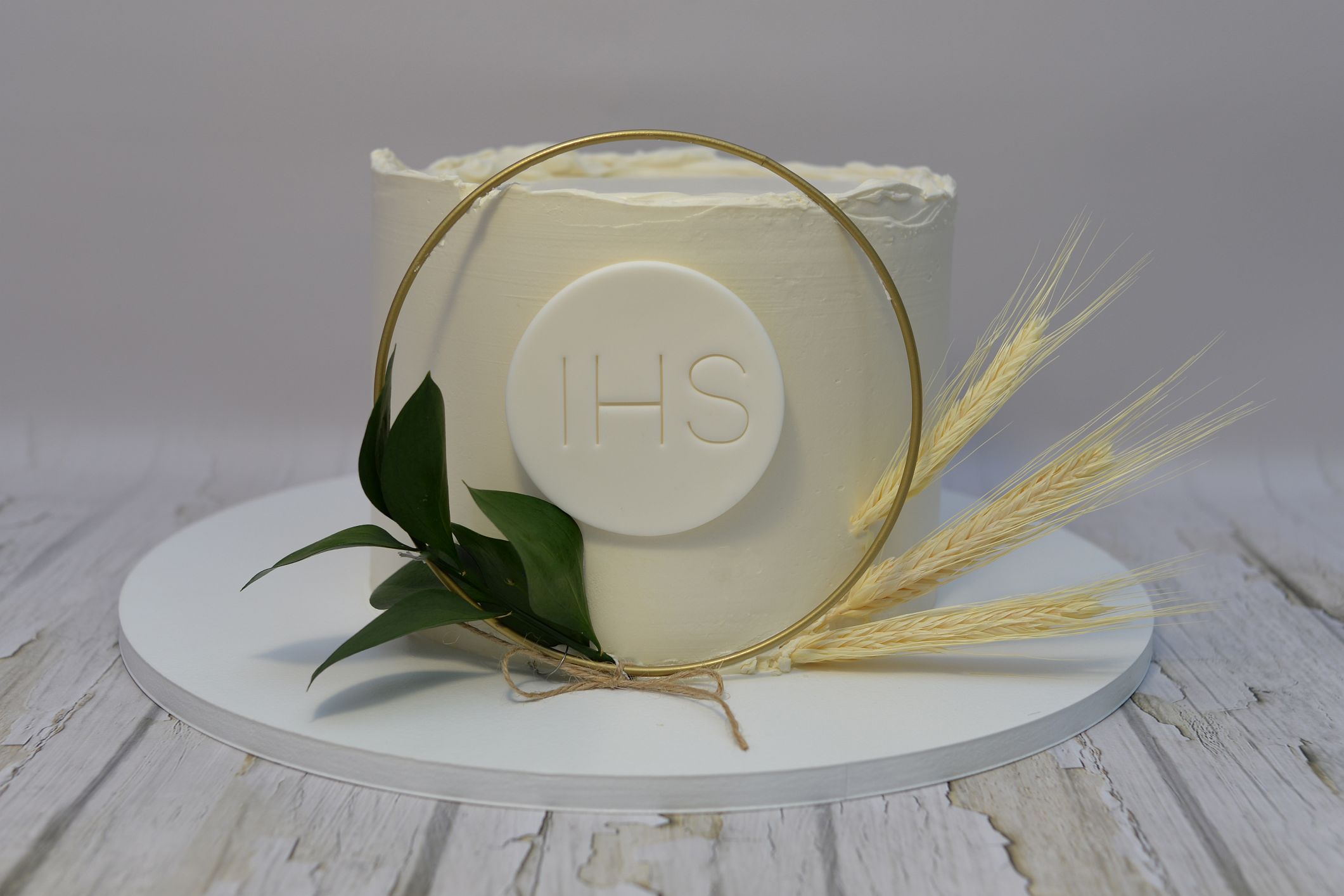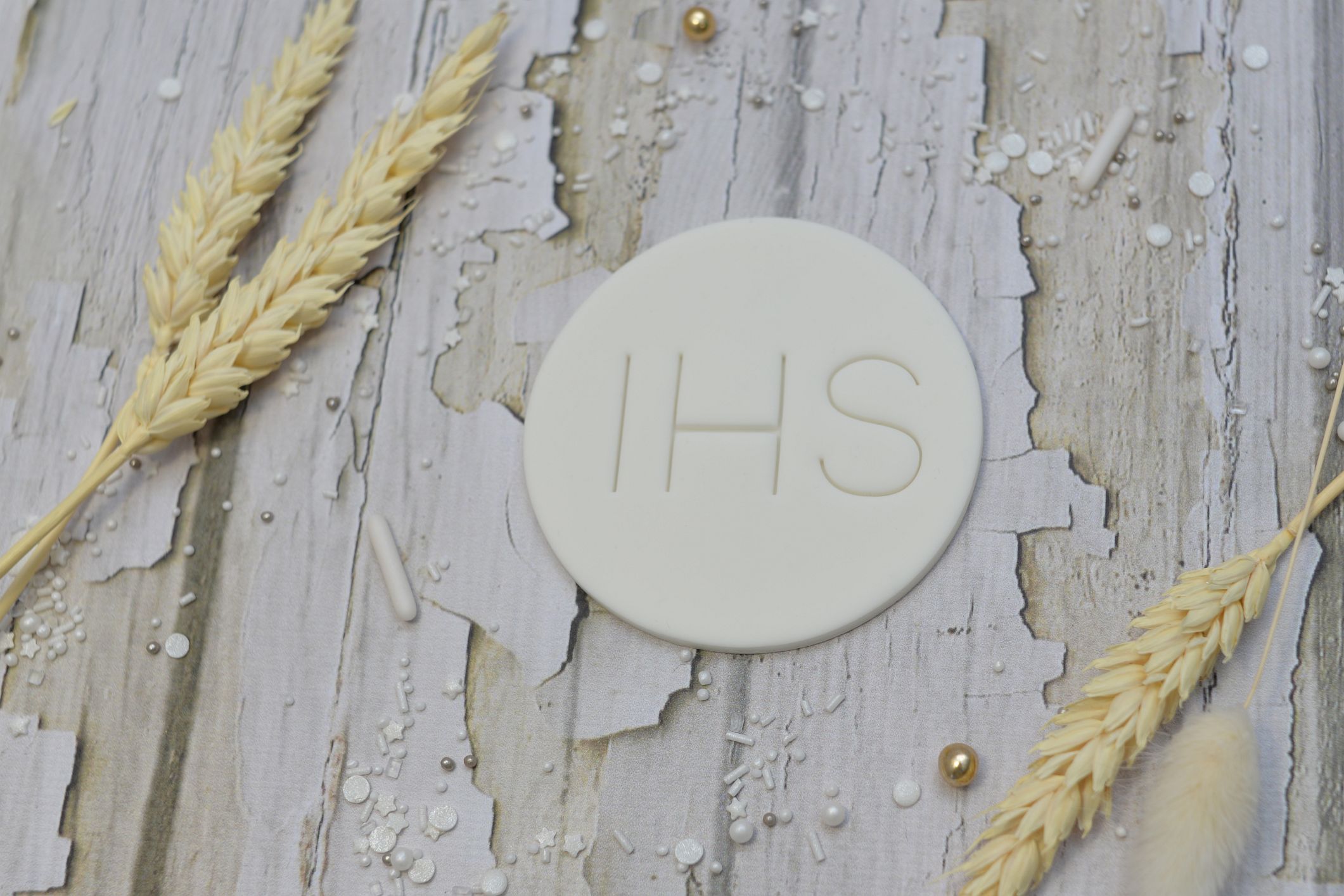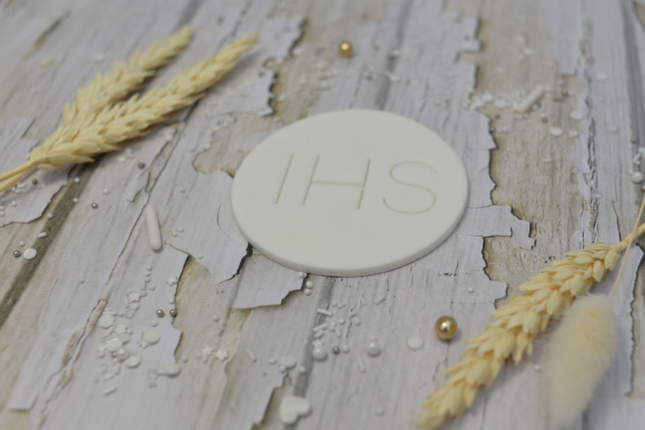 Ręcznie wykonana dekoracja z symbolem IHS to subtelna i elegancka ozdoba tortu komunijnego. Minimalistyczny napis umieszczony na jasnym, delikatnym tle nadaje dekoracji klasyczny i ponadczasowy charakter, doskonale podkreślając wyjątkowość uroczystości.